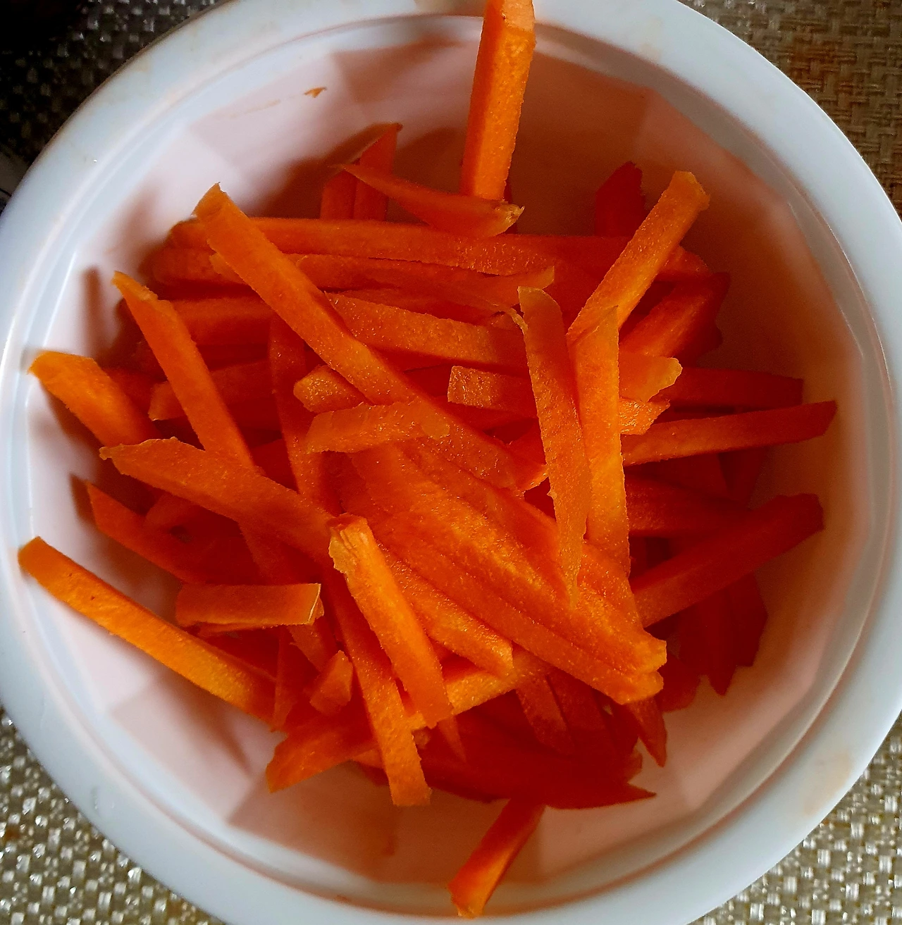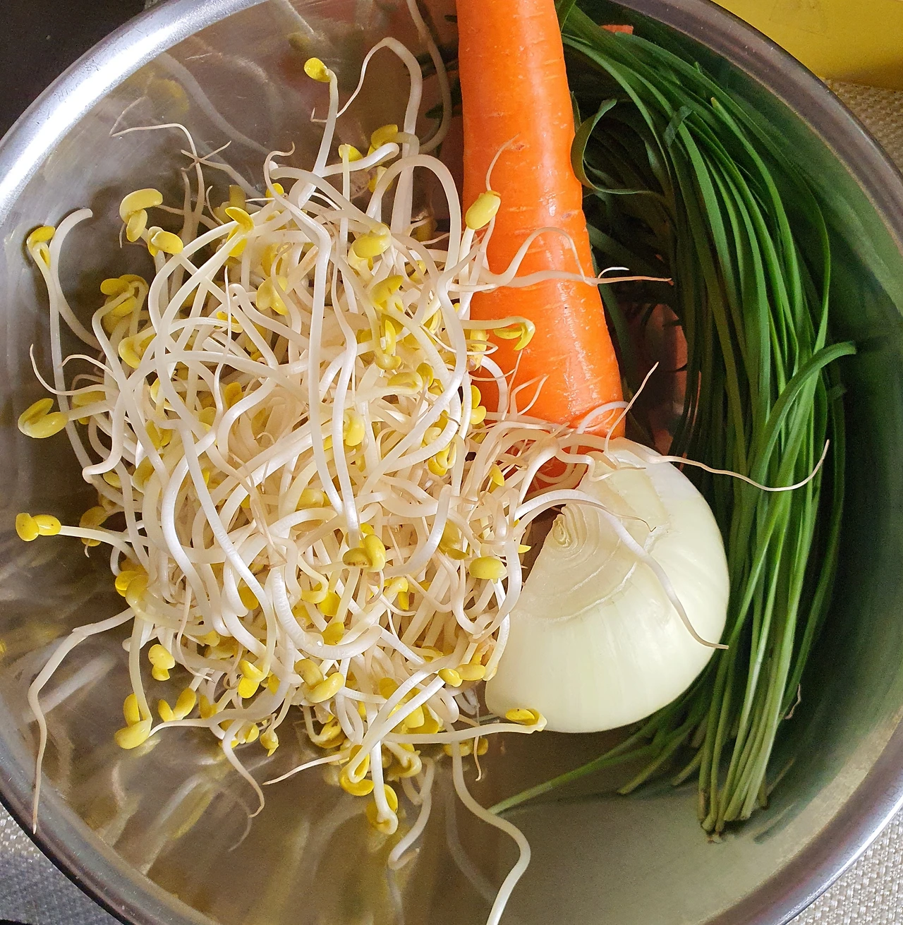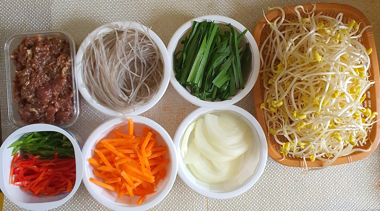 ■ 재료 : 소불고기 ½컵. 콩나물 2줌. 당근 조금. 당면 1줌. 양파 ½개. 부추 조금. 청고추 3개. 홍고추 2개. 달걀 1개. 참기름 1큰술. 통깨 조금. 올리브유 2큰술