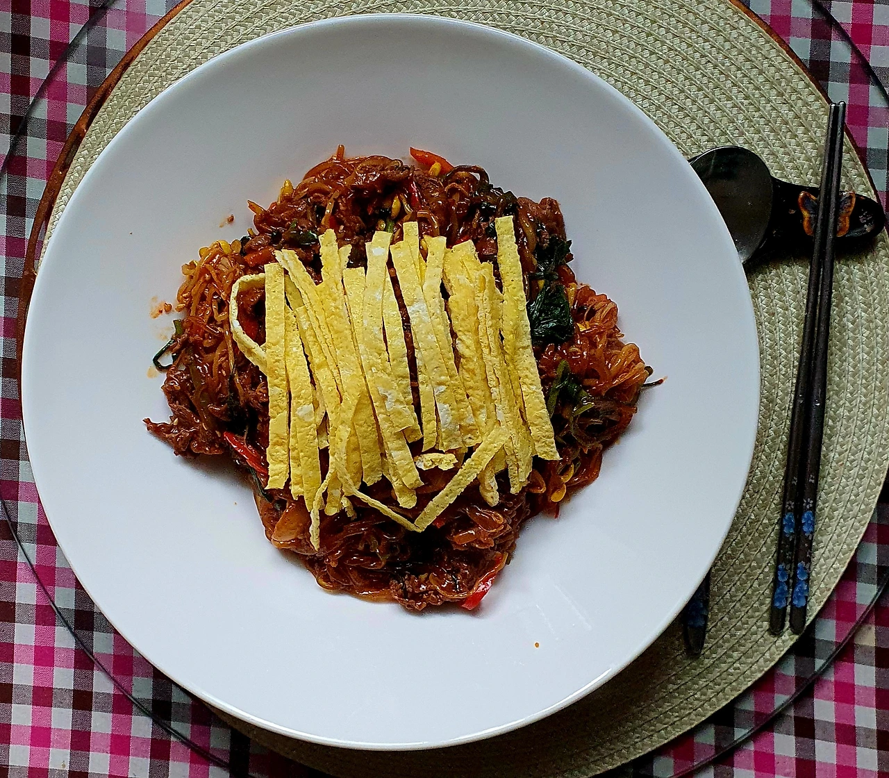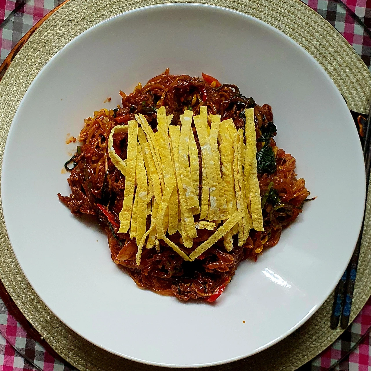 • 완성 용기에 밥을 올리고 잡채로 덮고 달걀지단을 올려주면 화끈하게 매운 잡채밥 완성. 잘 섞어가며 먹으면 입술까지 얼얼하며 맛있는 매운맛!