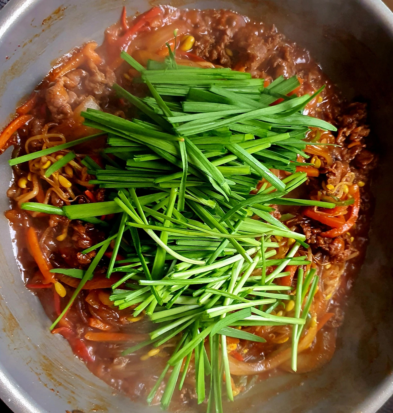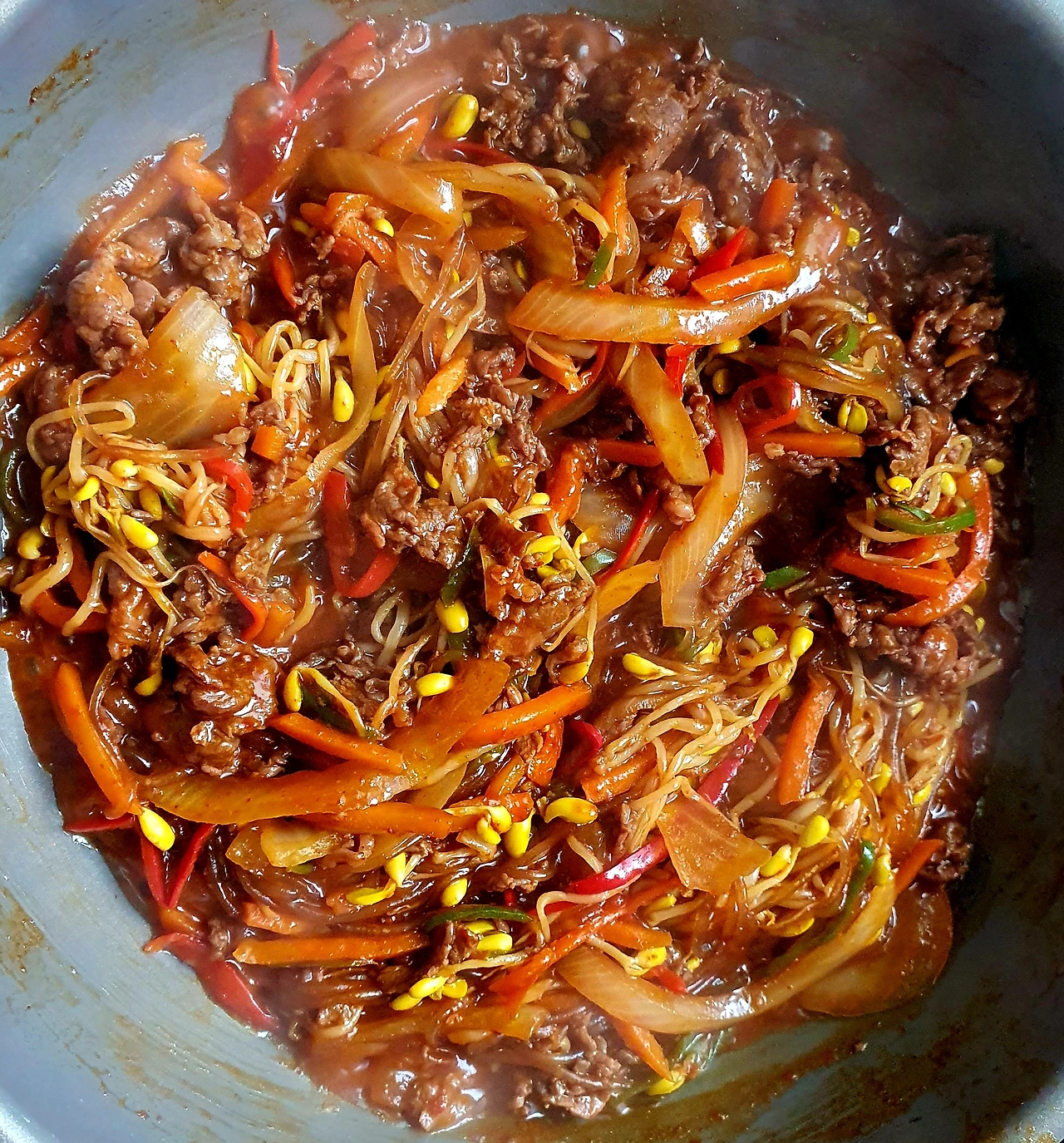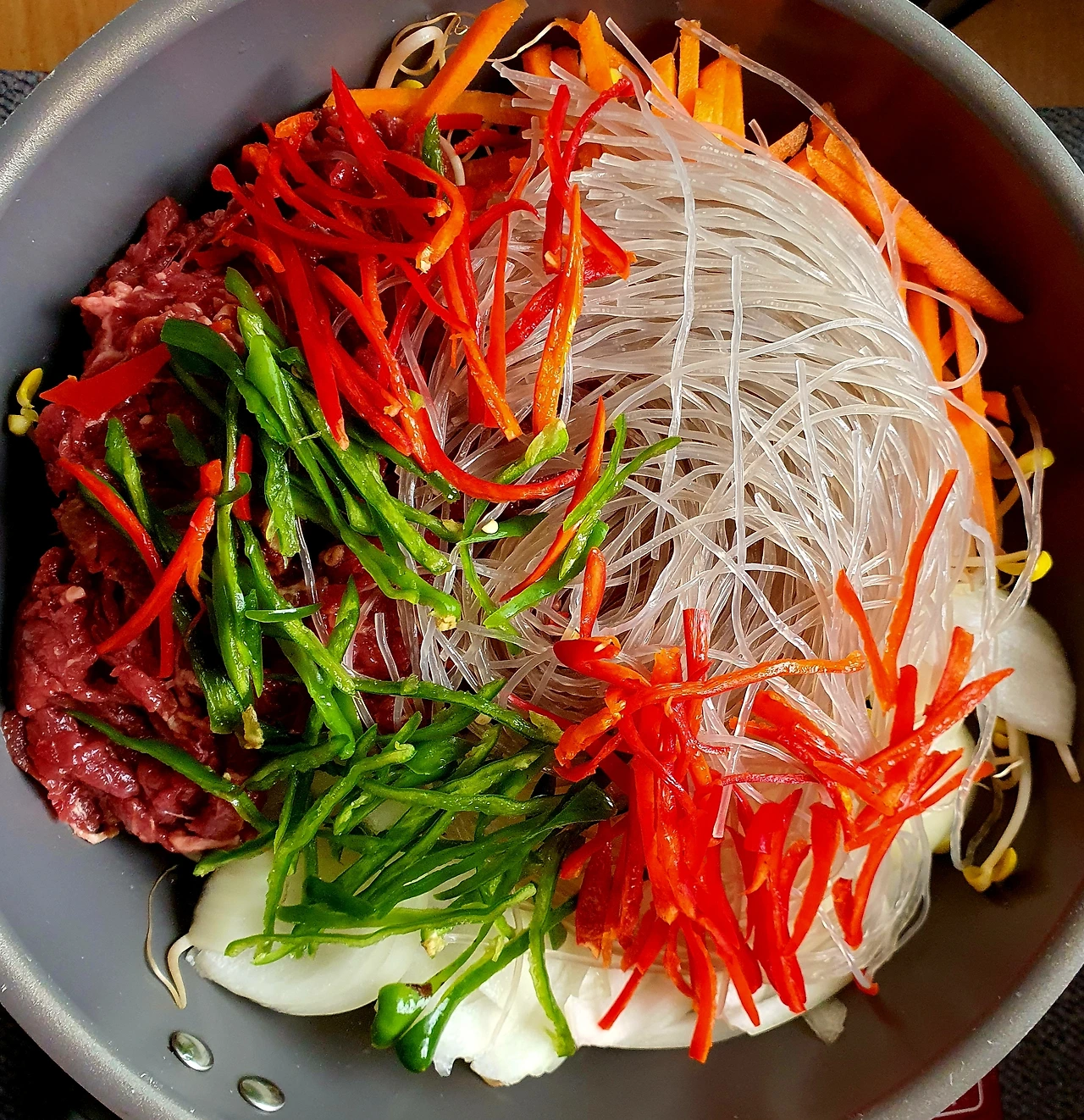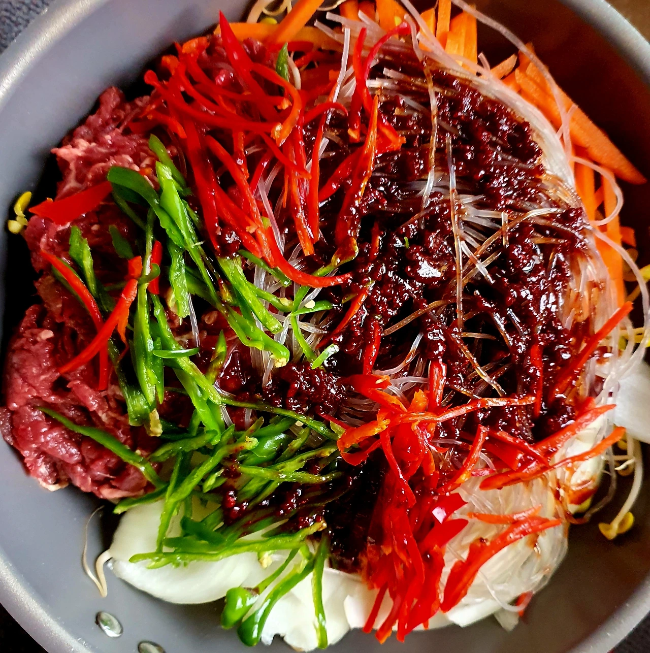 • 뚜껑이 있는 웍에 올리브유를 두르고 바닥에 콩나물을 깔고 위에 양파와 당근. 소고기. 고추. 당면을 올리고 위에 양념장을 뿌려준 다음 뚜껑을 덮고 중 약불에서 10분 정도 익혀준다.