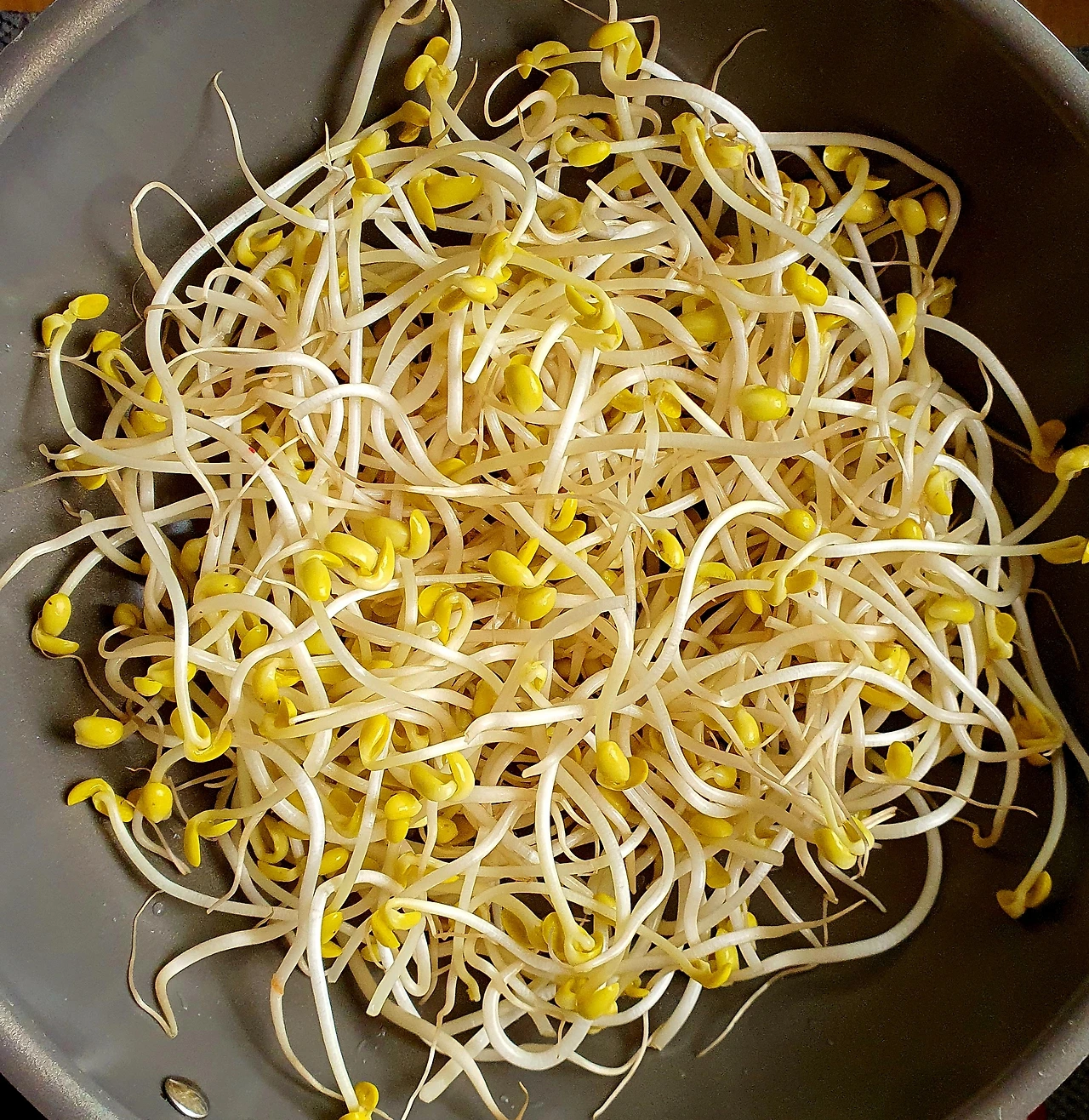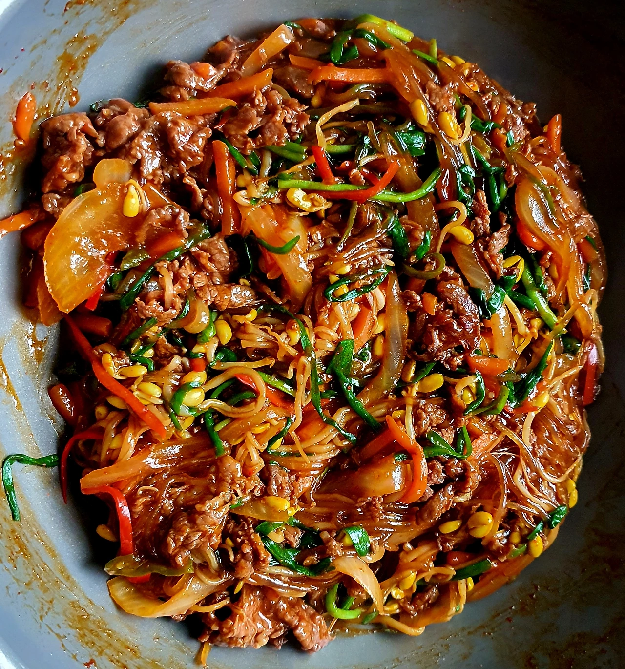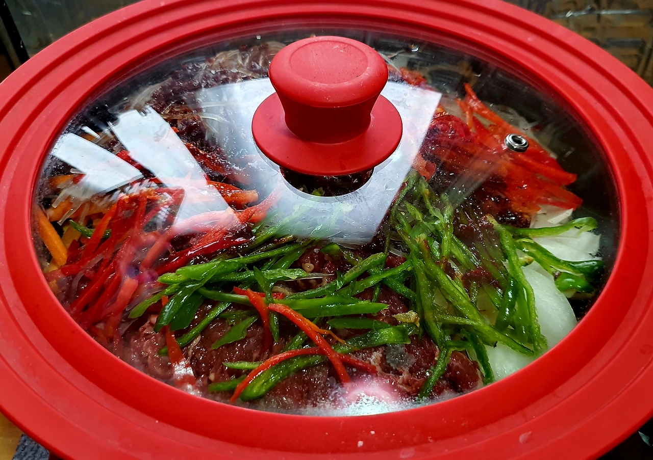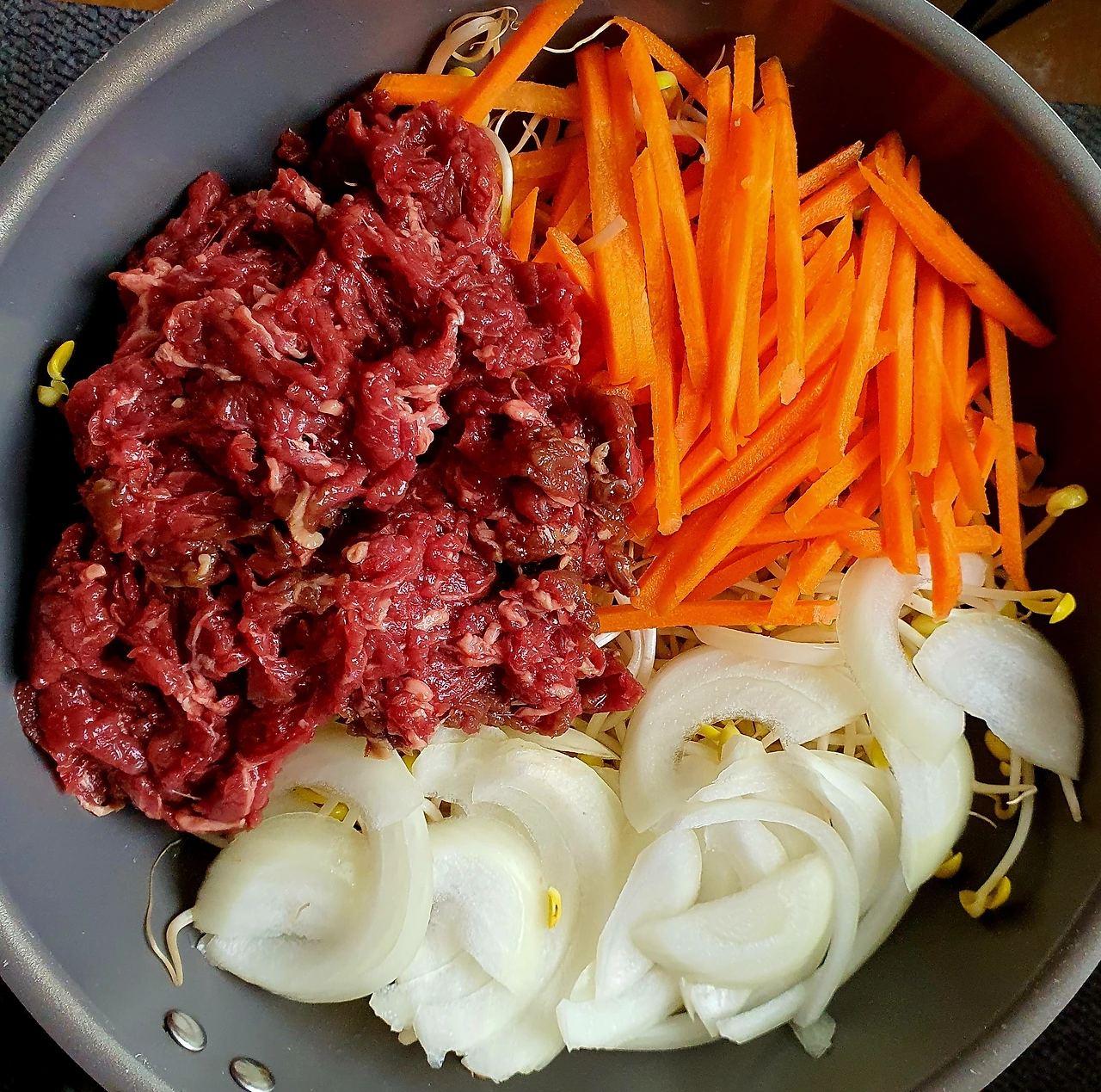 • 뚜껑이 있는 웍에 올리브유를 두르고 바닥에 콩나물을 깔고 위에 양파와 당근. 소고기. 고추. 당면을 올리고 위에 양념장을 뿌려준 다음 뚜껑을 덮고 중 약불에서 10분 정도 익혀준다.
