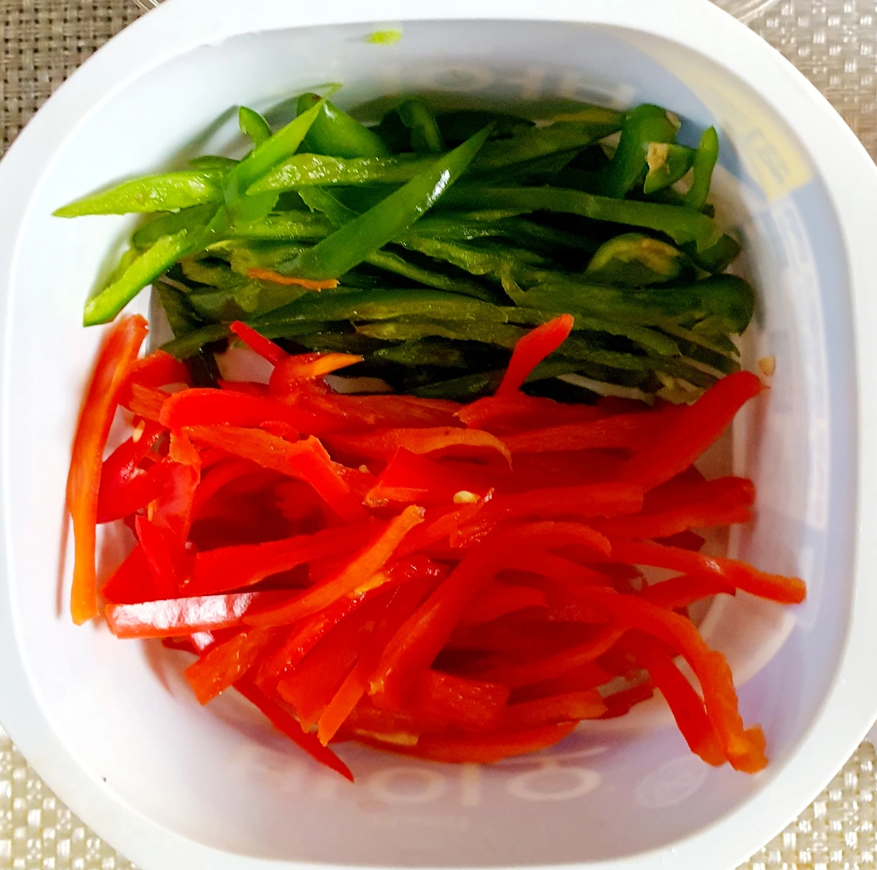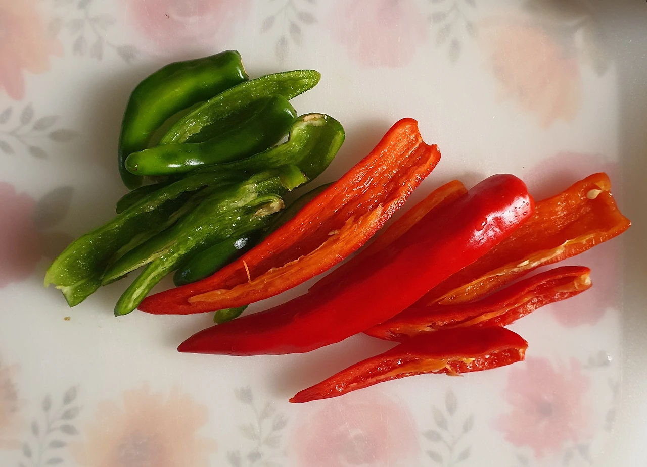 • 콩나물을 씻어 채에 받쳐 물기를 빼주고, 당근과 양파는 채를 썰어 준비한다. 청. 홍고추도 채를 썰어 준비한다.