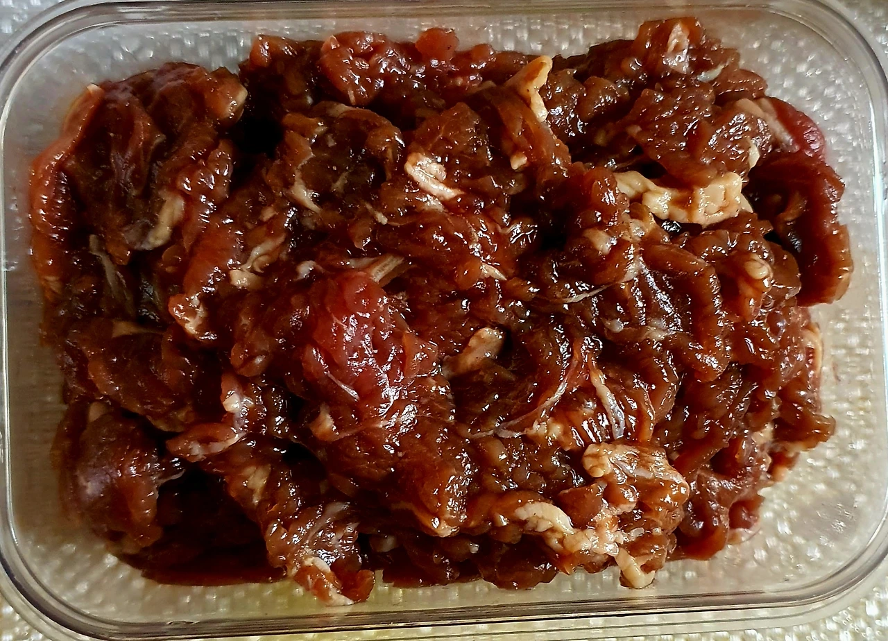 • 소고기 불고기감은 간장, 굴소스, 맛술, 설탕, 참치액을 넣고 버무려둔다.
