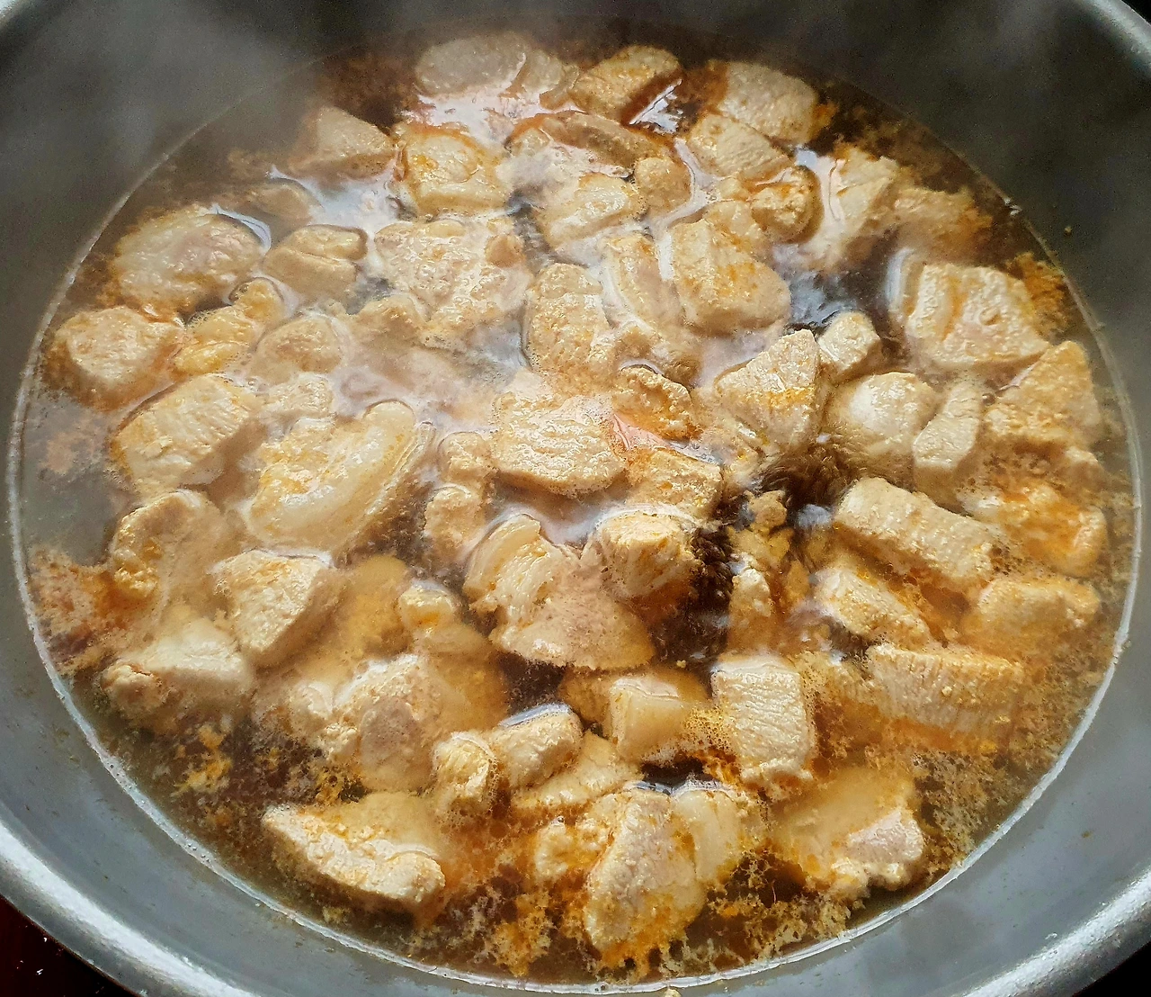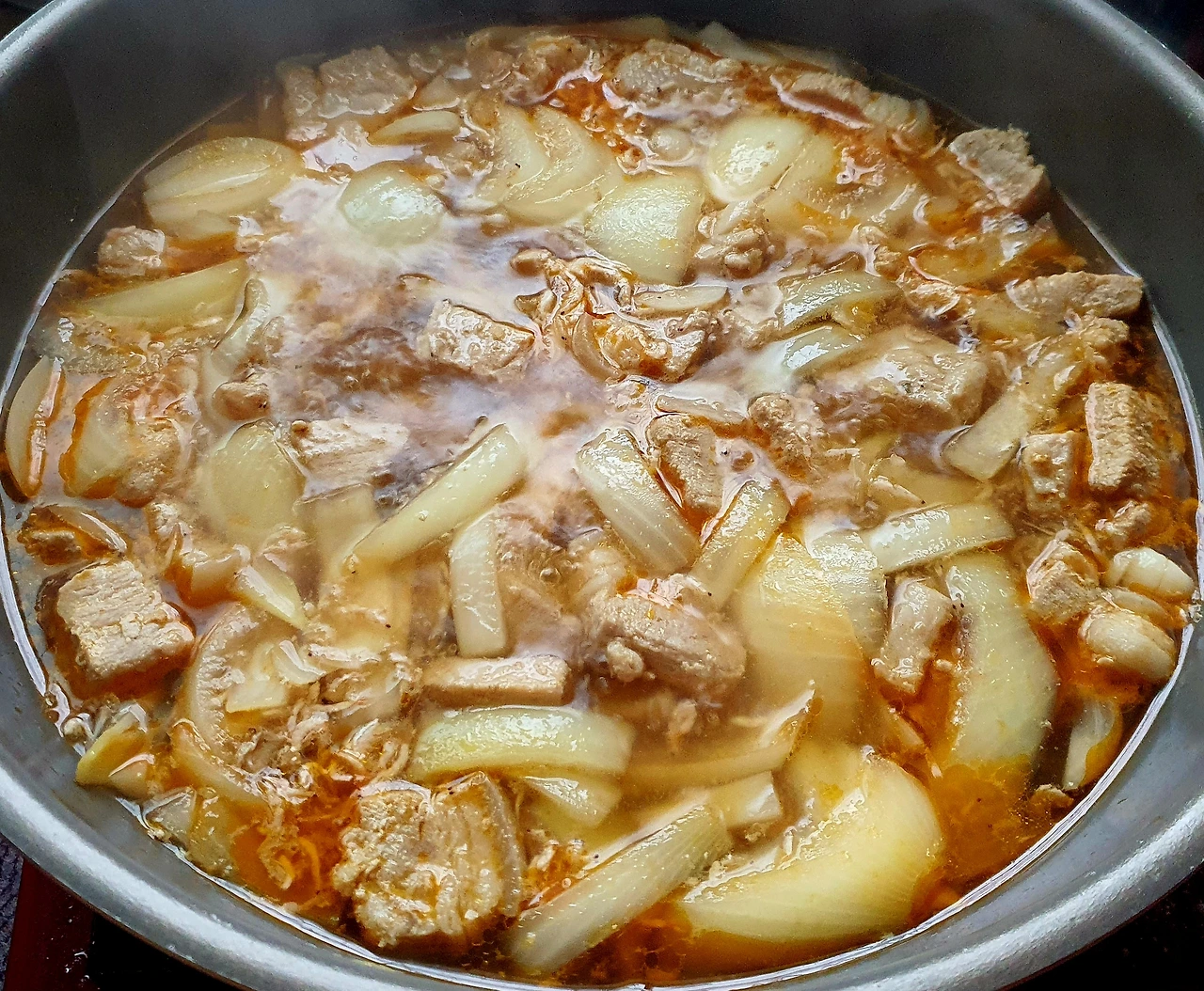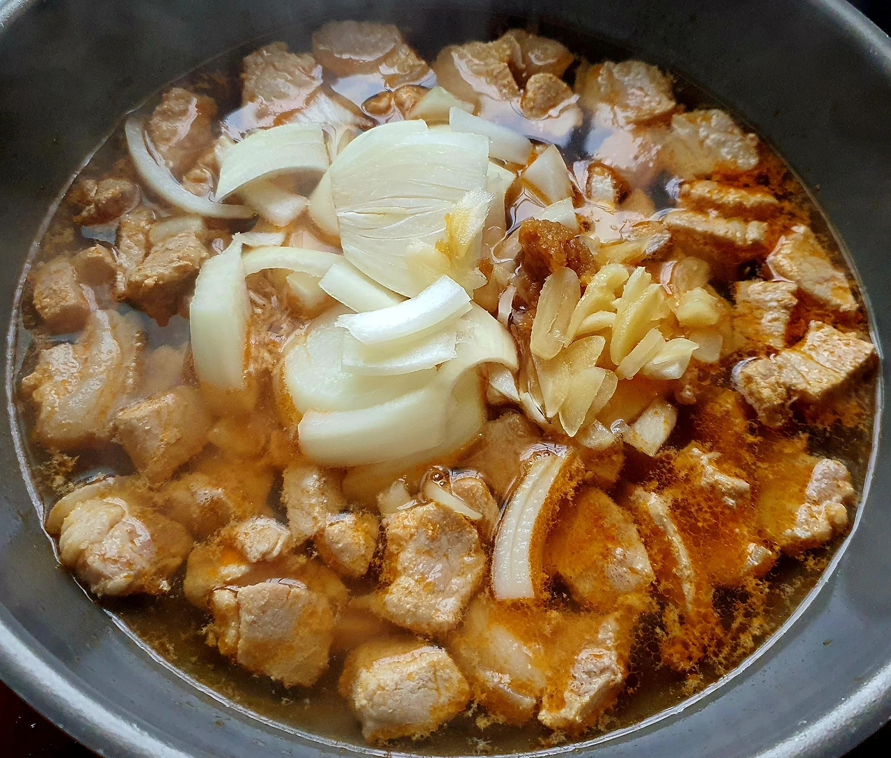• 돼지고기가 거의 익으면 새우젓으로 간을 맞추고, 양파 · 생강청. 다진 마늘을 넣어 한소끔 끓인다. 처음부터 새우젓을 많이 넣지 말고 간을 보면서 추가해 준다.