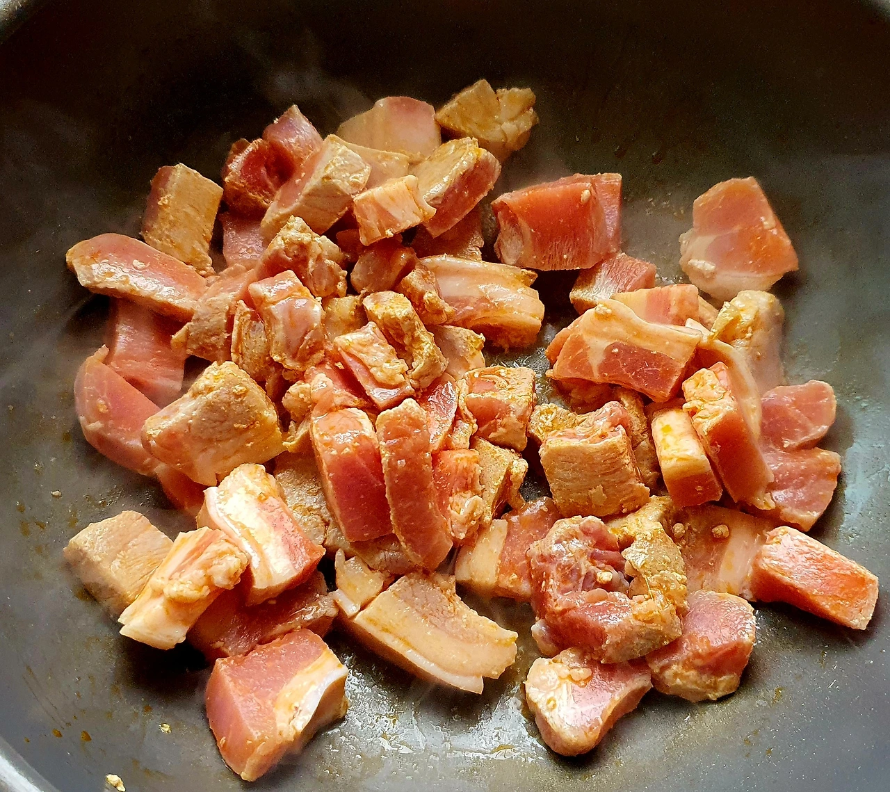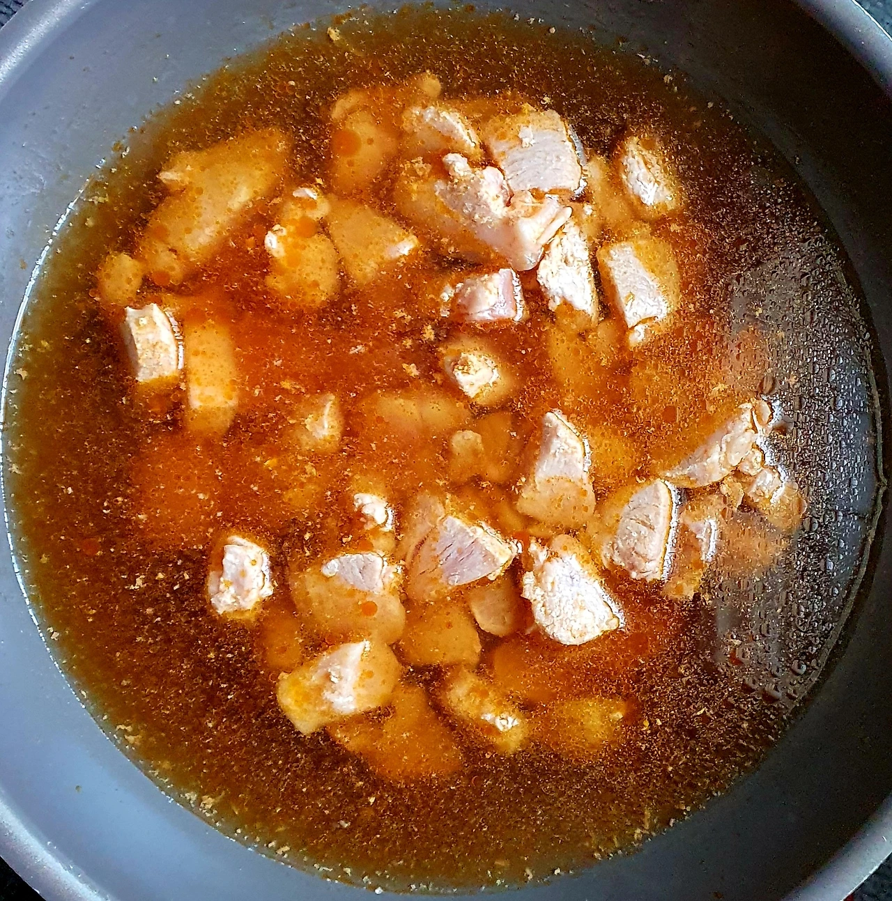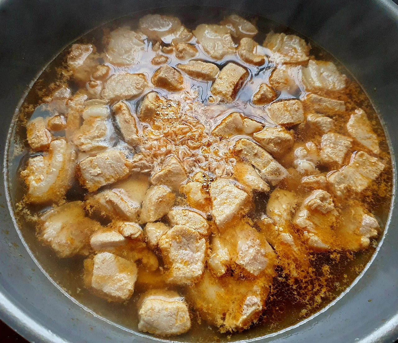 • 돼지고기가 거의 익으면 새우젓으로 간을 맞추고, 양파 · 생강청. 다진 마늘을 넣어 한소끔 끓인다. 처음부터 새우젓을 많이 넣지 말고 간을 보면서 추가해 준다.