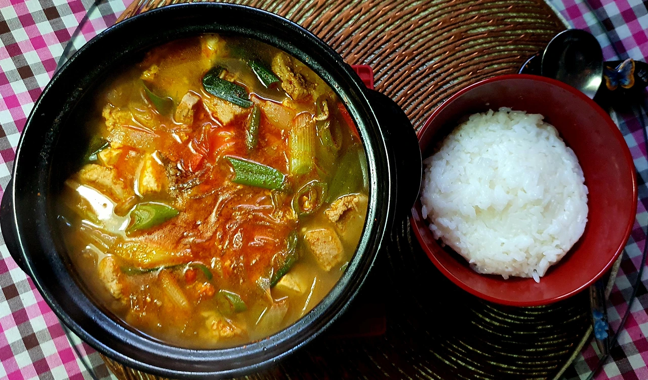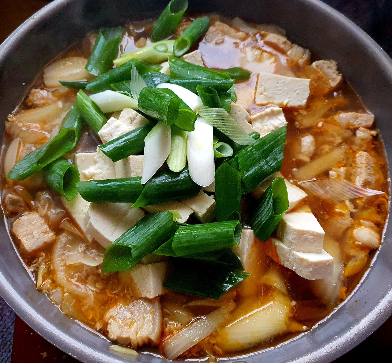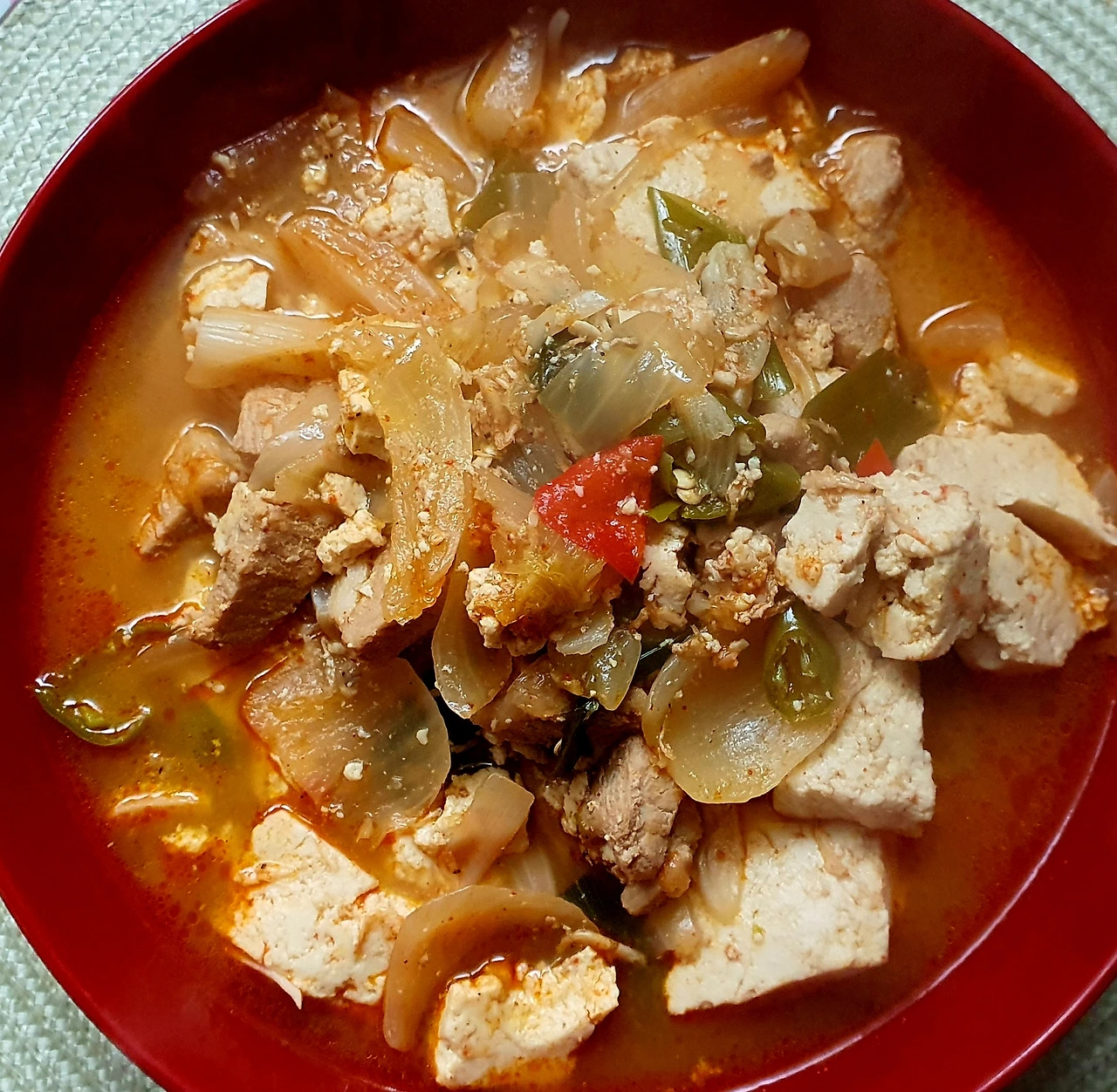 ■ 재료 : 돼지고기 1컵, 두부 ½모, 대파 1대· 양파 ½개, 청양고추 2개, 다진 마늘 1큰술, 새우젓 1큰술, 고춧가루 1큰술, 생강청 ½큰술. 육수 4컵