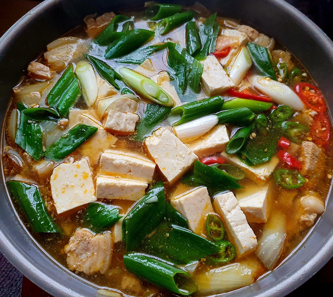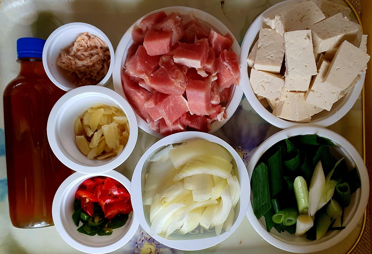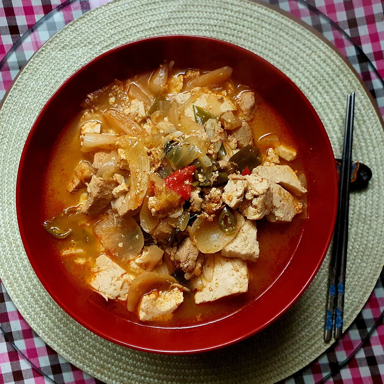 ■ 재료 : 돼지고기 1컵, 두부 ½모, 대파 1대· 양파 ½개, 청양고추 2개, 다진 마늘 1큰술, 새우젓 1큰술, 고춧가루 1큰술, 생강청 ½큰술. 육수 4컵