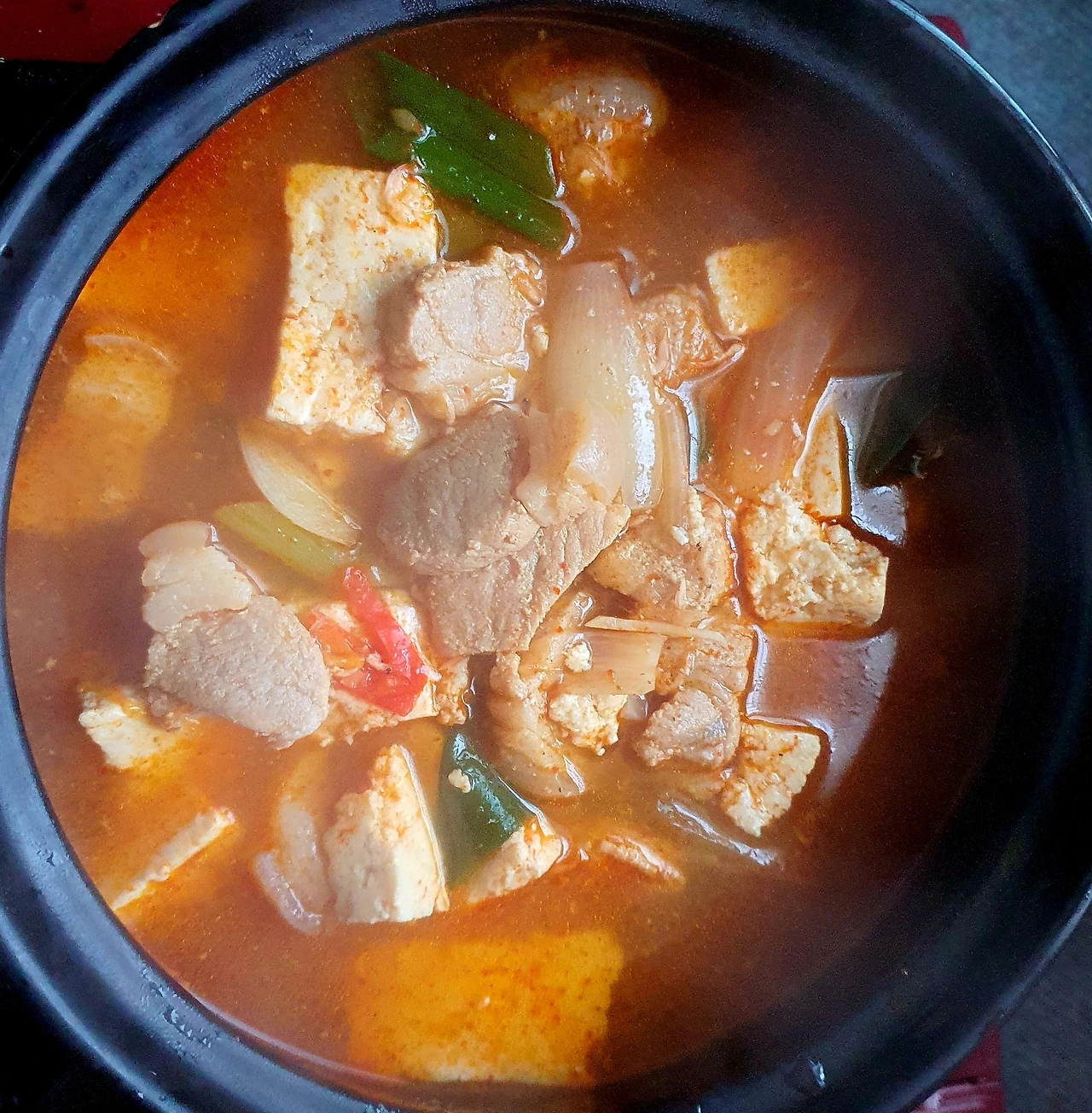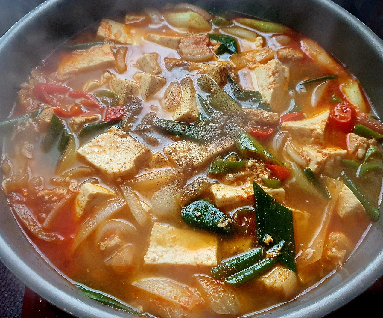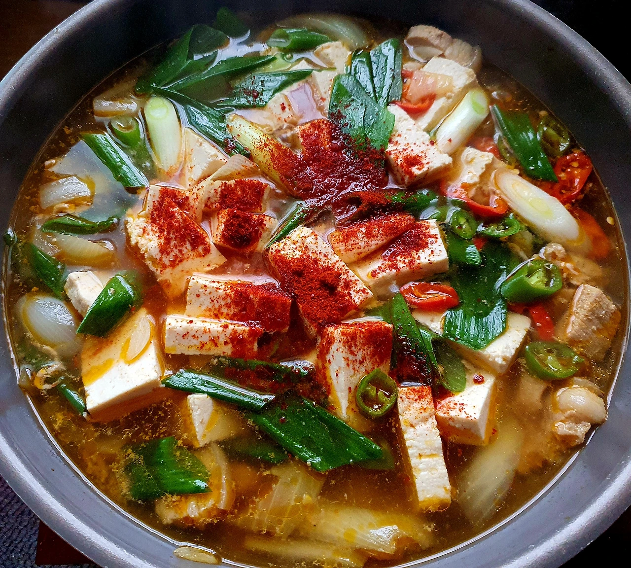 • 마지막으로 두부 · 대파 · 청양고추. 고춧가루를 넣고 한 번 더 끓인 뒤 불을 끄고 후추를 넣으면 완성.