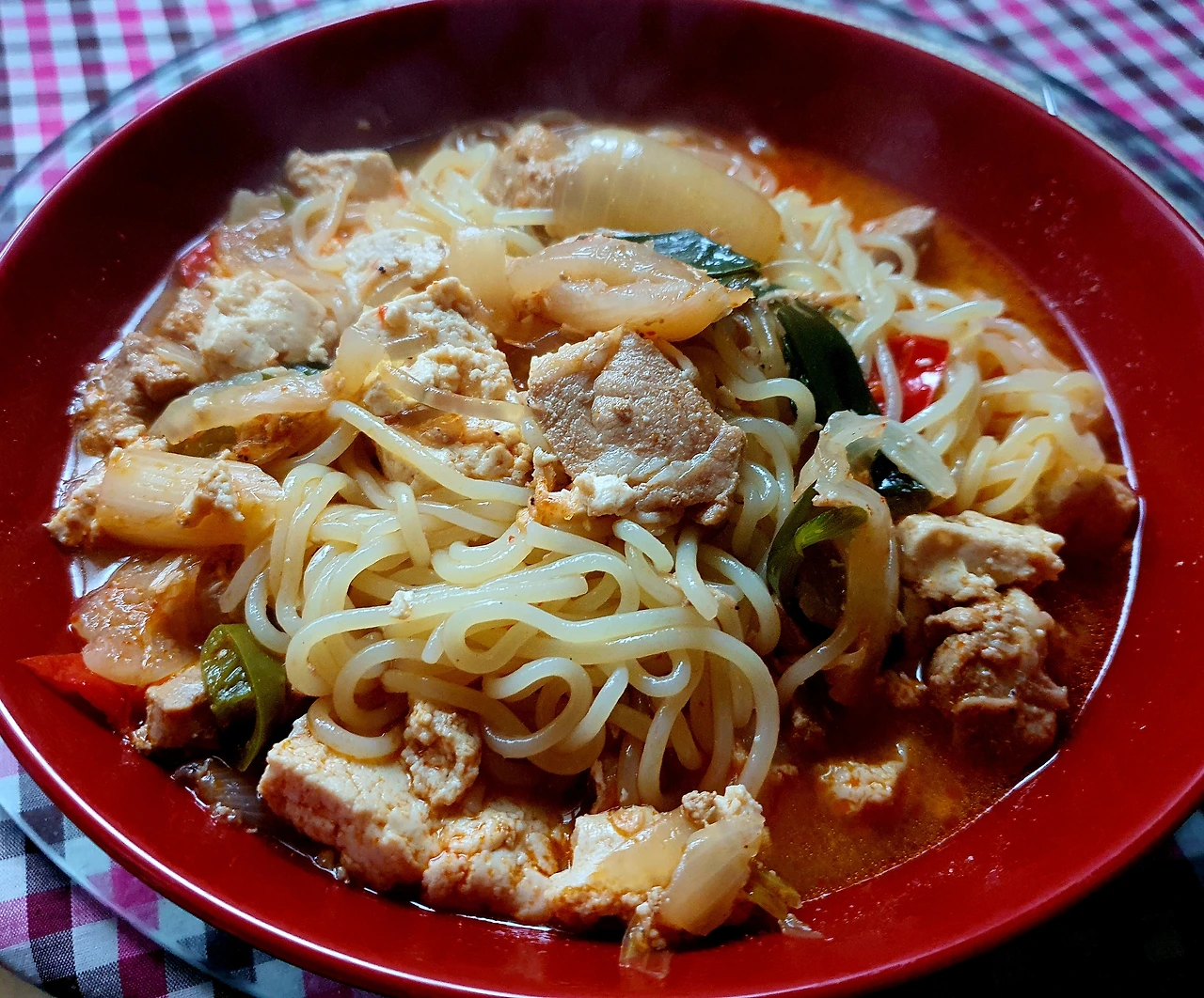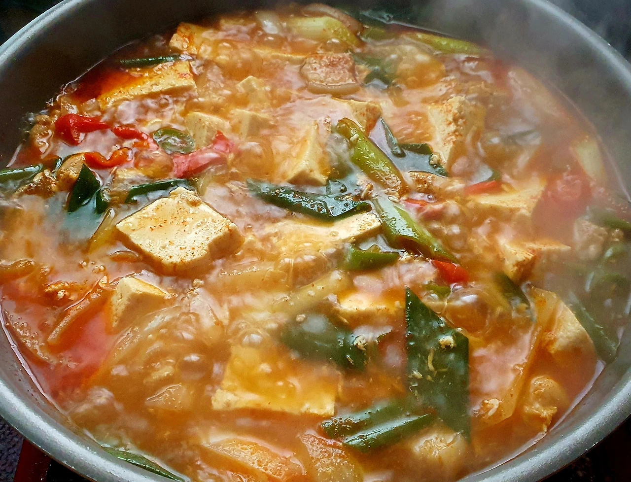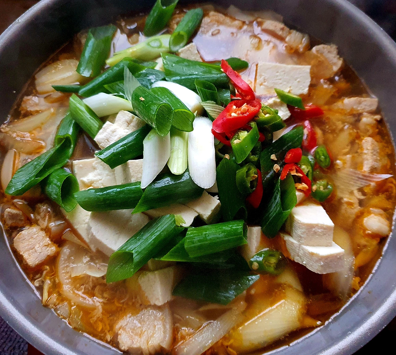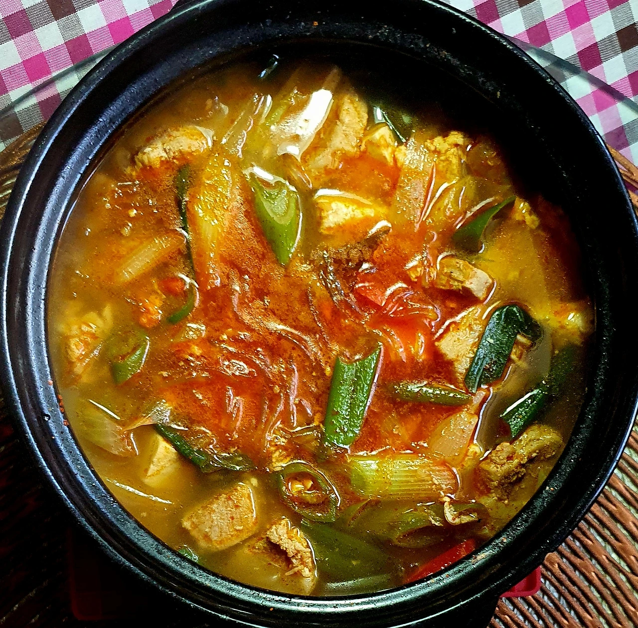 • 마지막으로 두부 · 대파 · 청양고추. 고춧가루를 넣고 한 번 더 끓인 뒤 불을 끄고 후추를 넣으면 완성.