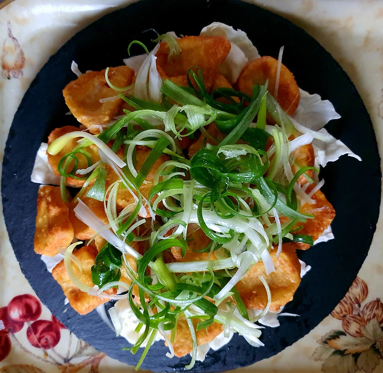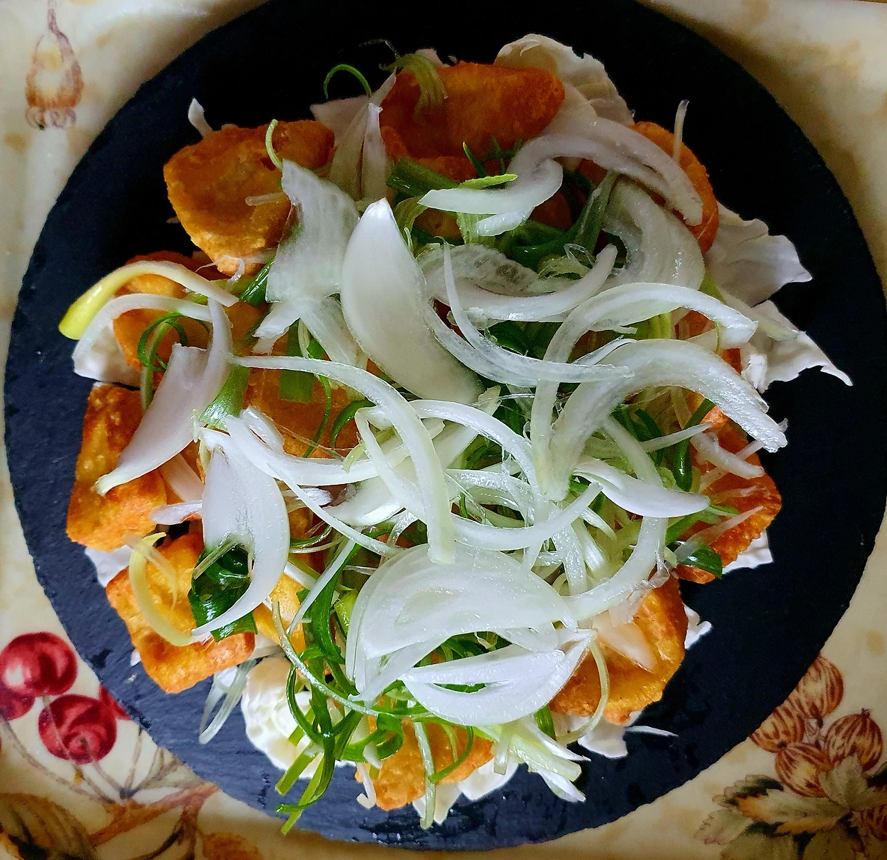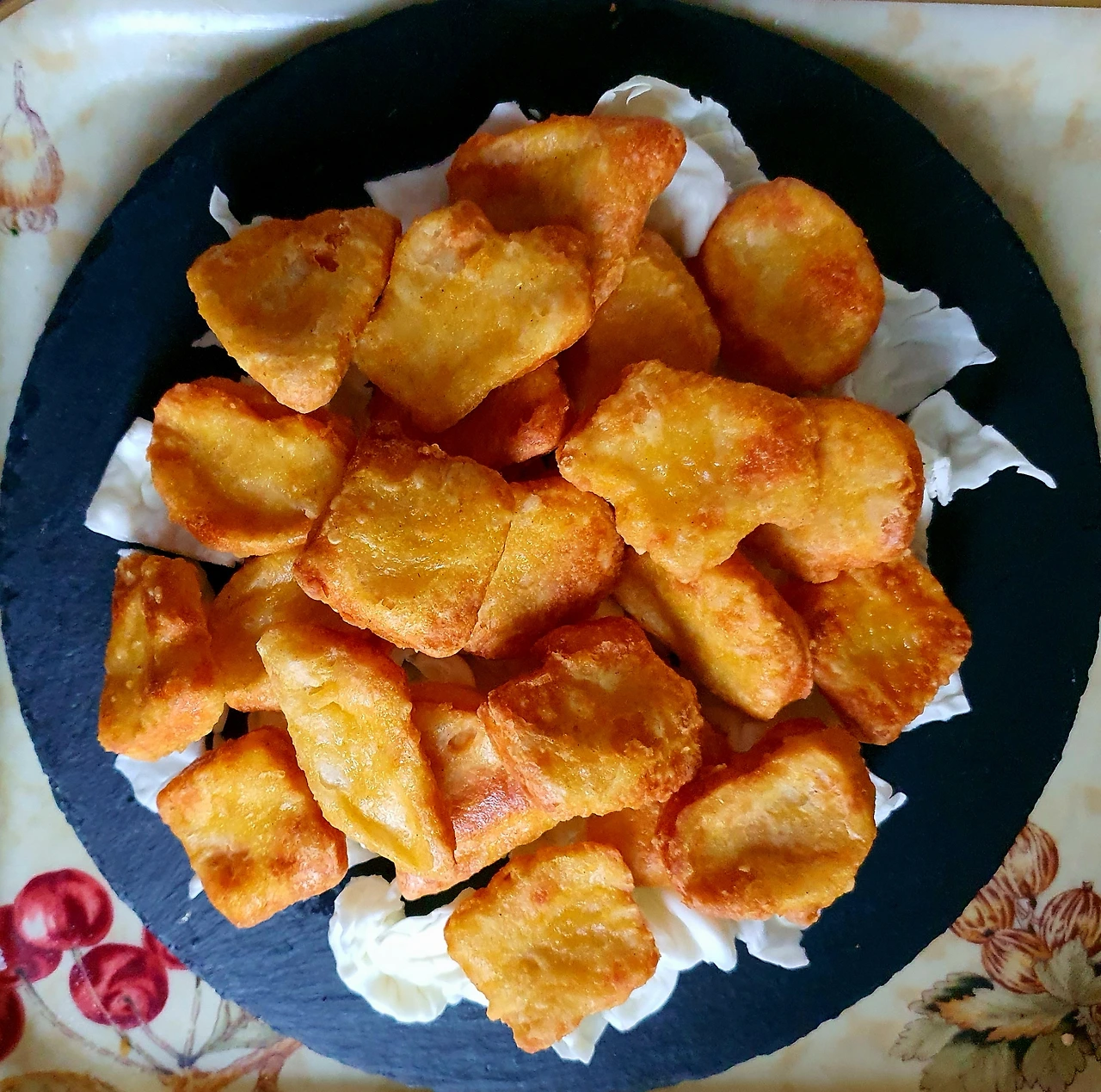 실제는 기름에 바삭하게 구운 닭 위에