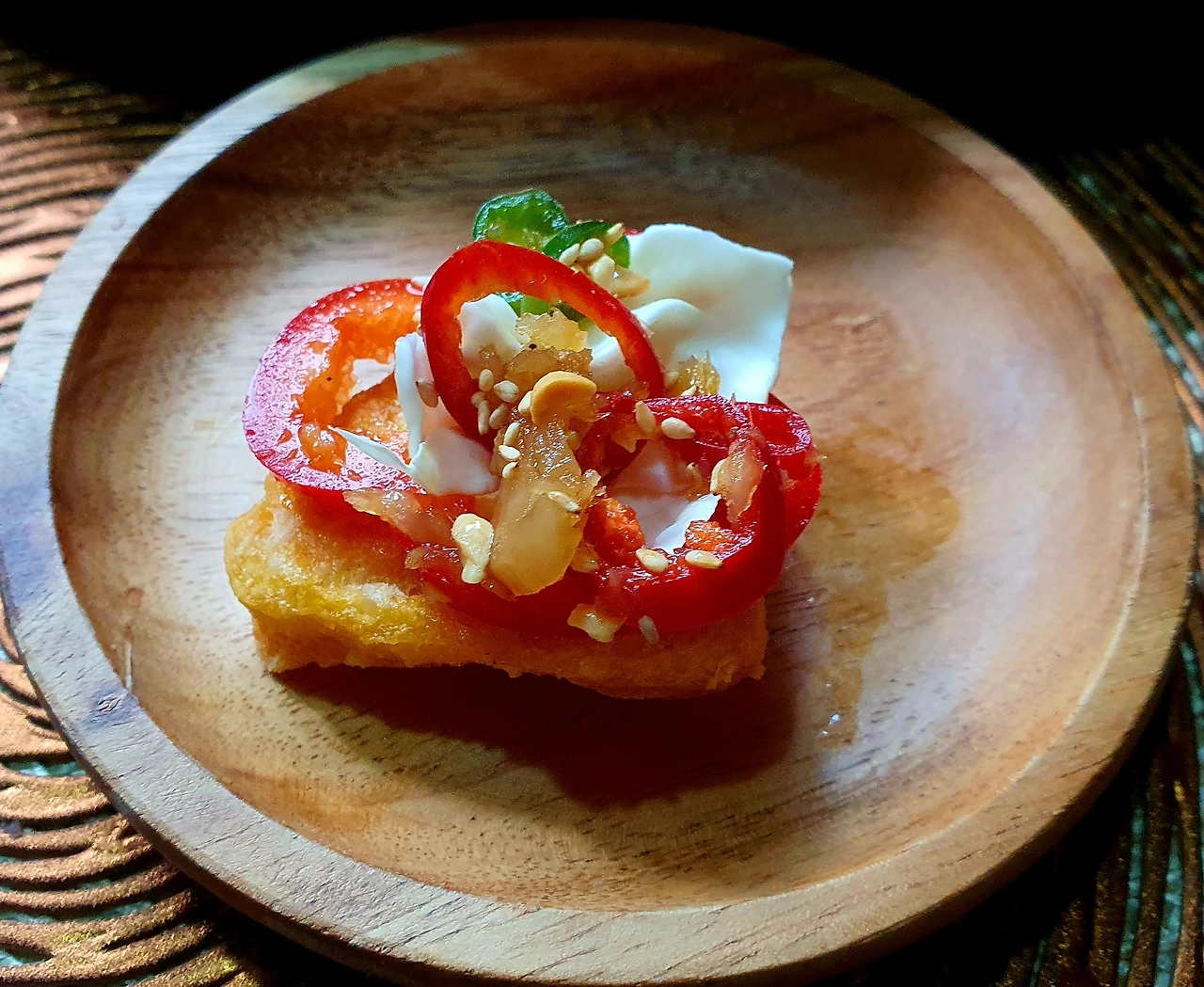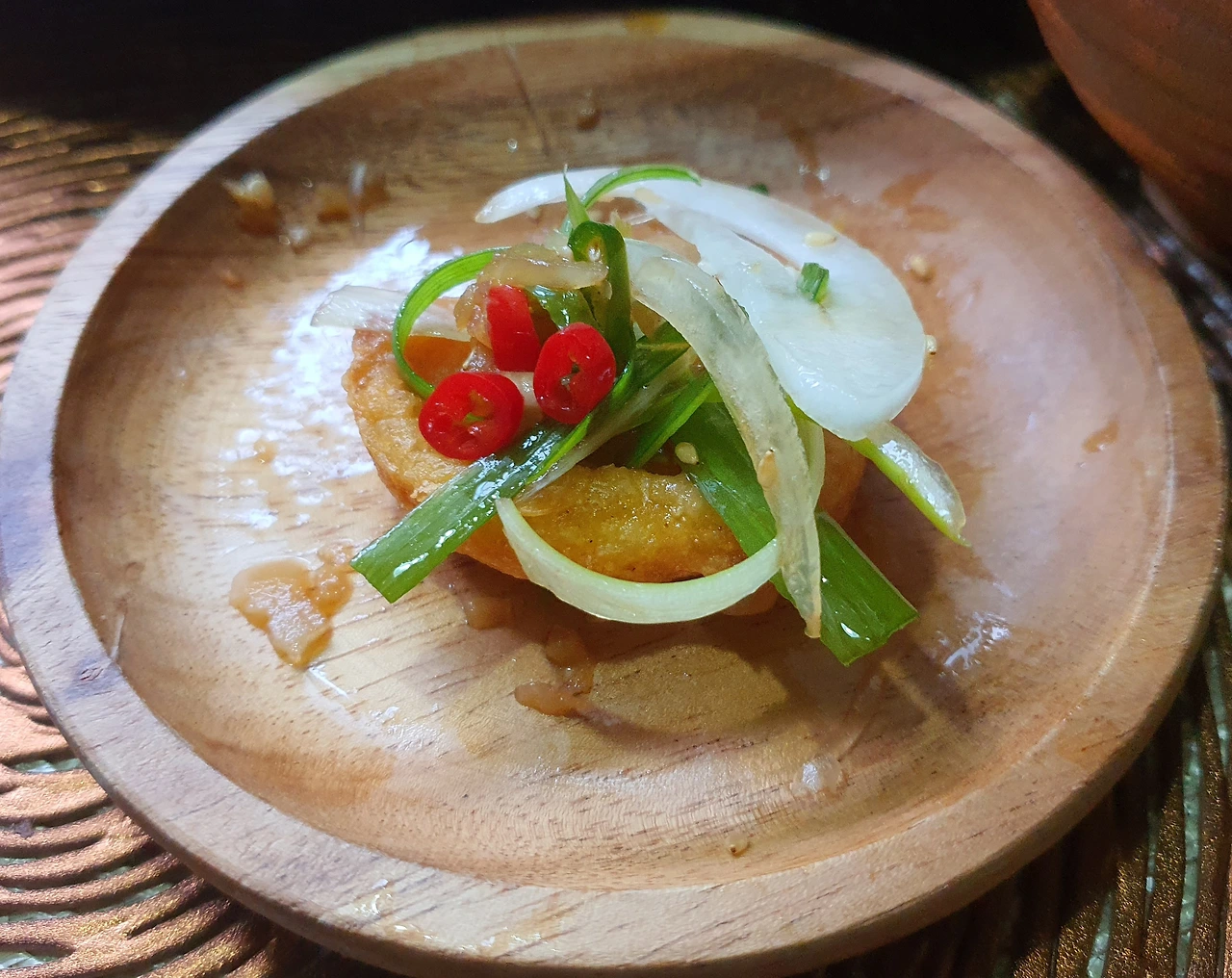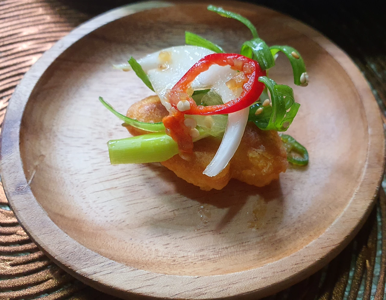 실제는 기름에 바삭하게 구운 닭 위에