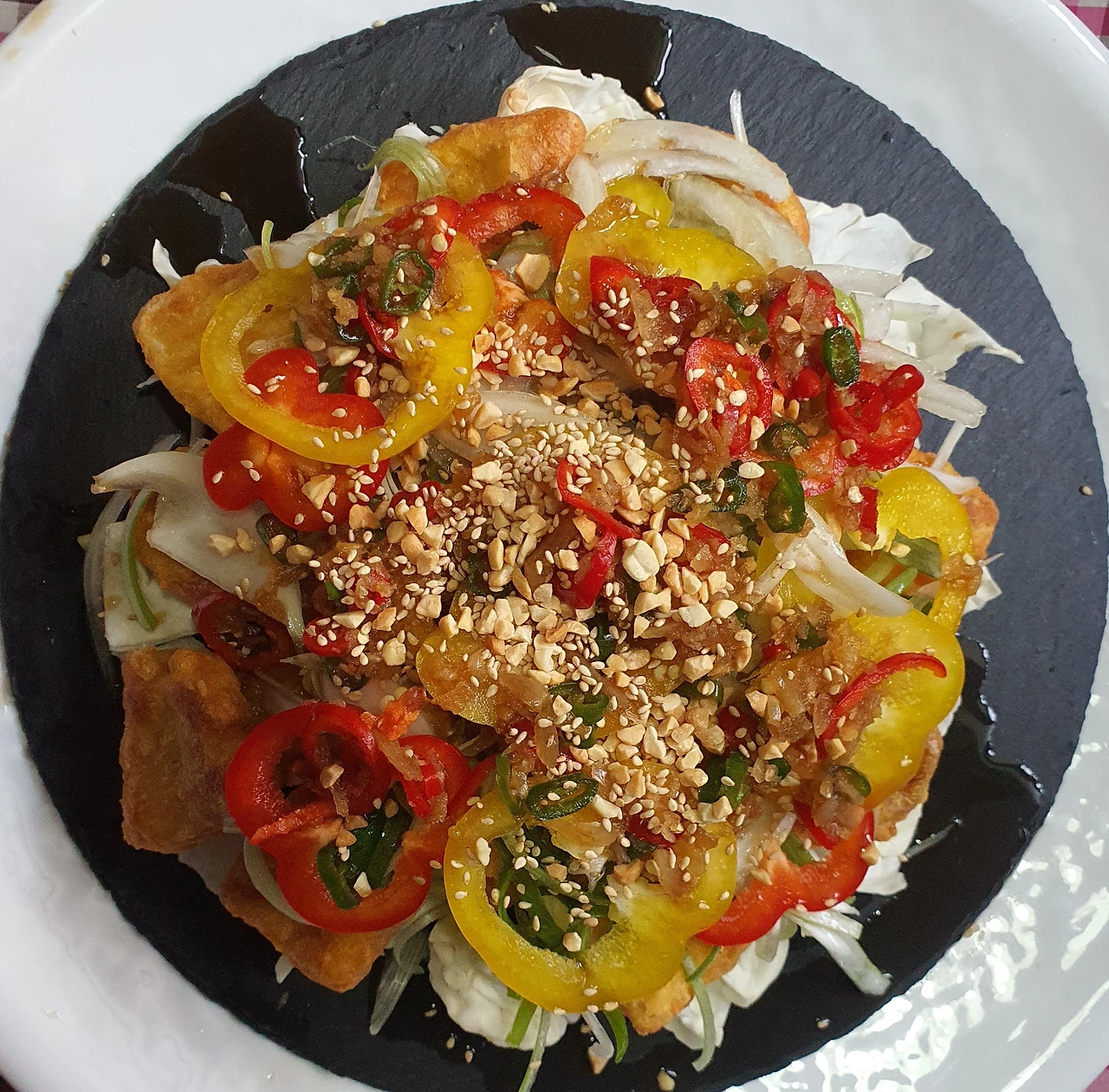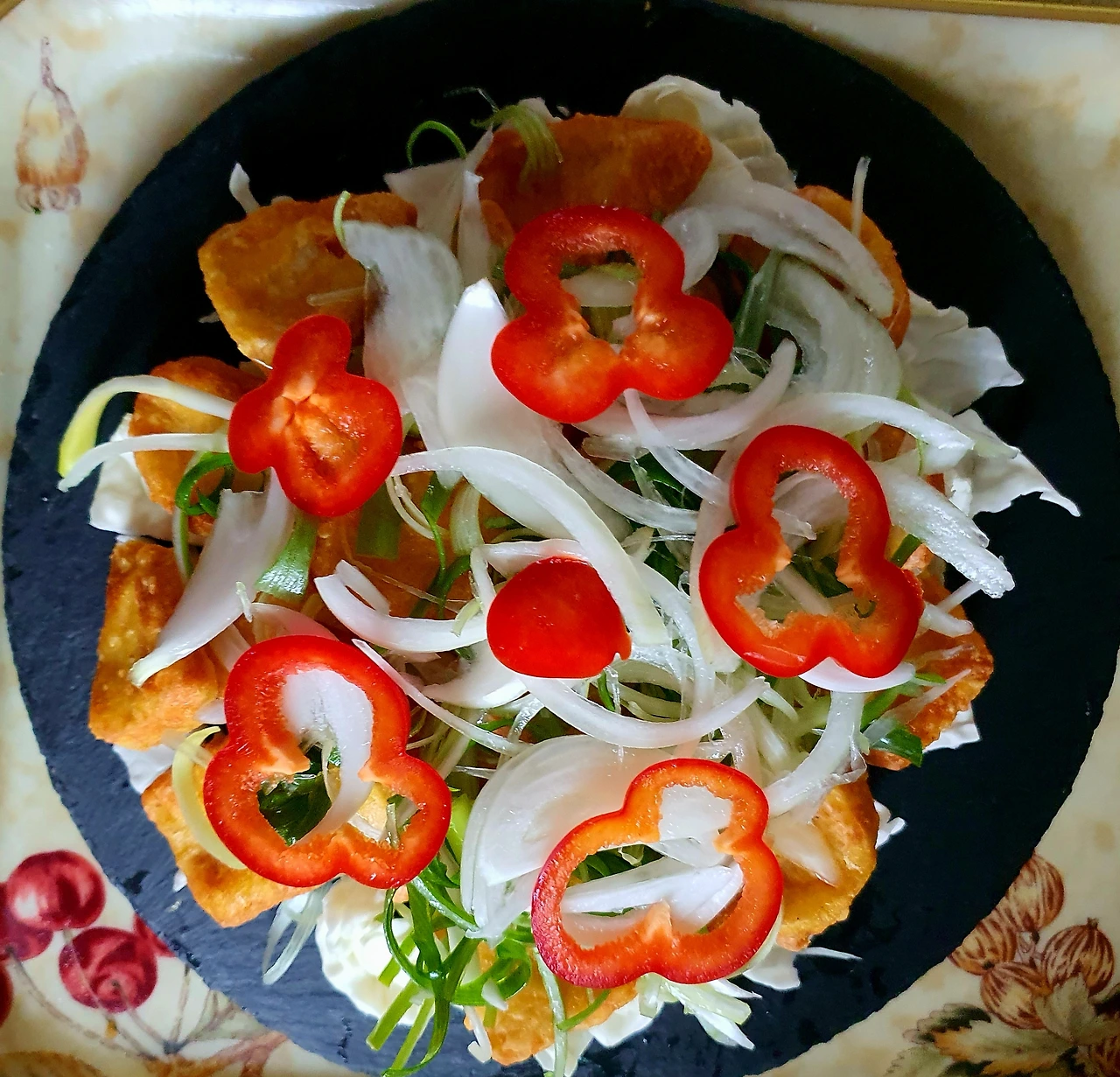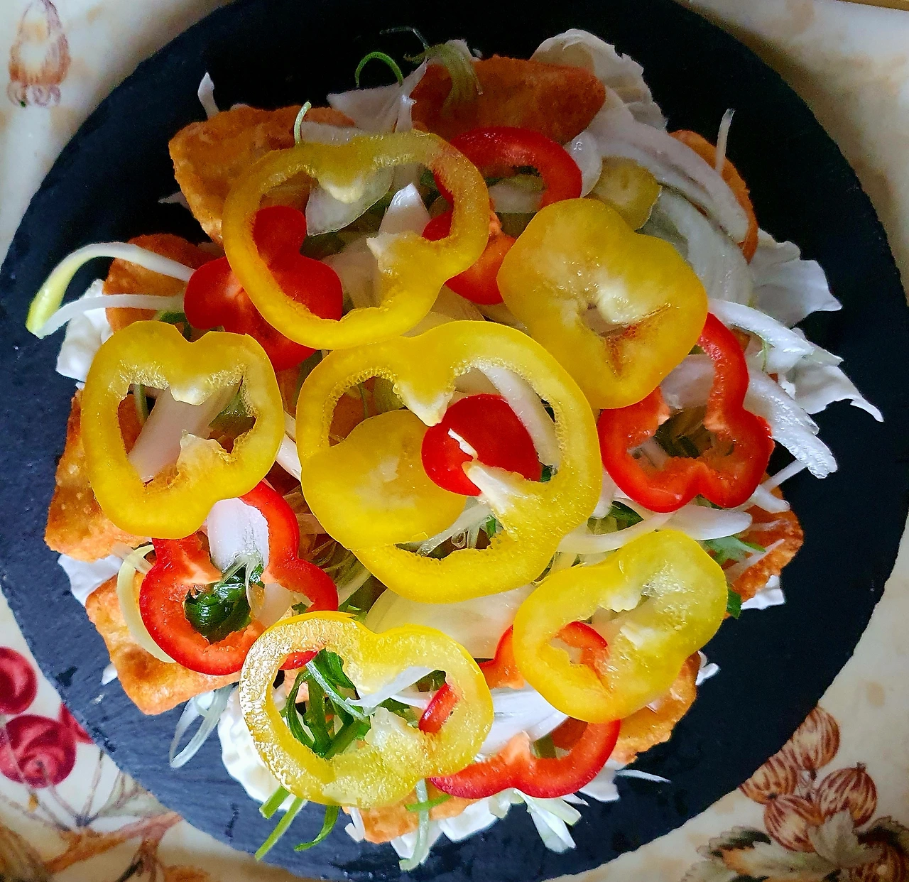 • 완성접시에 양배추를 바닥에 깔고, 위에 닭고기, 채 썬 대파. 양파. 파프리카순으로 올려준다.