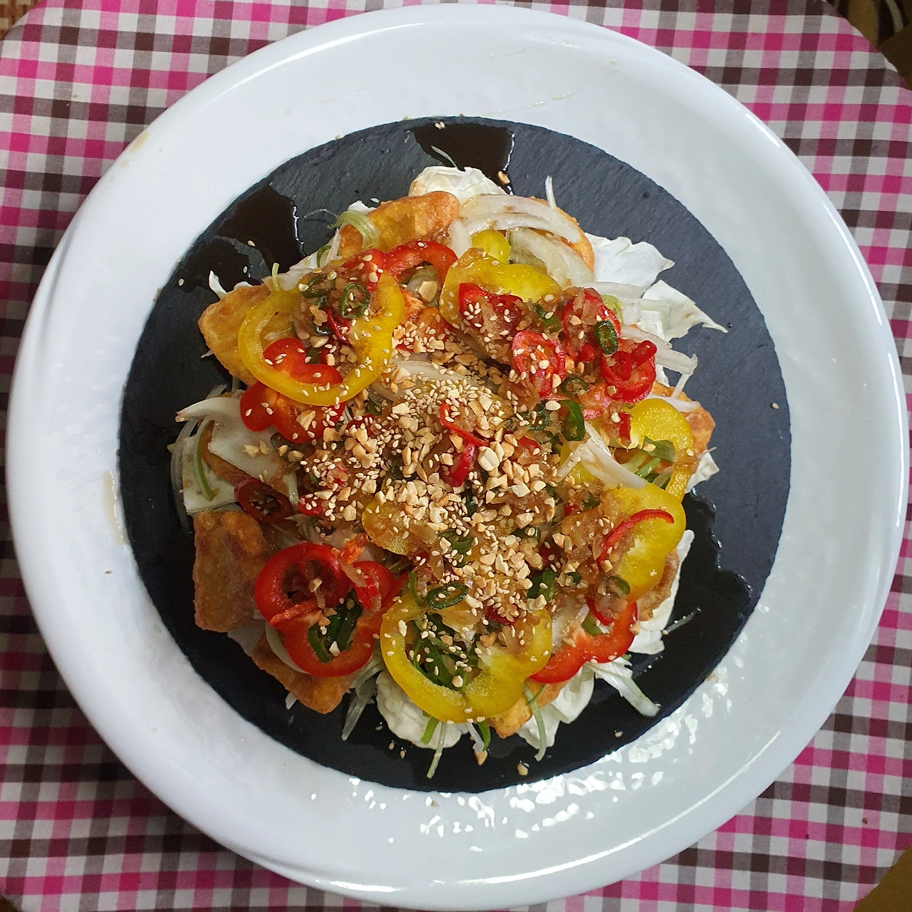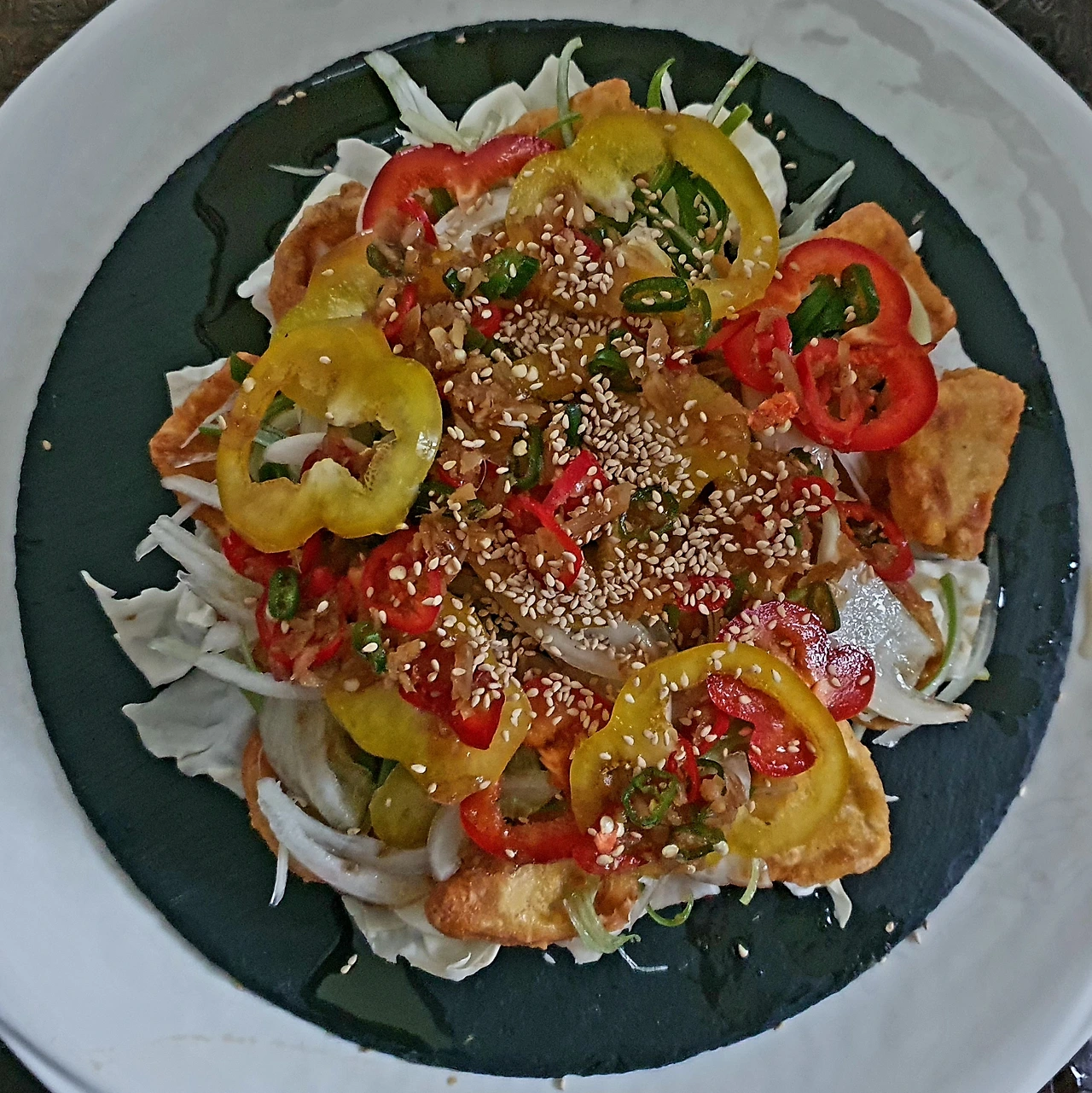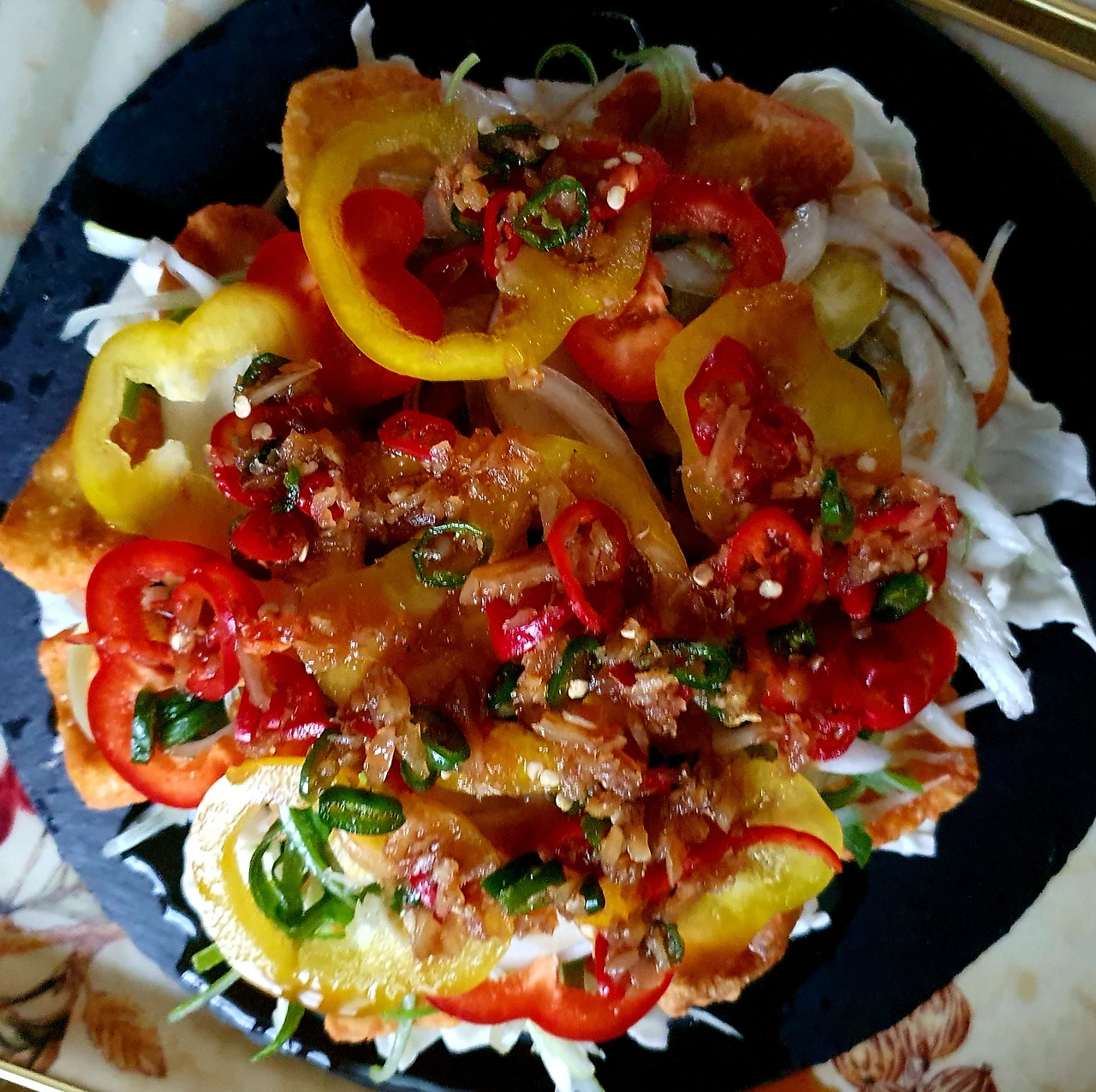 • 완성접시에 양배추를 바닥에 깔고, 위에 닭고기, 채 썬 대파. 양파. 파프리카순으로 올려준다.