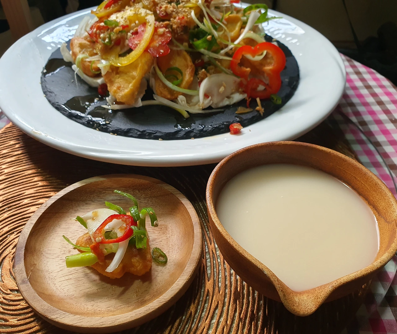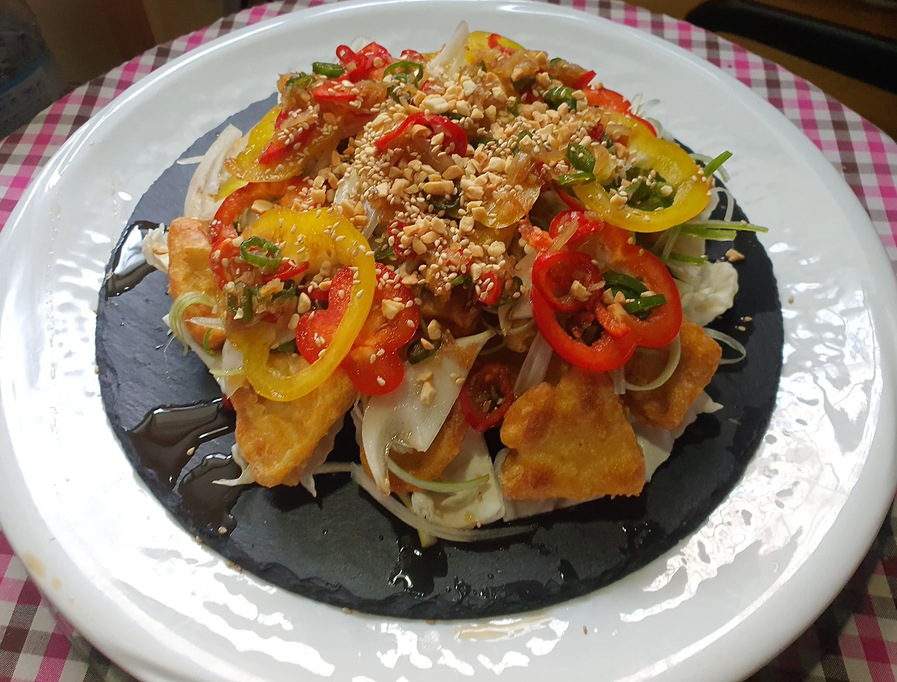 • 상에 올려 먹기 직전에 소스를 뿌려주고 땅콩가루를 솔솔 올려주면 완성.