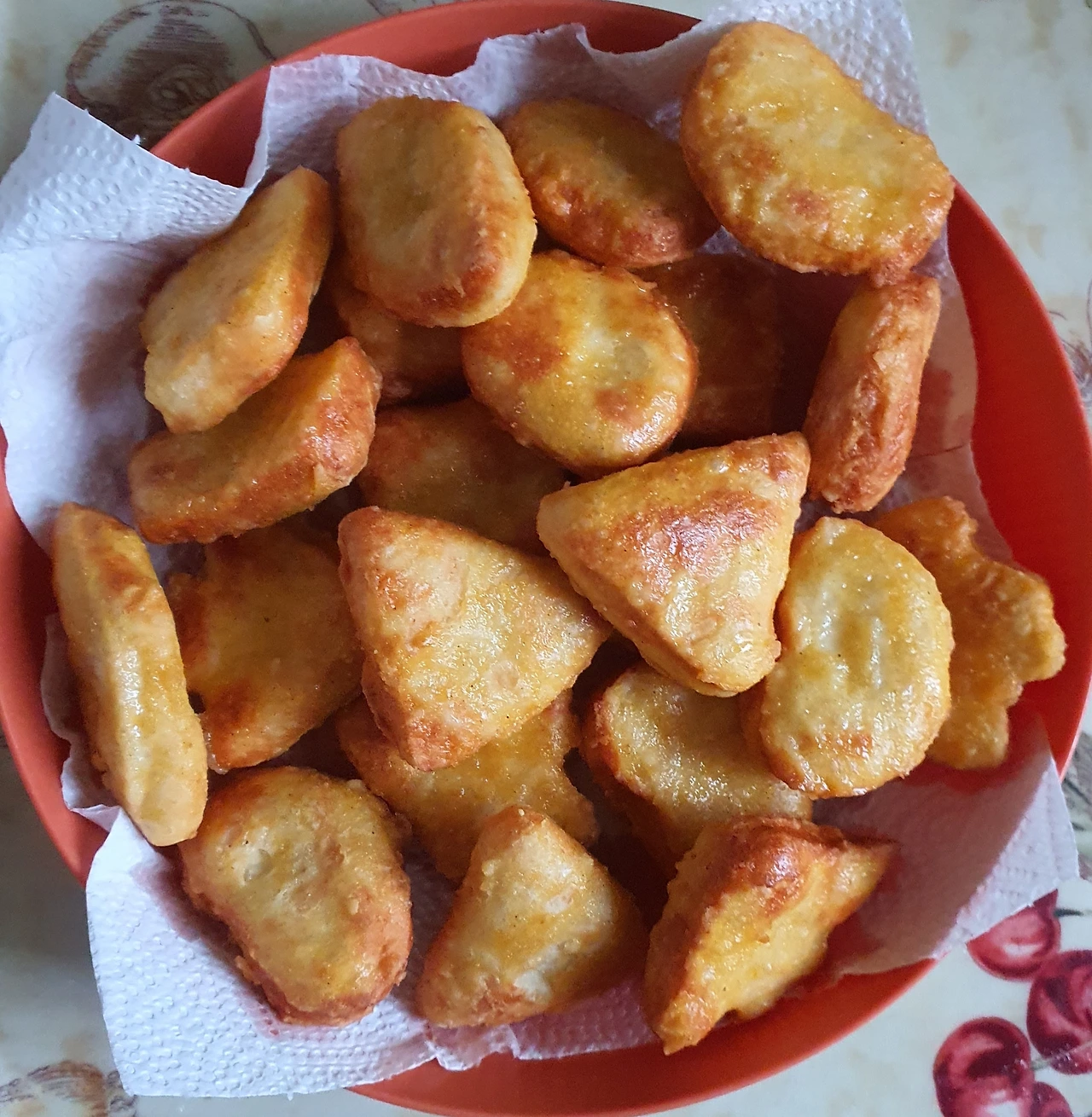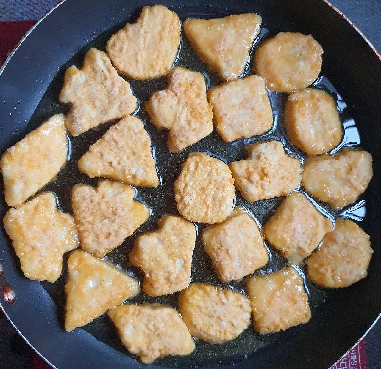 • 치킨너겟을 달군 팬에 기름을 넉넉히 두르고 앞뒤로 노릇하게 튀기듯 구워준 후 키친타월에 올려 기름기를 제거해 준다.