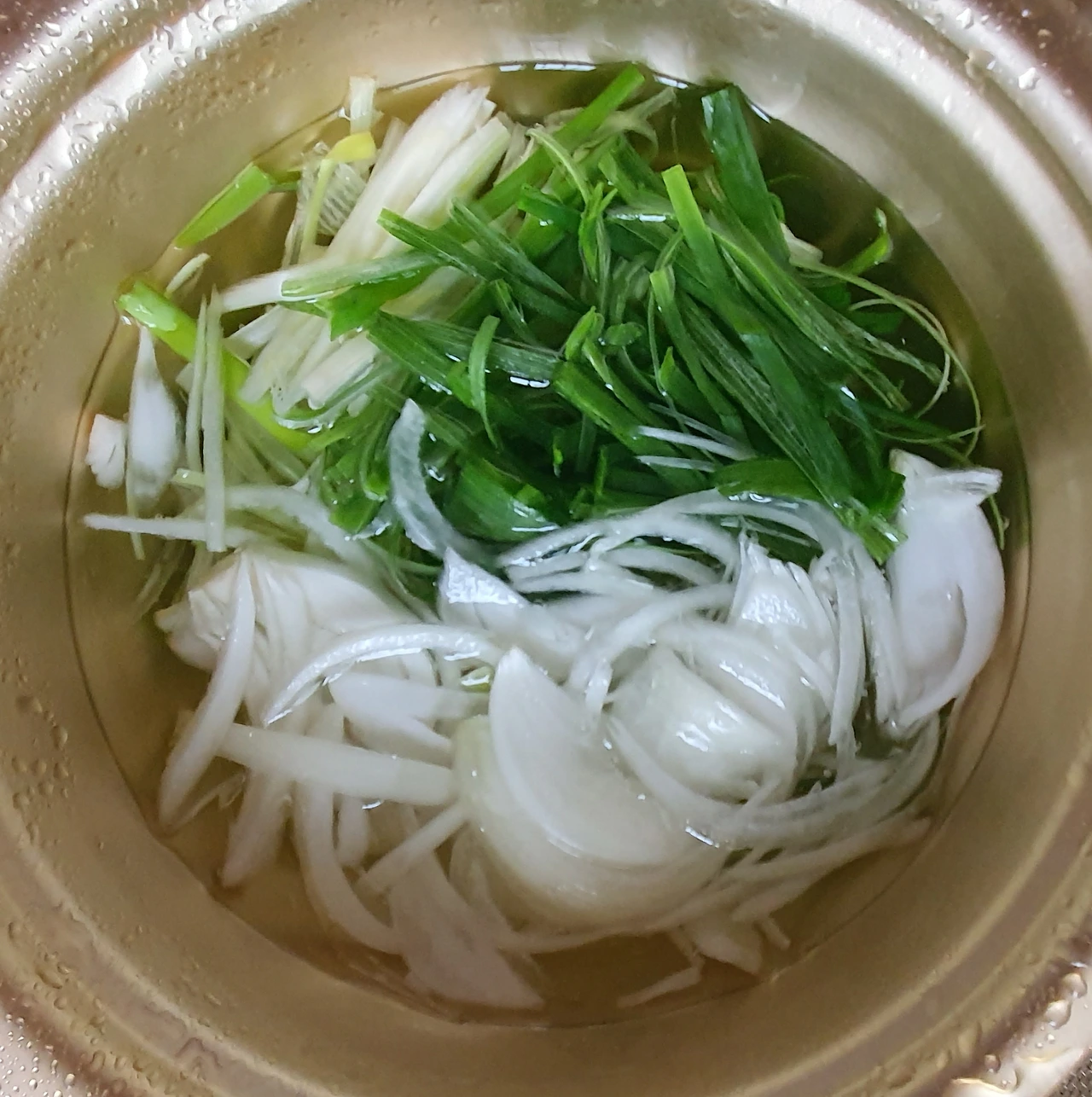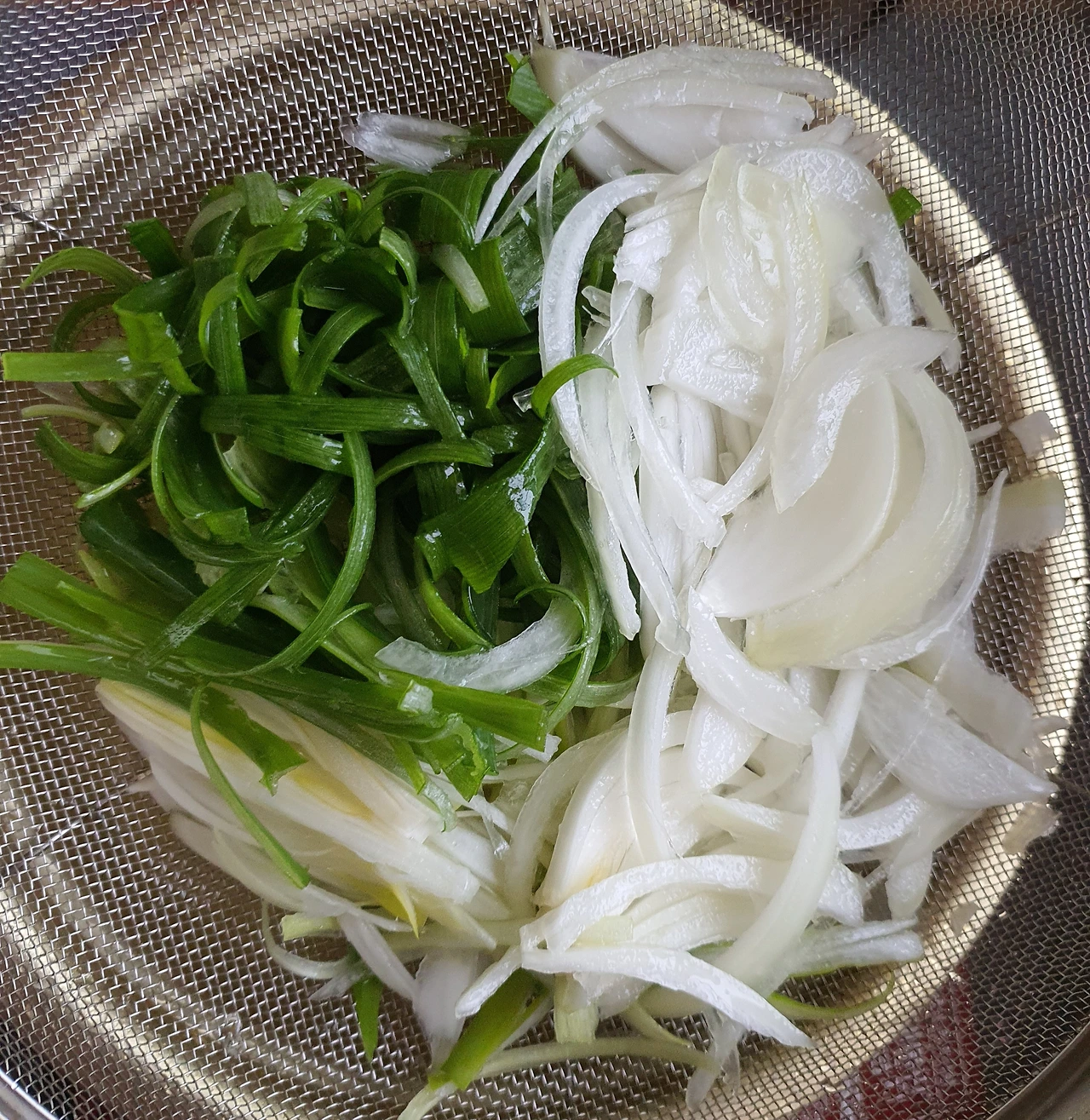 • 청. 홍고추 각 1개는 씨를 빼고 잘게 다지듯 썰고, 대파와 양파는 세로로 채 썬 후 물에 담가 아린맛을 제거해 준다.