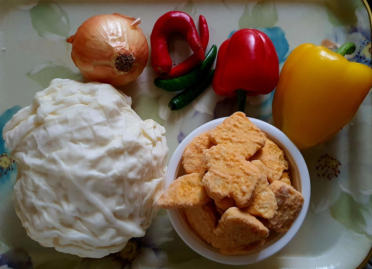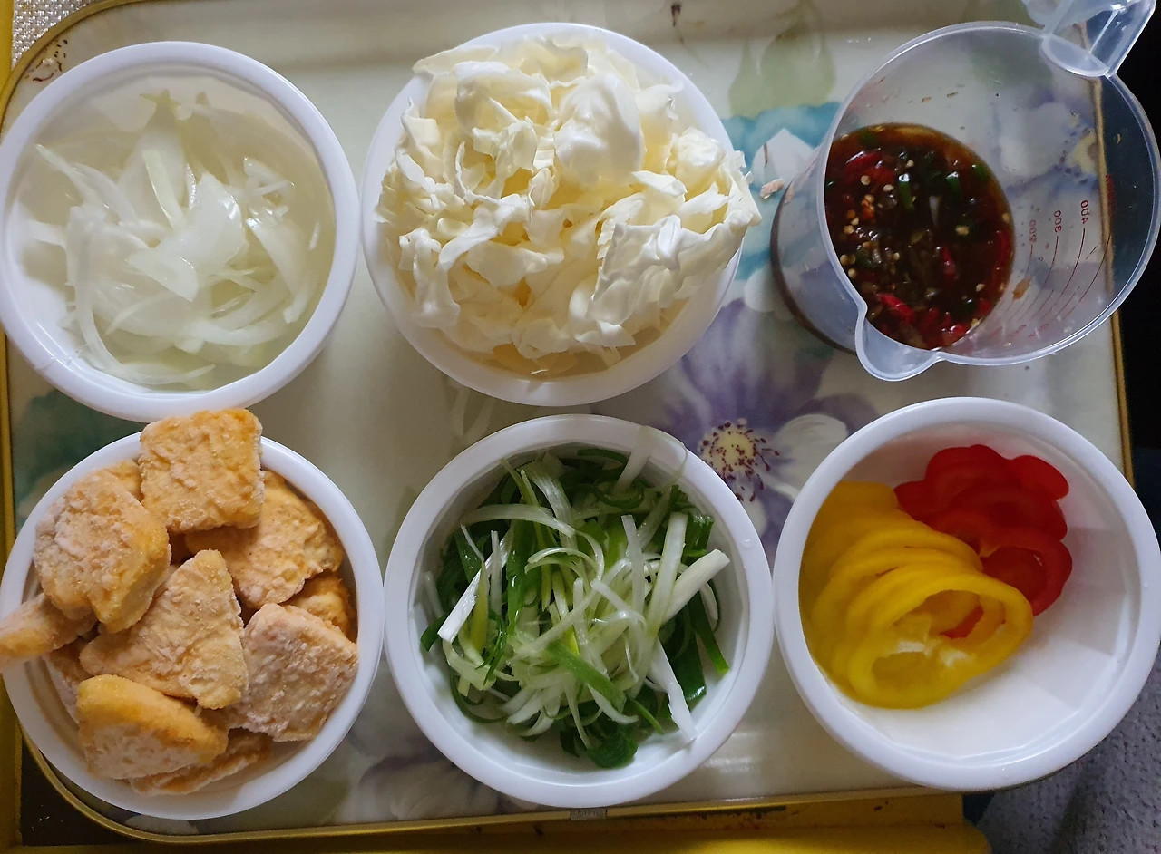 ■ 재료 : 치킨너겟 2컵, 대파 ½대, 양배추 1컵, 양파 ⅓개, 빨강. 노랑 파프리카 ⅓개씩, 청. 홍고추 각 1개, 식용유, 땅콩가루 조금