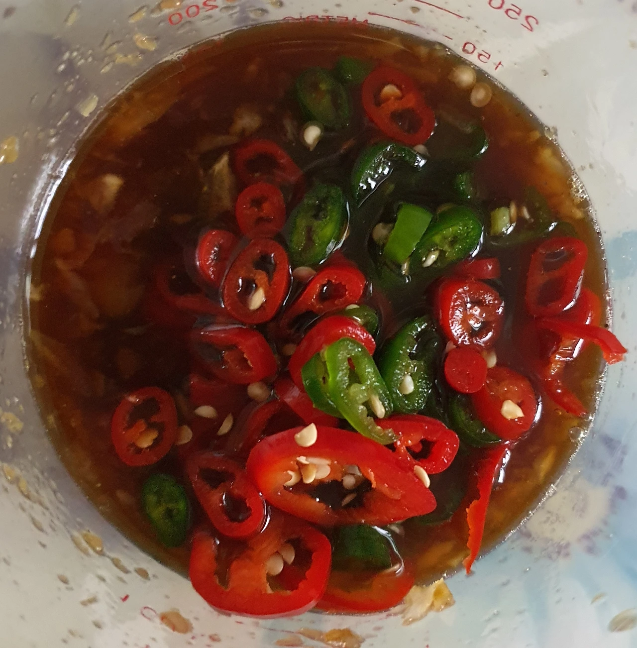 • 소스 재료들(진간장, 설탕, 감식초, 다진 마늘, 물, 맛술, 생강청, 레몬즙, 후추와 청. 홍고추)을 잘 섞어 준다.