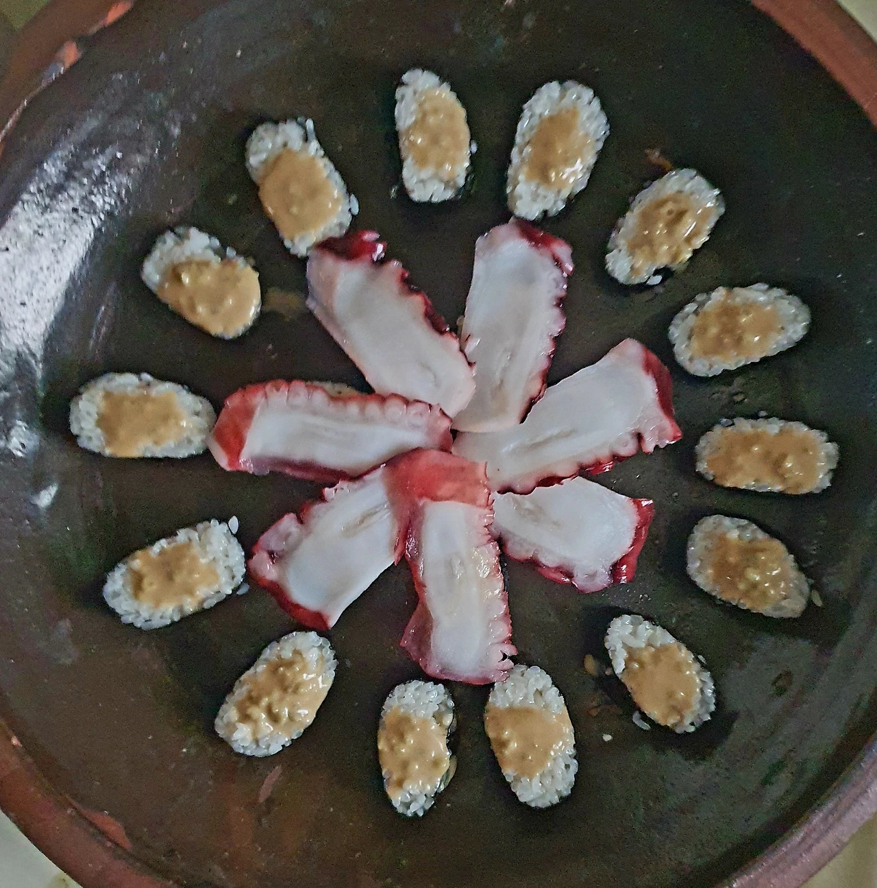 • 완성접시에 김밥을 담고 김밥 위에 소스를 언고 계란말이와 문어숙회를 올려주면 완성!