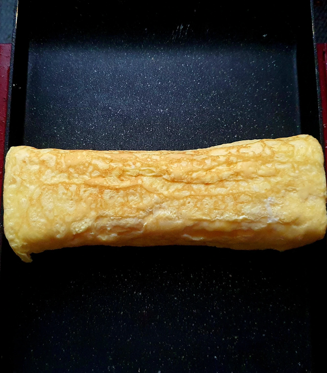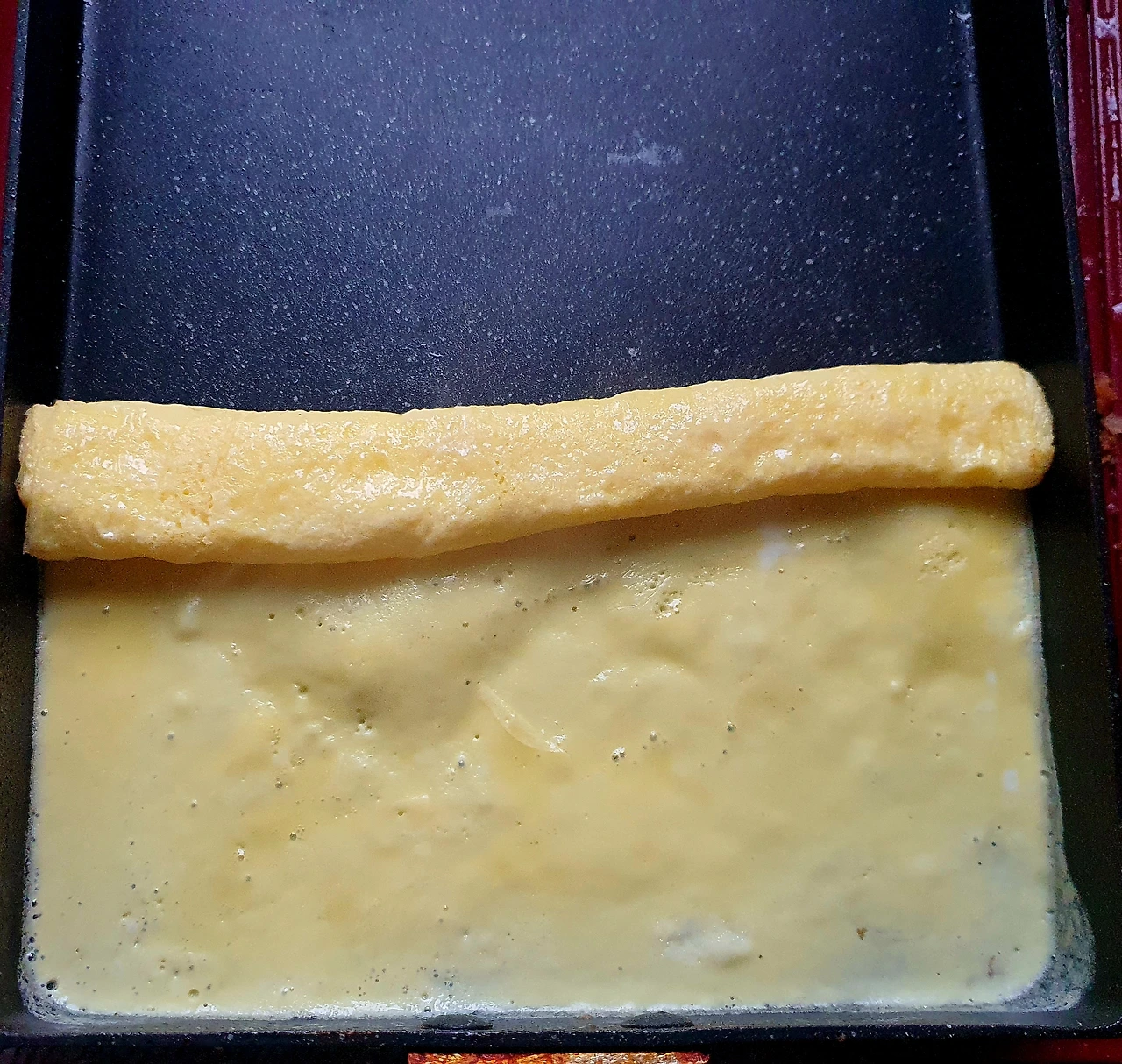 • 달군 팬에 식용유를 살짝 둘러 키친타월로 고루 닦아 준 뒤 약불에서 계란물을 적당량 부운 후 돌돌 말아 통통한 계란말이를 완성해 준다.