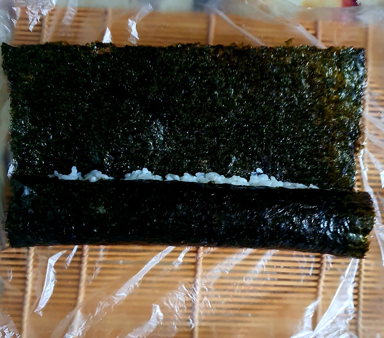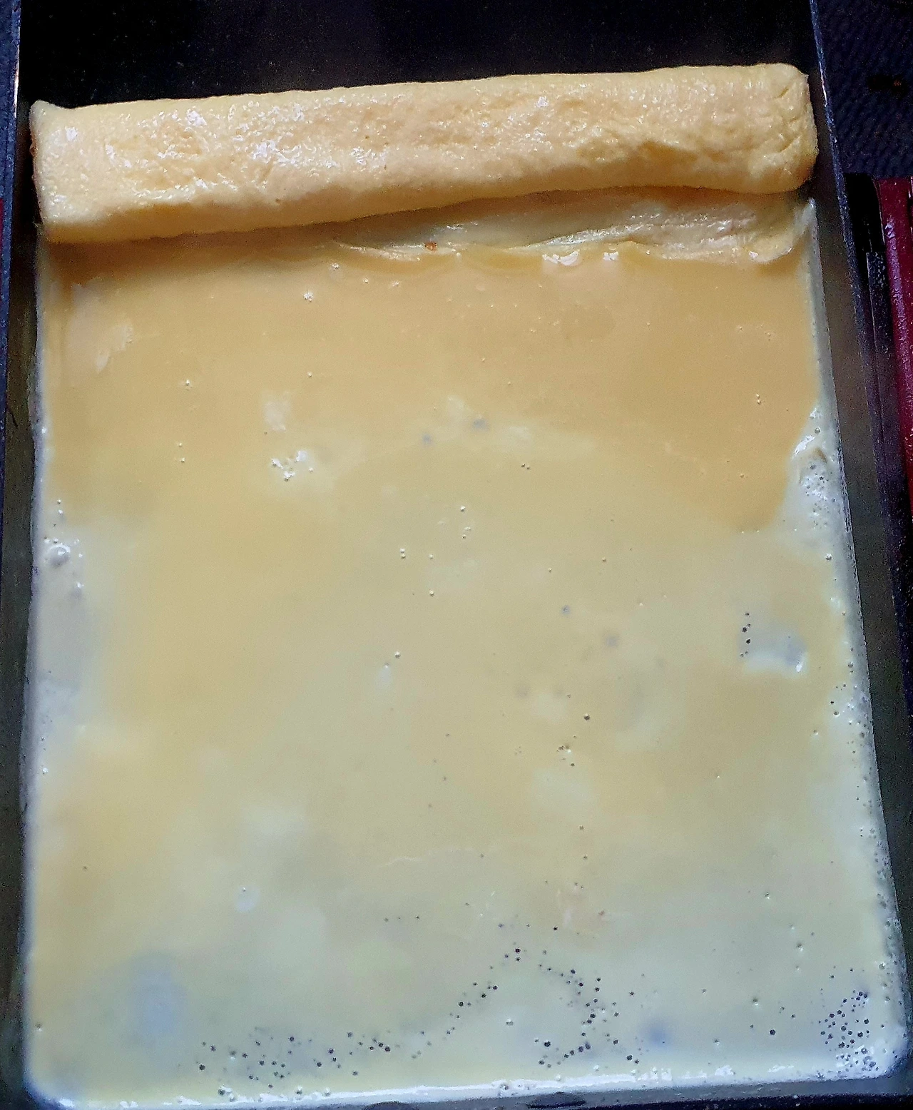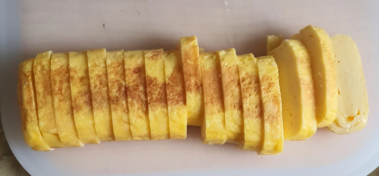 • 계란말이가 적당히 식은 뒤 초밥에 알맞은 굵기로 썰어 준다.