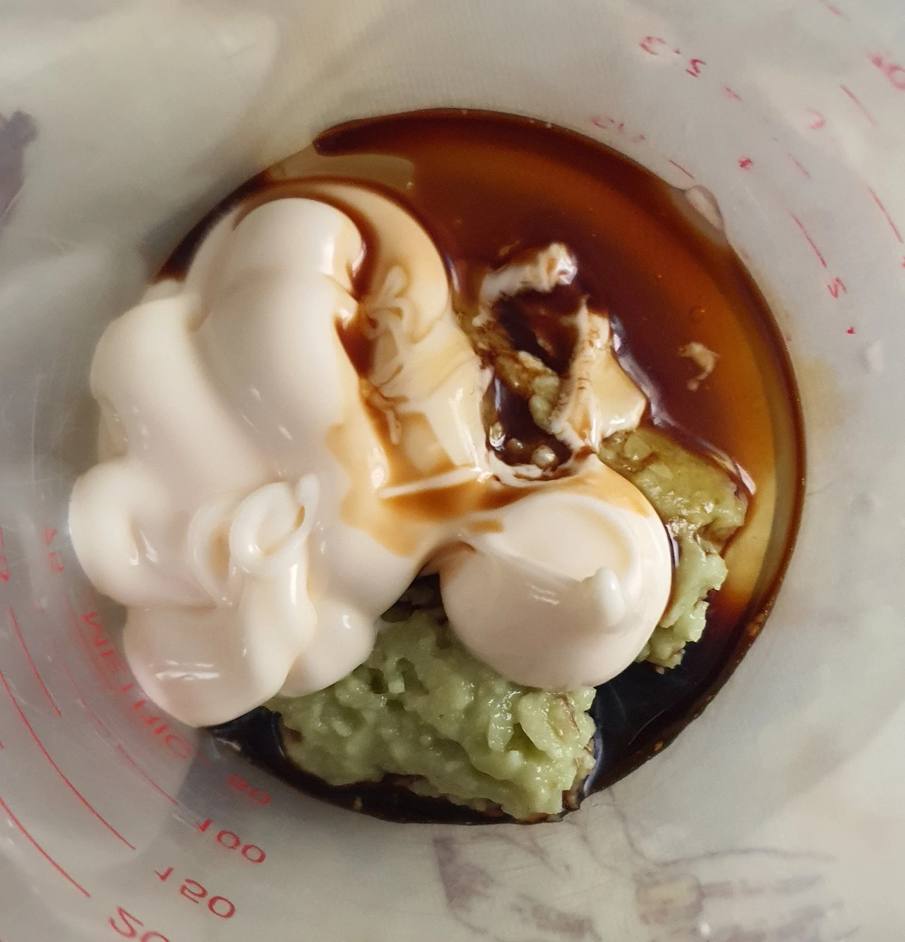 • 고추냉이 1큰술, 마요네즈 1큰술, 간장 1큰술, 꿀 1큰술을 잘 섞어서 소스를 만들어 준다.