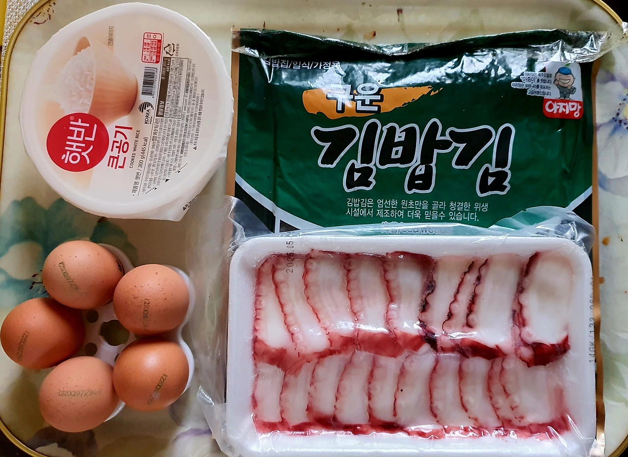 ■ 재료 : 계란 5개, 문어숙회 1팩, 김밥 김 2장, 큰 밥 1공기, 고추냉이 약간