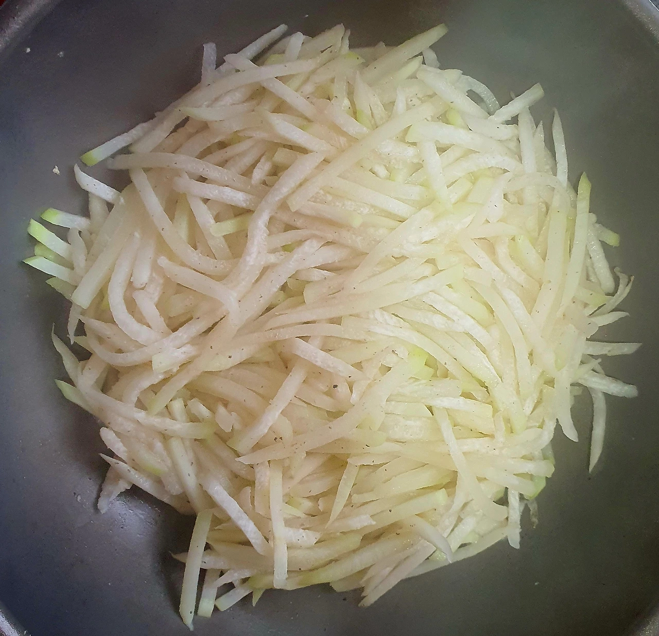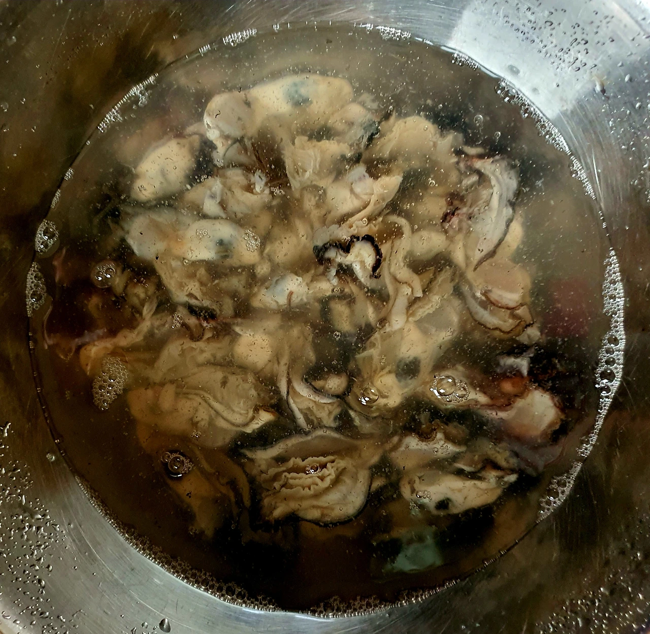 • 굴이 볶아지면 불을 끄고 굴은 건져내고 다시 불을 켜고 굴에서 나온 국물에 채 썬 무를 넣고 소금을 2꼬집 정도 넣고 살짝만 볶아준다.