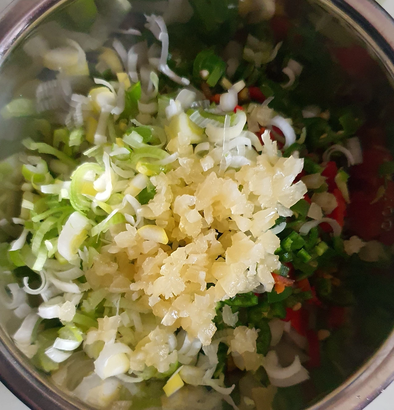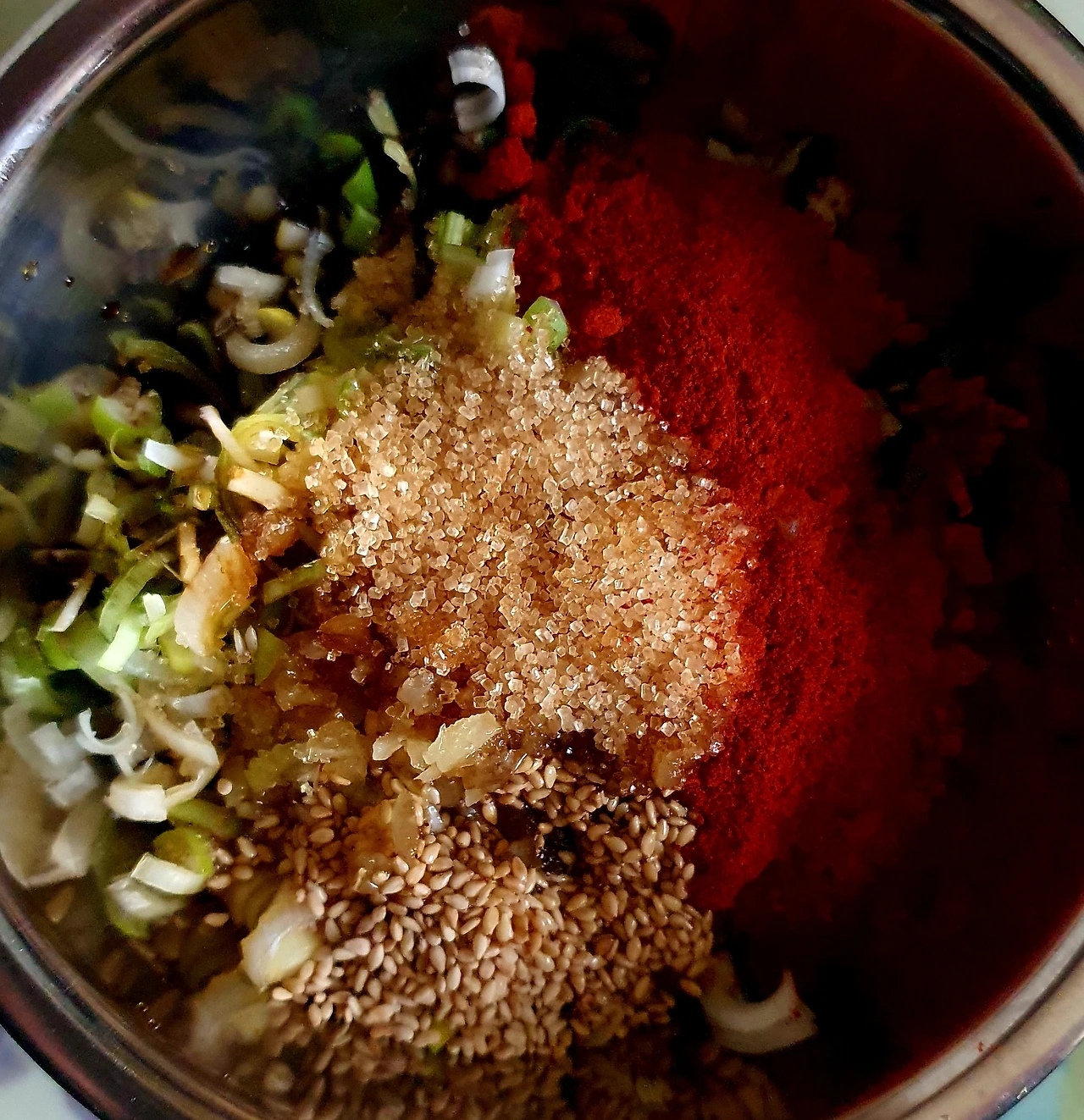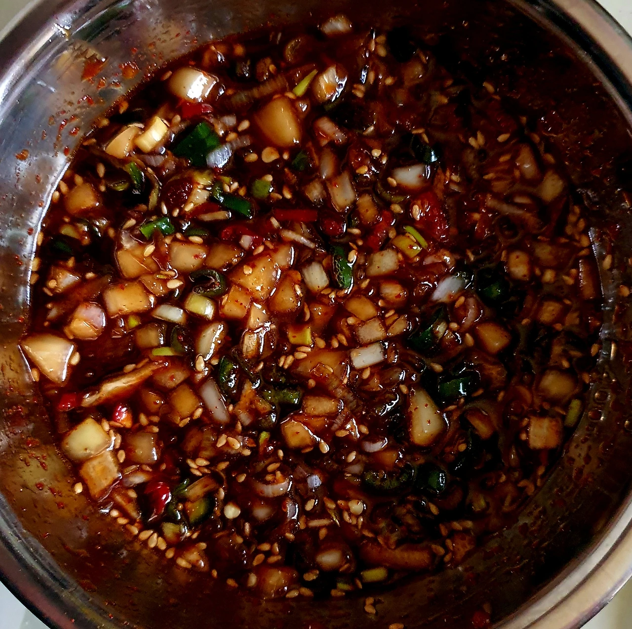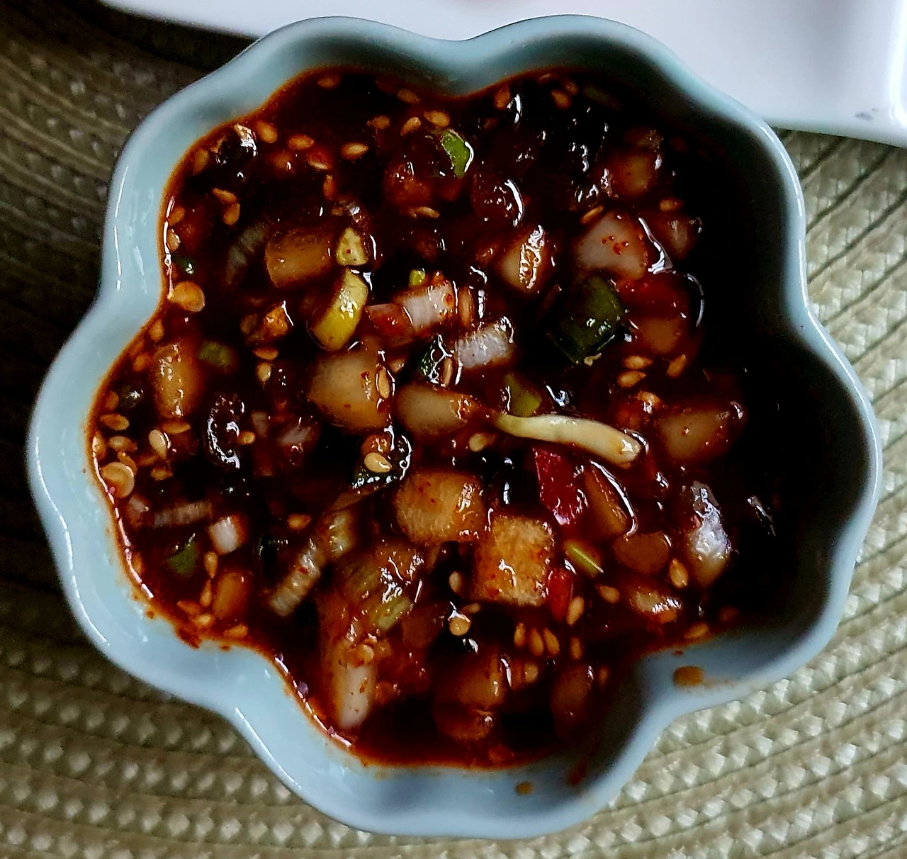 ■ 양념장 : 진간장 3큰술. 참치액 1큰술. 물 1큰술. 고춧가루 ½큰술. 원당 ½큰술. 매실청 2큰술. 통깨 ½큰술. 참기름 1큰술. (마늘 3톨. 양파 ¼개. 청양고추 1개. 홍고추 1개를 다지듯 잘게 썰어줌)