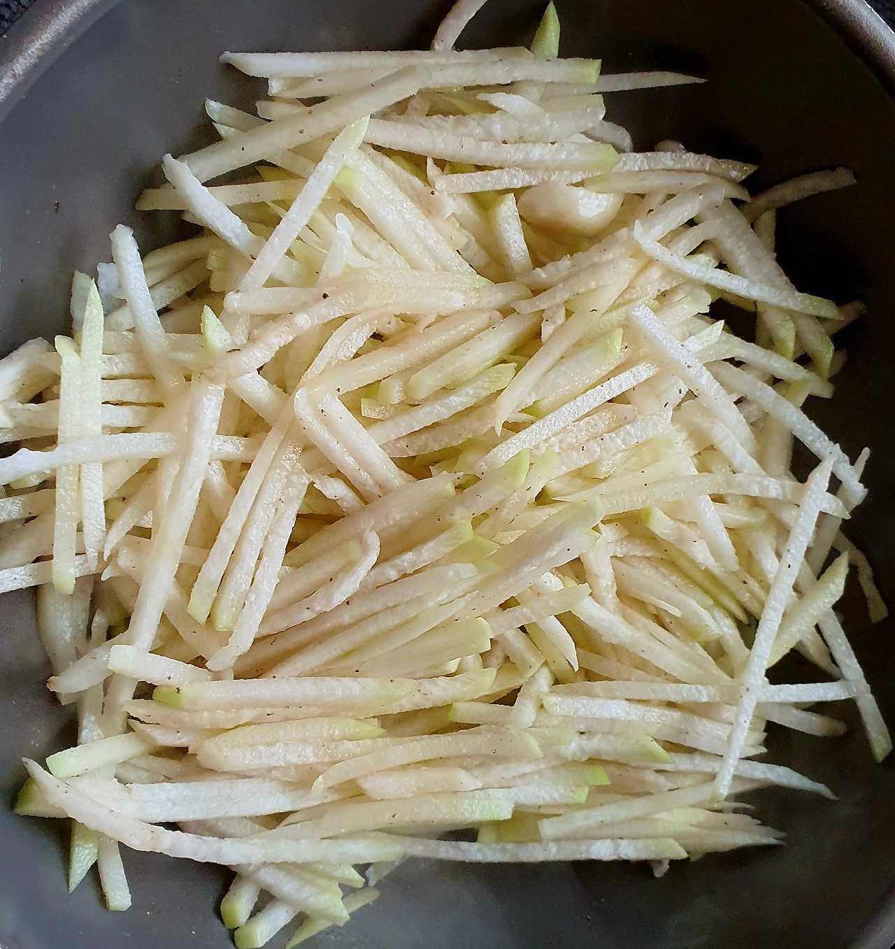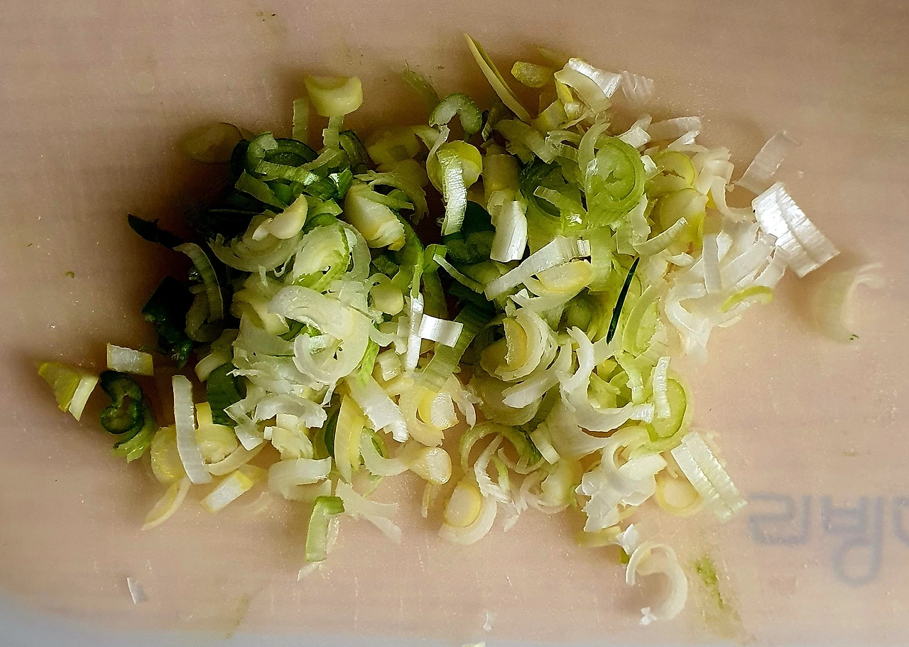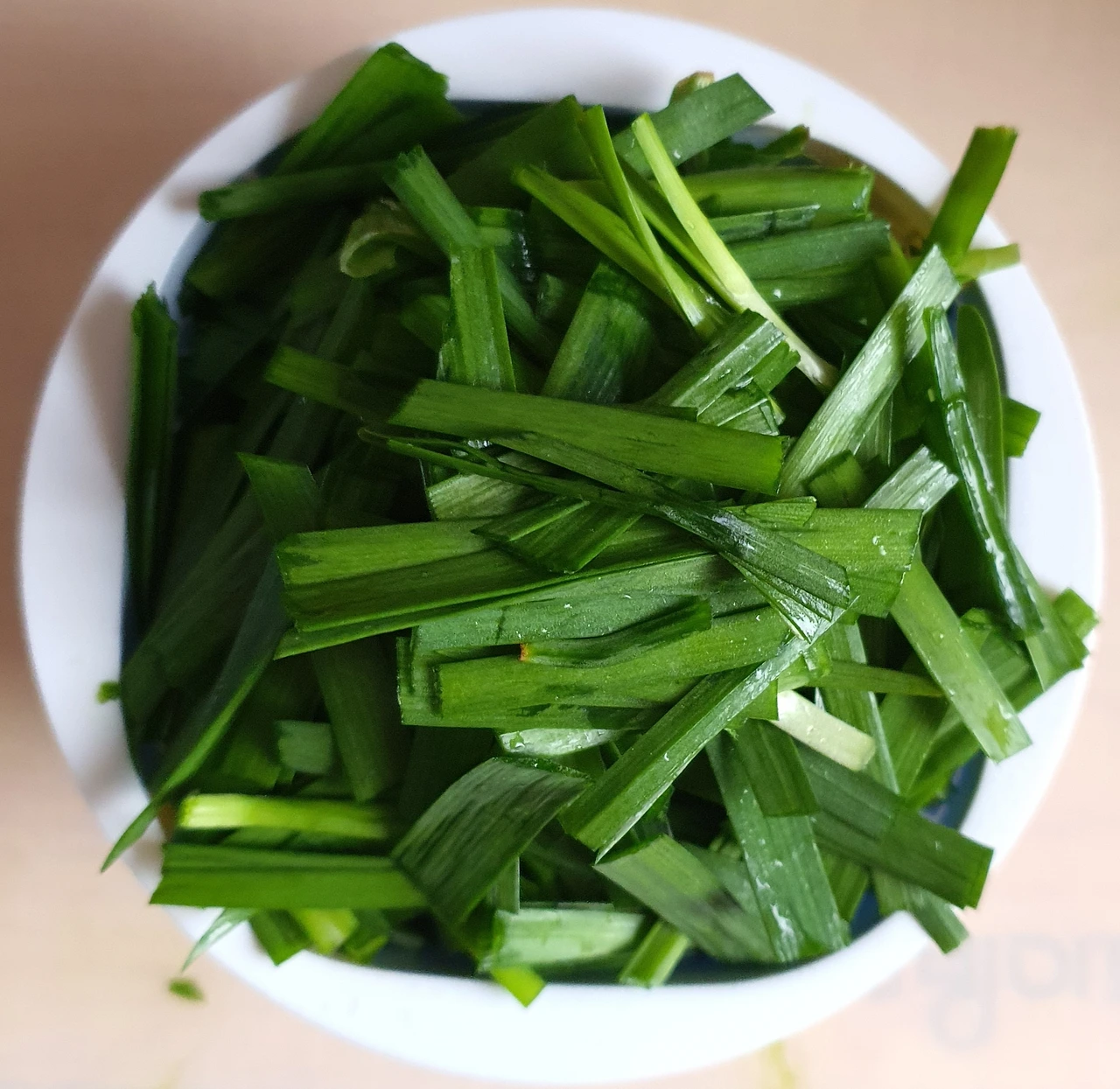 • 무는 채 썰어서 준비한다. 부추는 2~3cm로 썰어 준비한다.