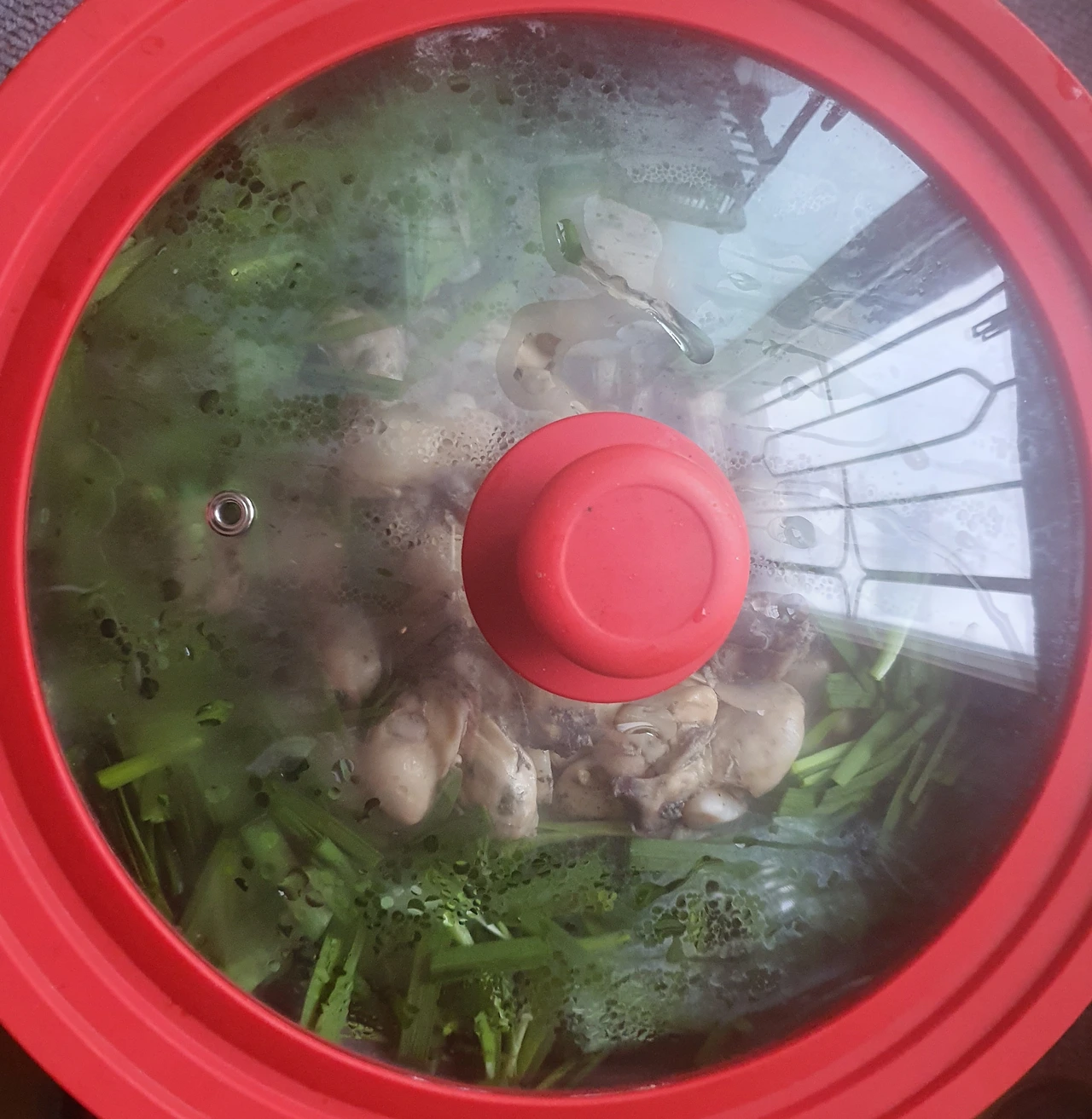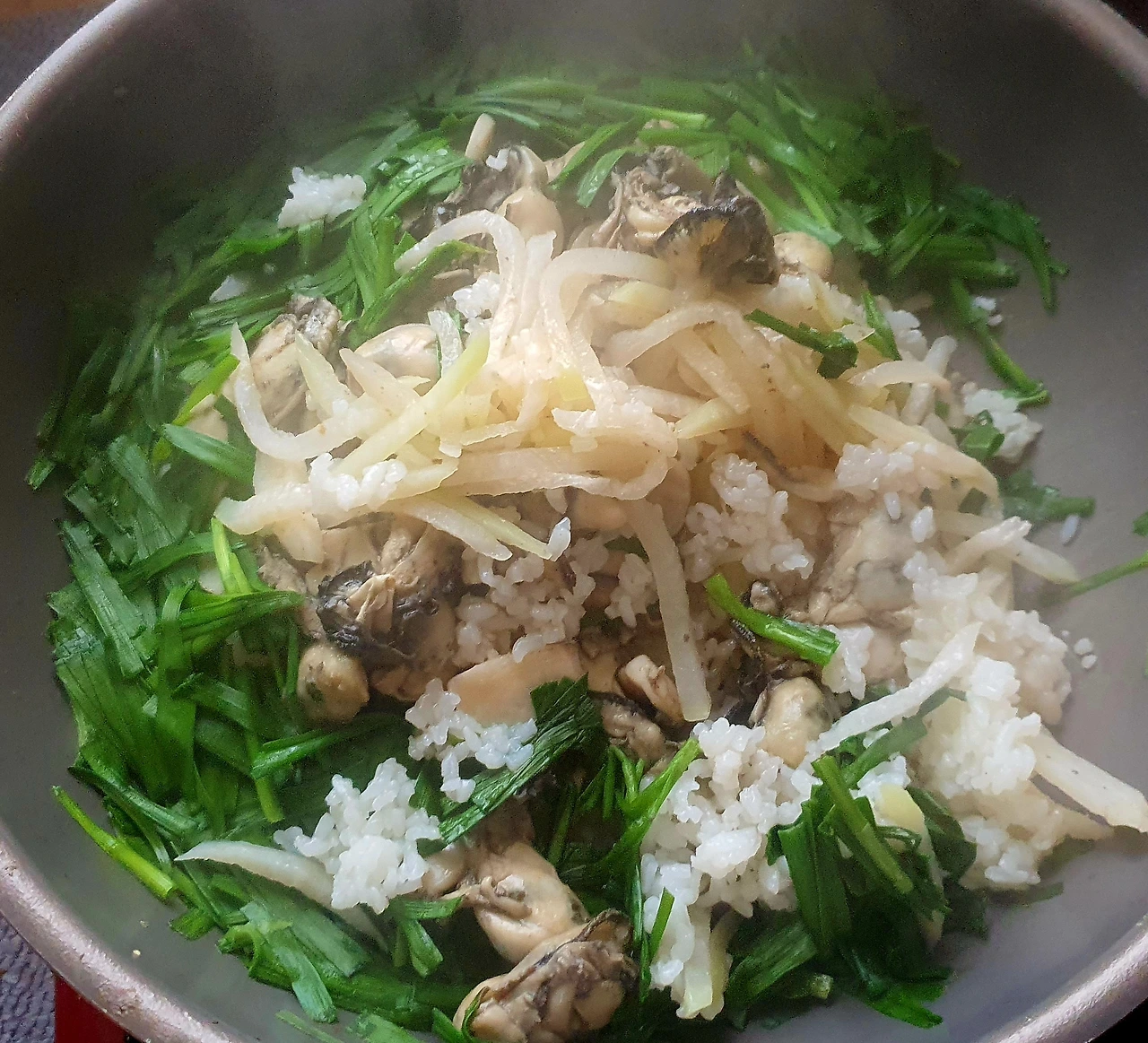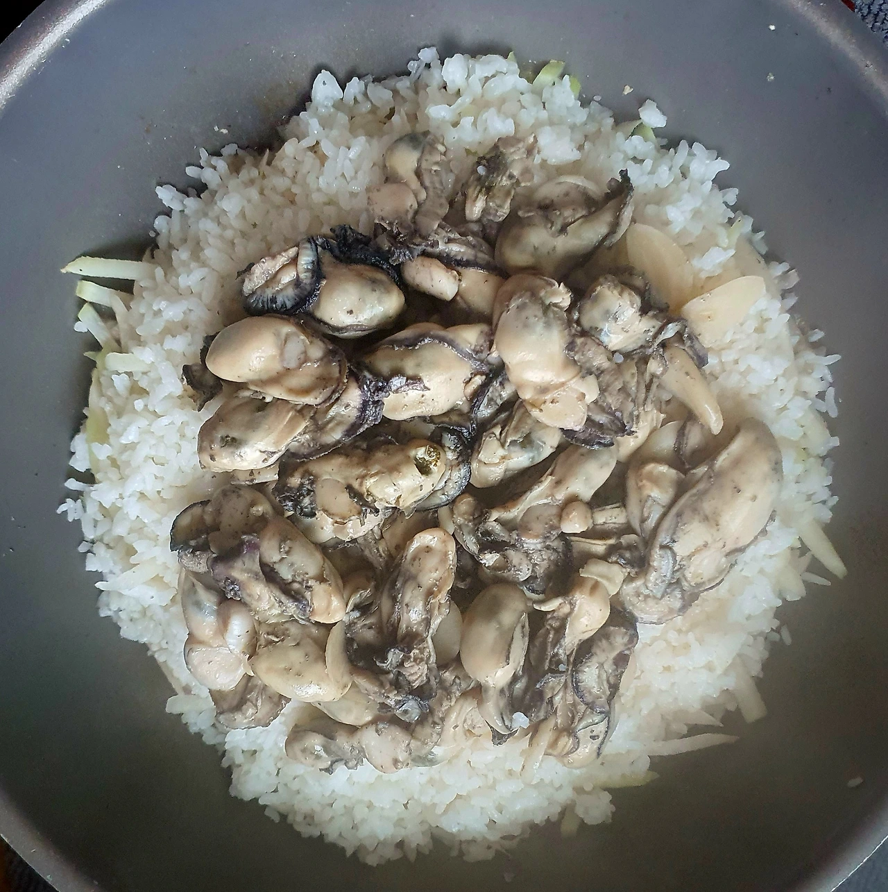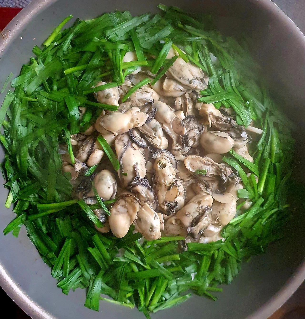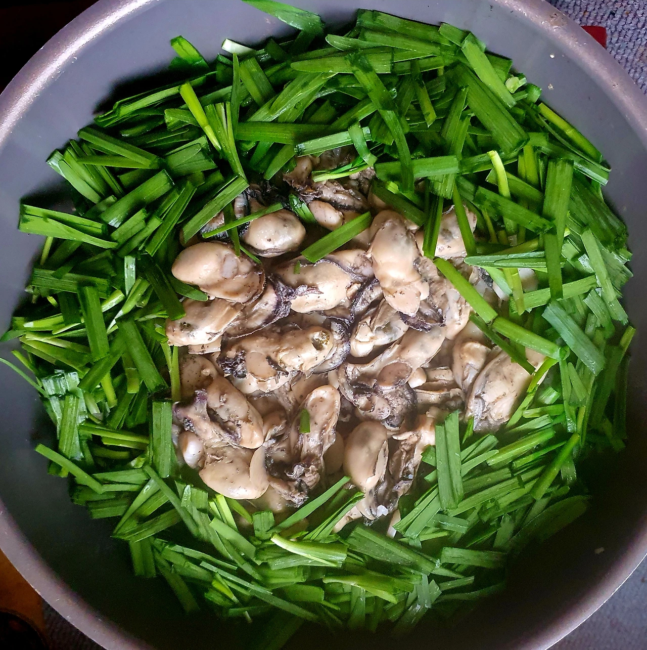 • 불을 약불로 줄이고 밥 위에 볶은 굴을 올리고 주위에 부추를 둘러주고 다시 뚜껑을 덮고 1분 정도 다시 끓여준다.