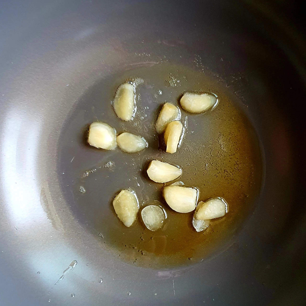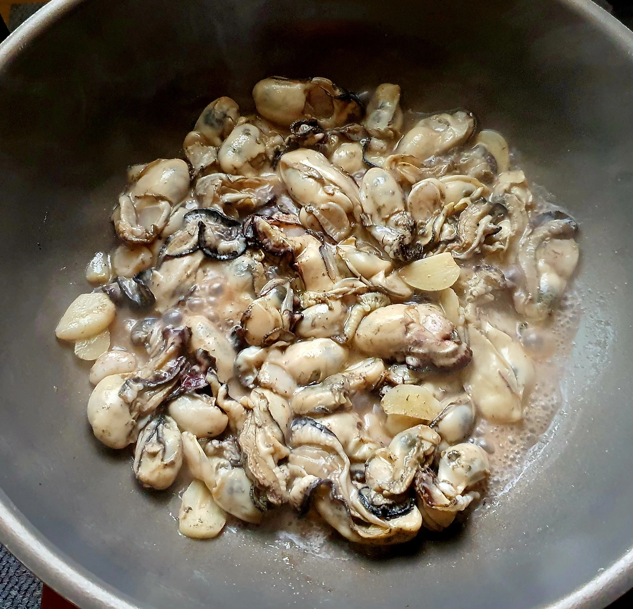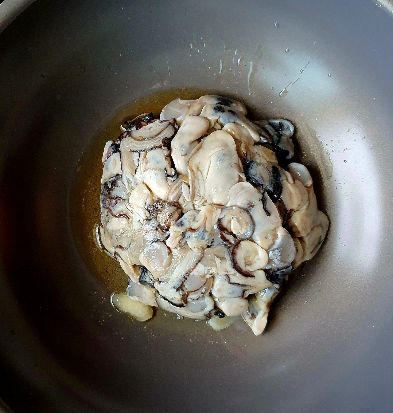 • 달군 팬에 올리브유 ½큰술. 참기름 ½큰술을 넣고 편썬 마늘을 넣고, 굴을 넣고 굴이 탱글탱글하게 살짝 볶아준다.