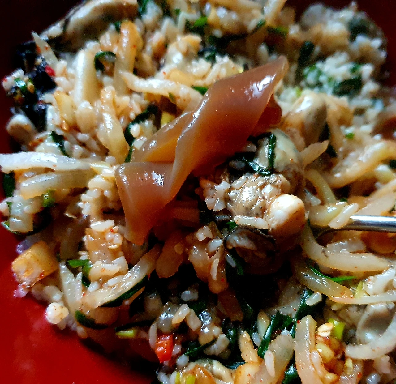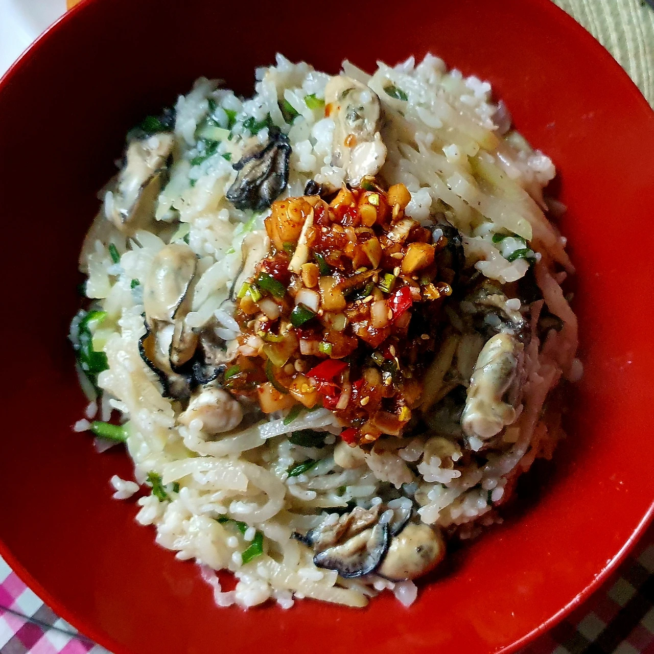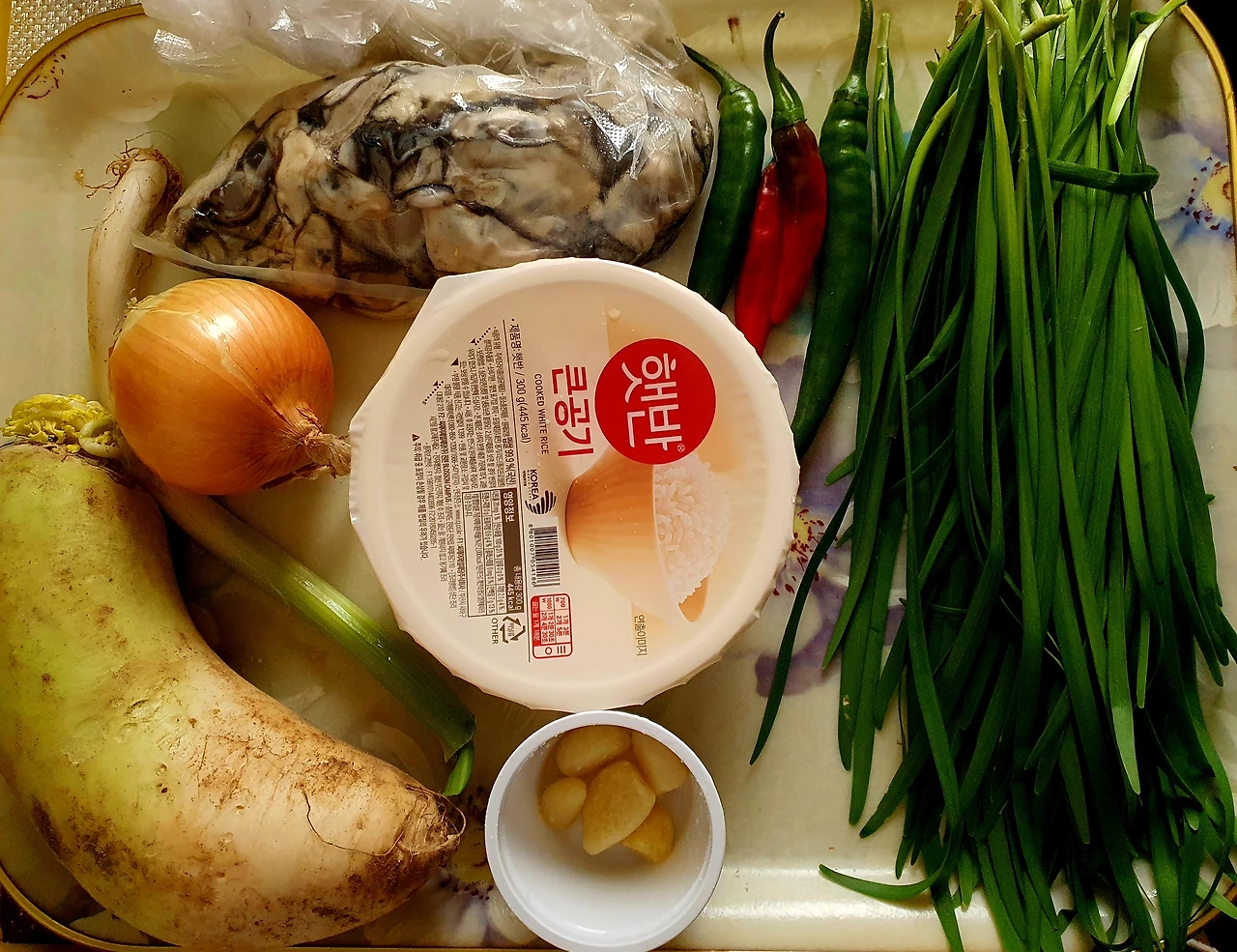 ■ 재료 : 생굴 300g 1봉. 즉석밥 300g 1개. 무 1컵. 부추 1컵. 다진 마늘 ½큰술. 올리브유+참기름. 소금