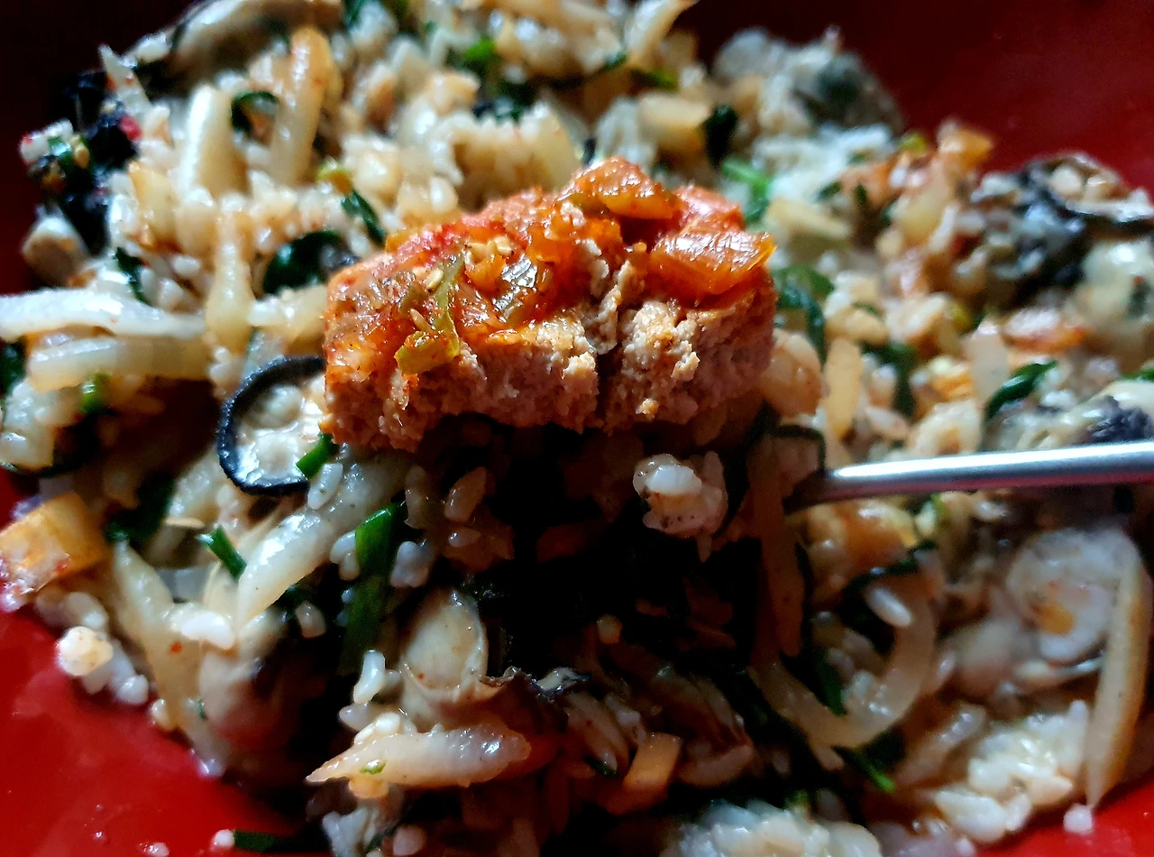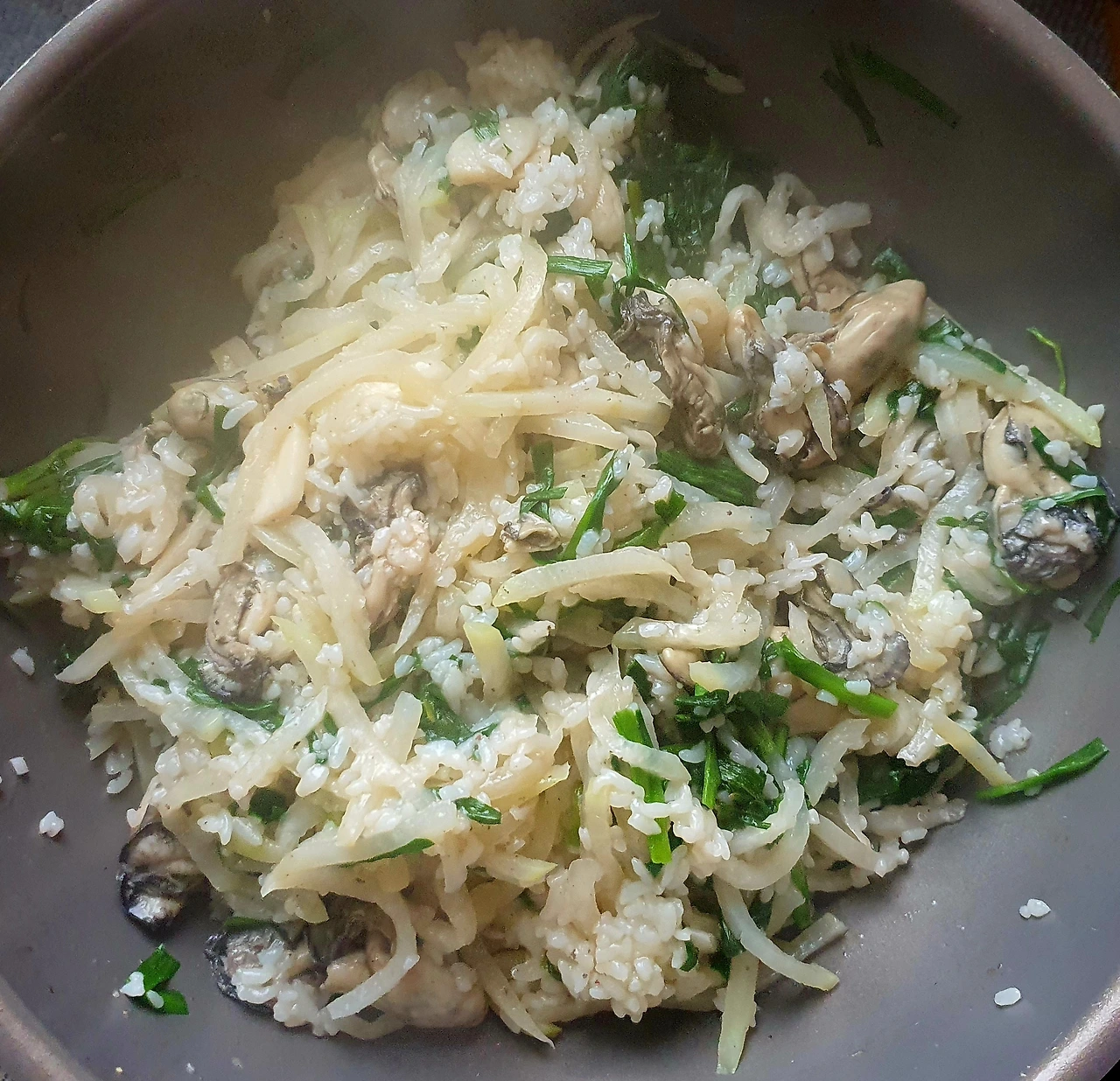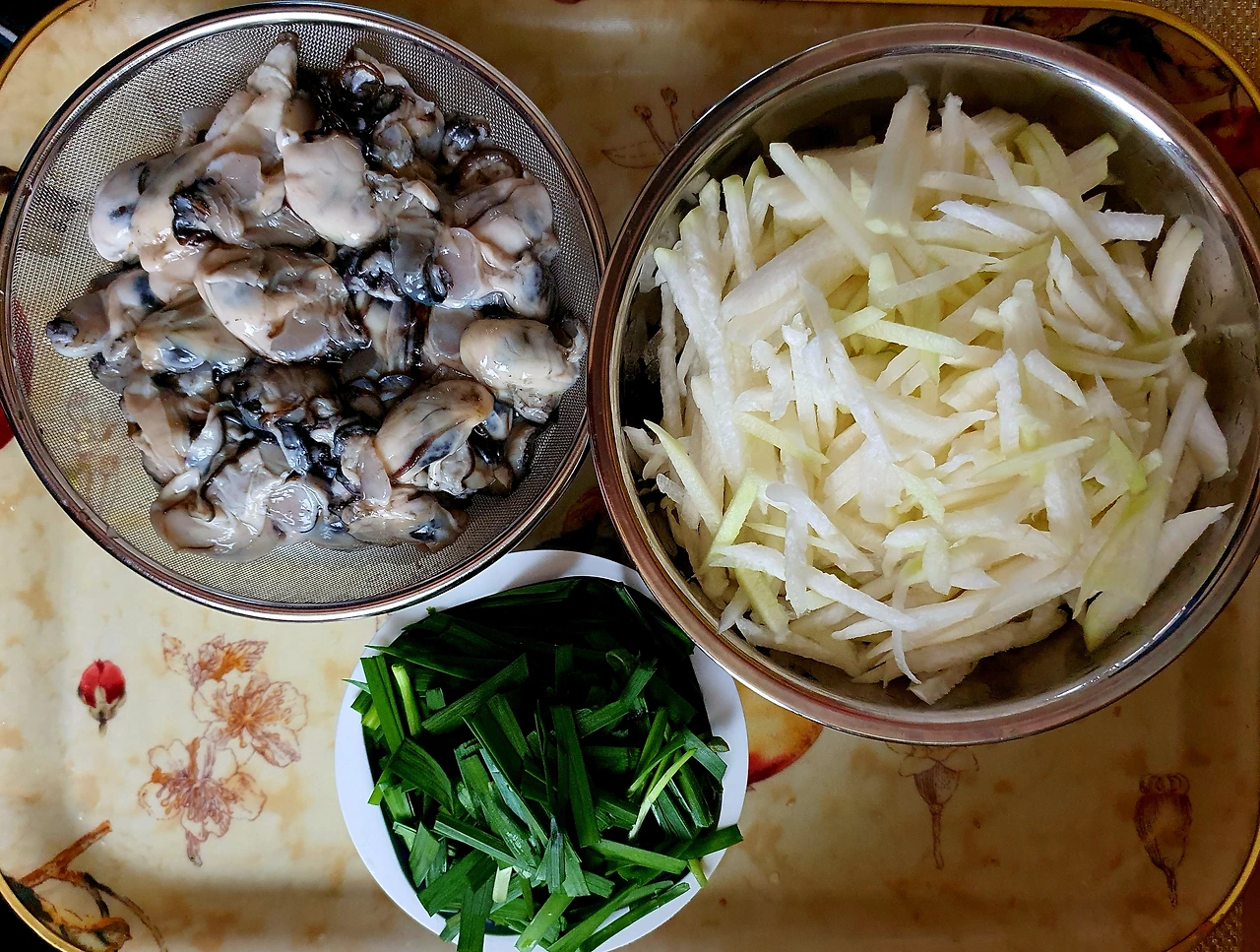 ■ 재료 : 생굴 300g 1봉. 즉석밥 300g 1개. 무 1컵. 부추 1컵. 다진 마늘 ½큰술. 올리브유+참기름. 소금