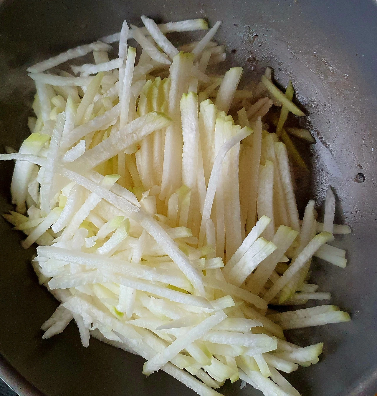• 불을 약불로 줄이고 뚜껑을 덮고 1분 정도 무를 익혀준다.