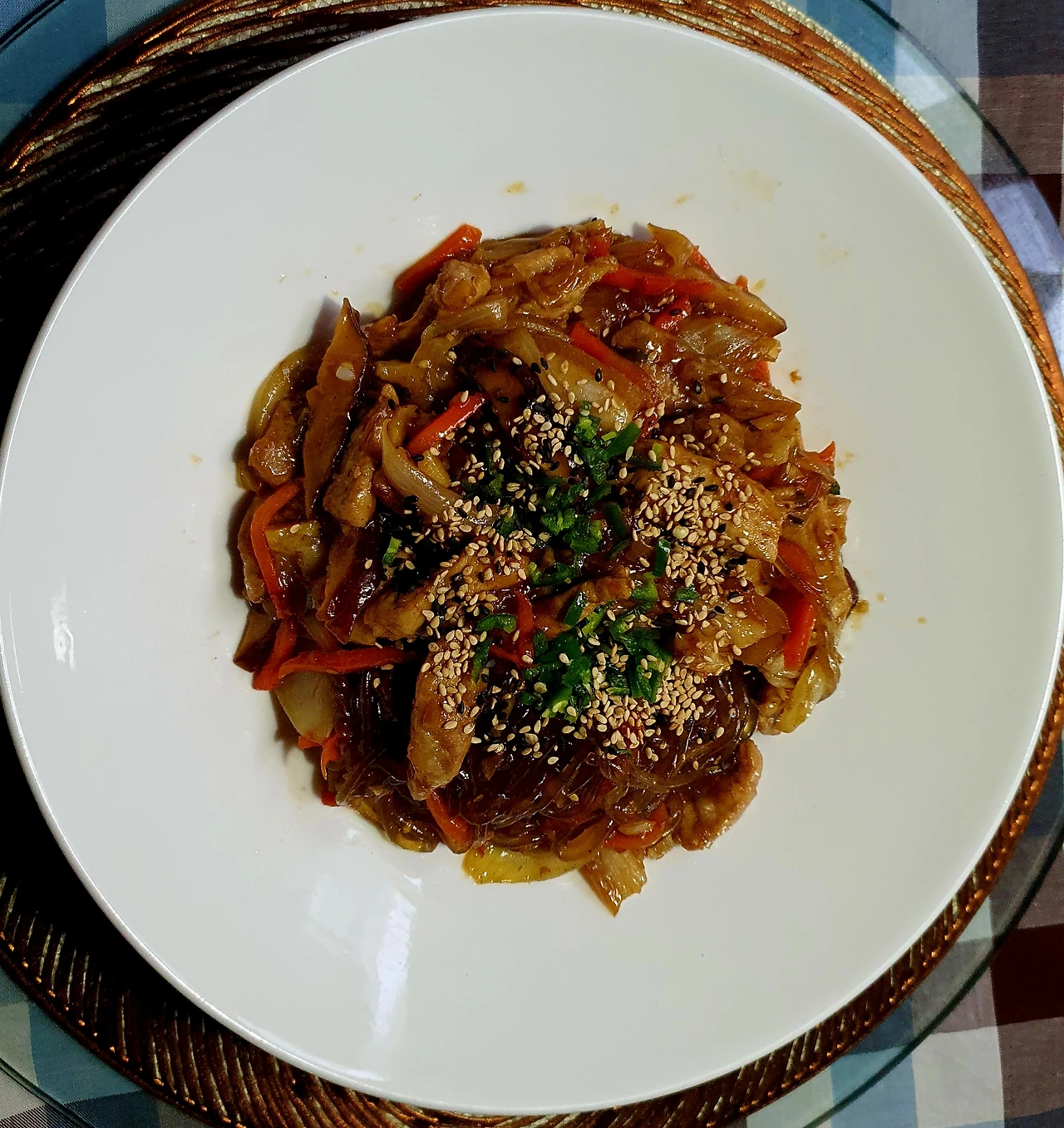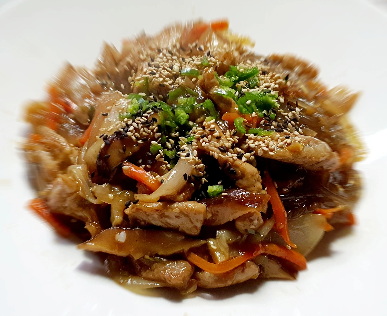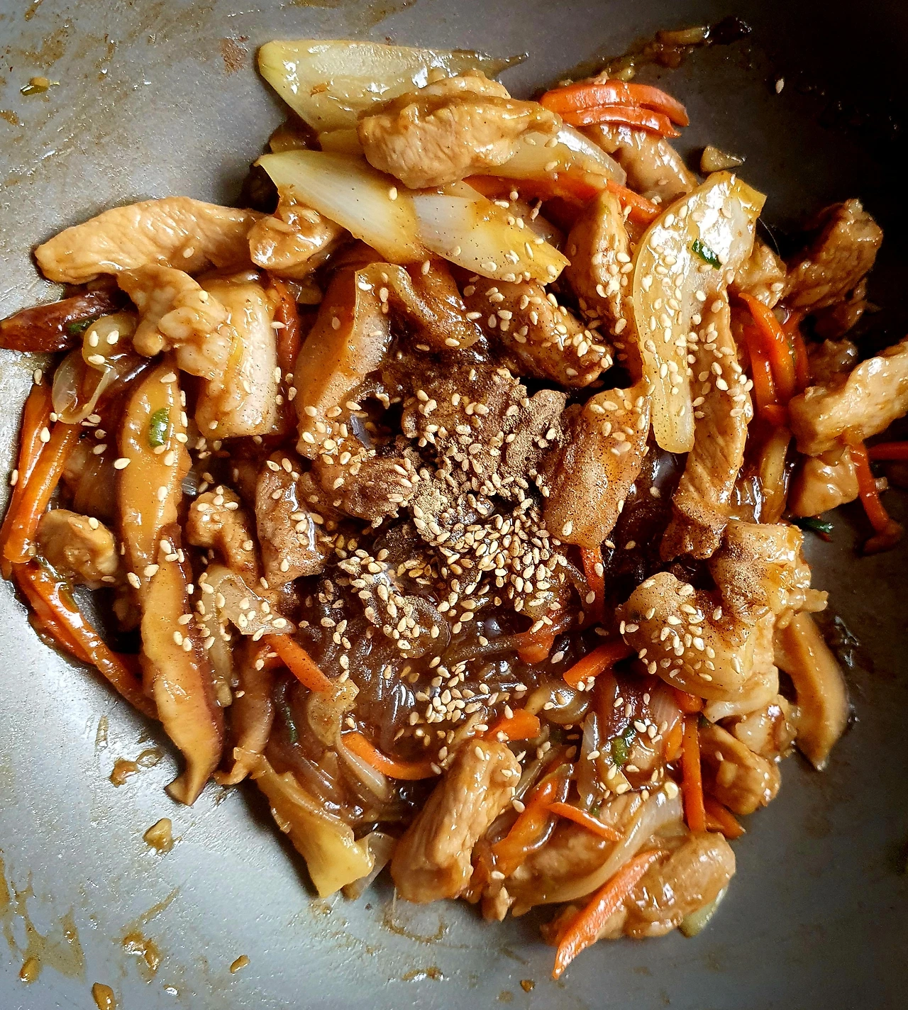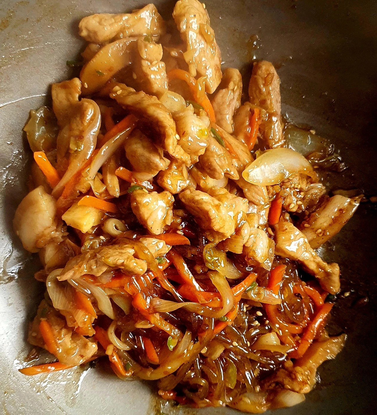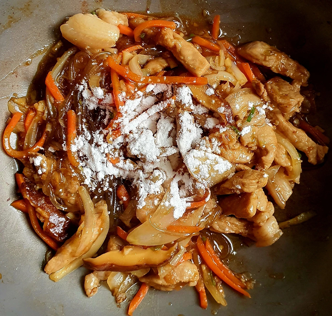 • 당면을 넣고 볶으면 고기와 채소. 양념물을 당면이 흡수하며 볶어진다.