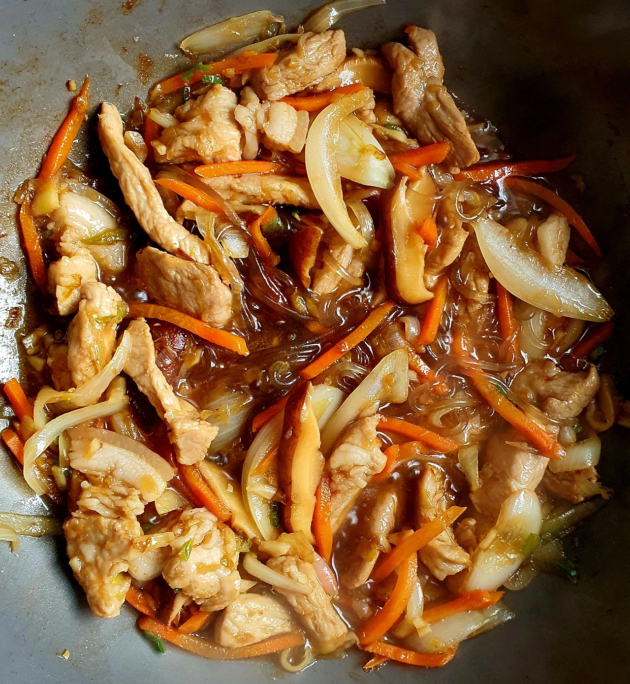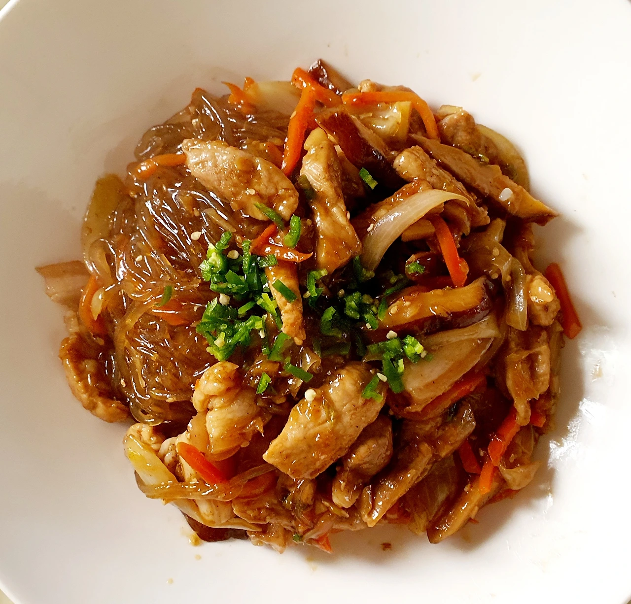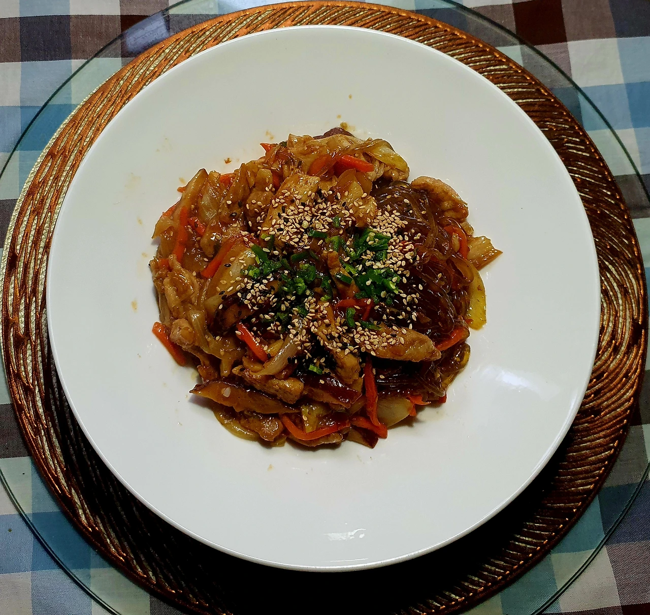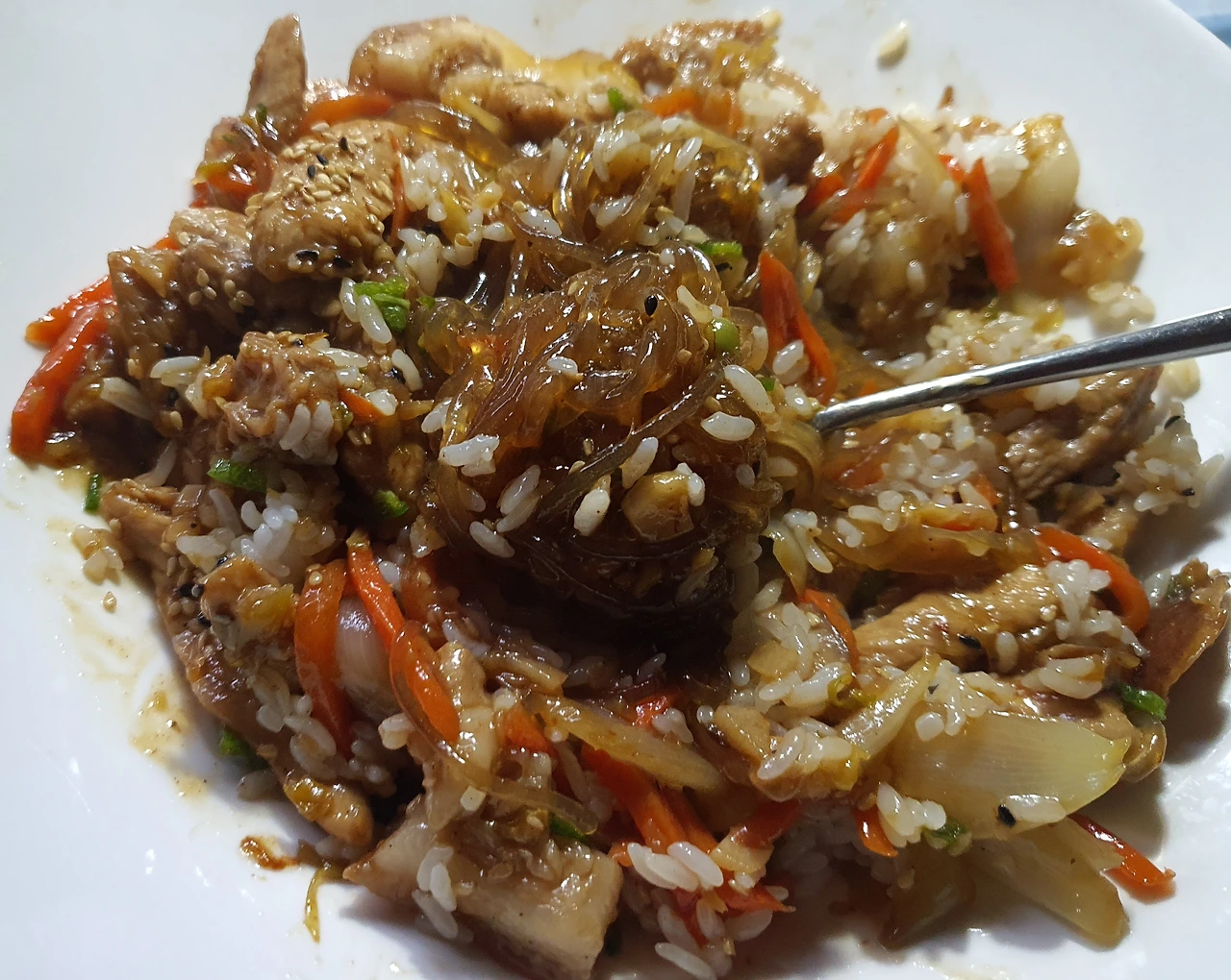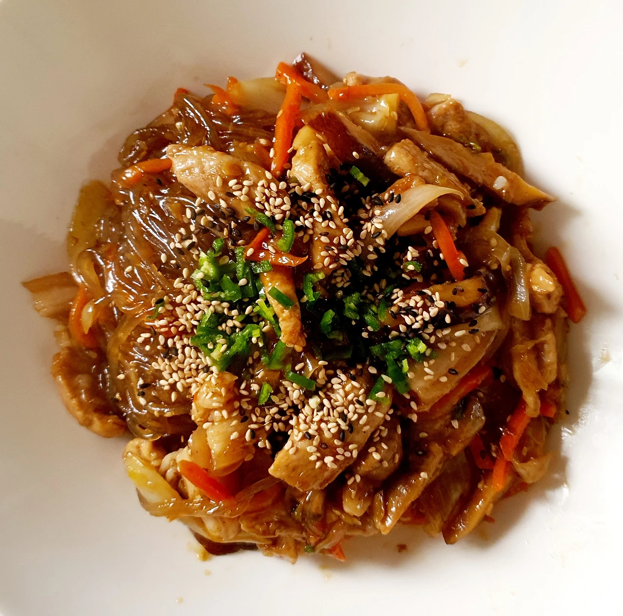 • 당면을 넣고 볶으면 고기와 채소. 양념물을 당면이 흡수하며 볶어진다.