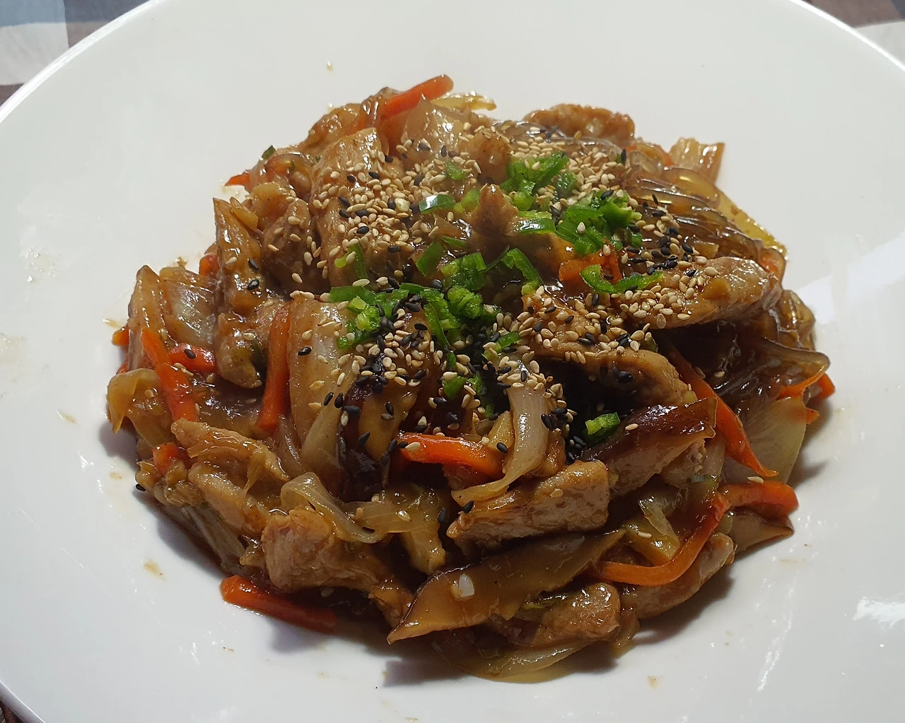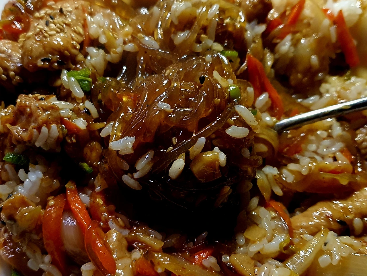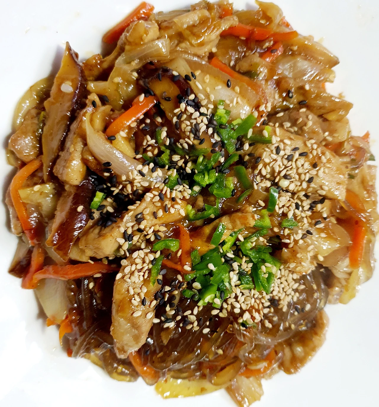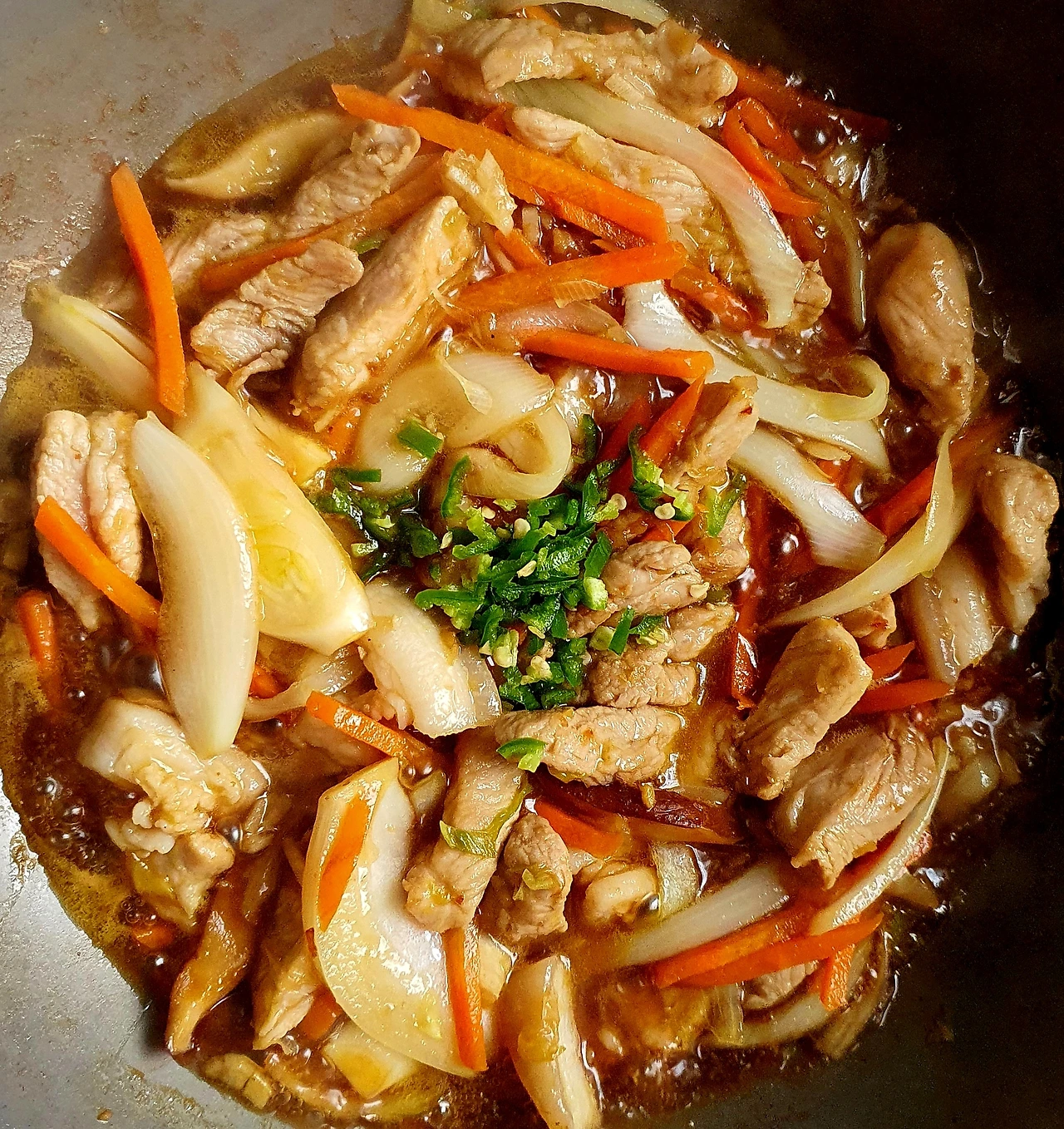• 당면을 넣고 볶으면 고기와 채소. 양념물을 당면이 흡수하며 볶어진다.