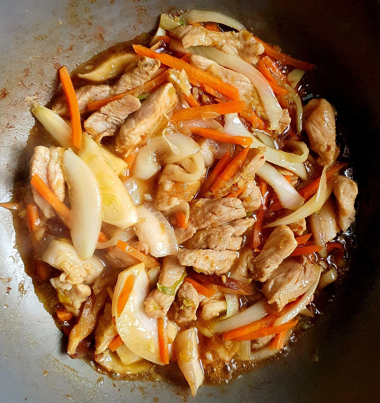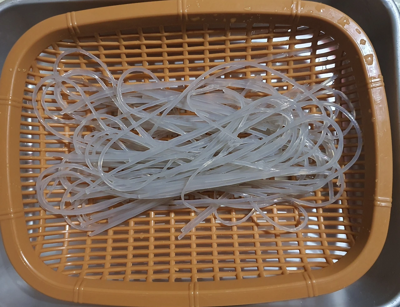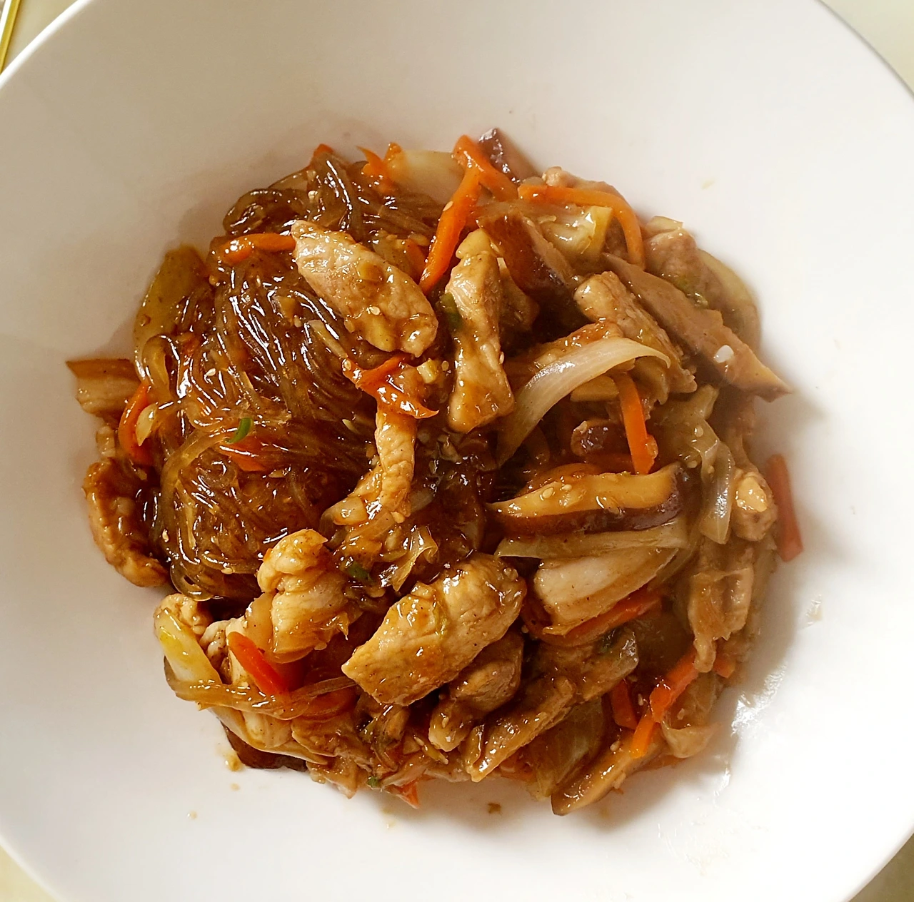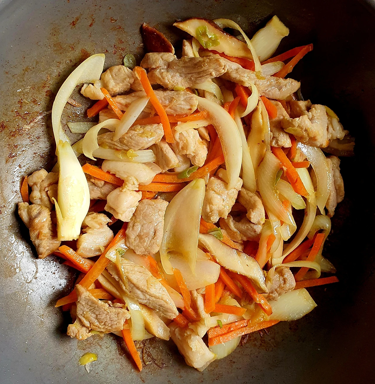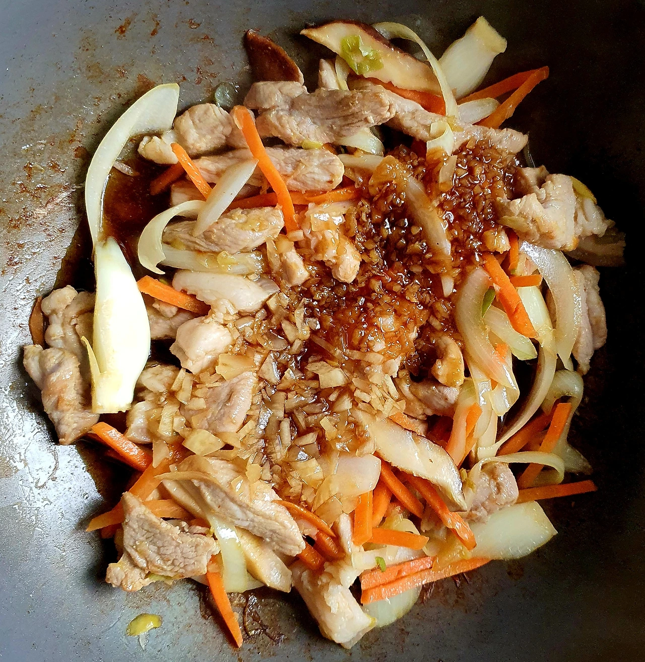 • 당면을 넣고 볶으면 고기와 채소. 양념물을 당면이 흡수하며 볶어진다.