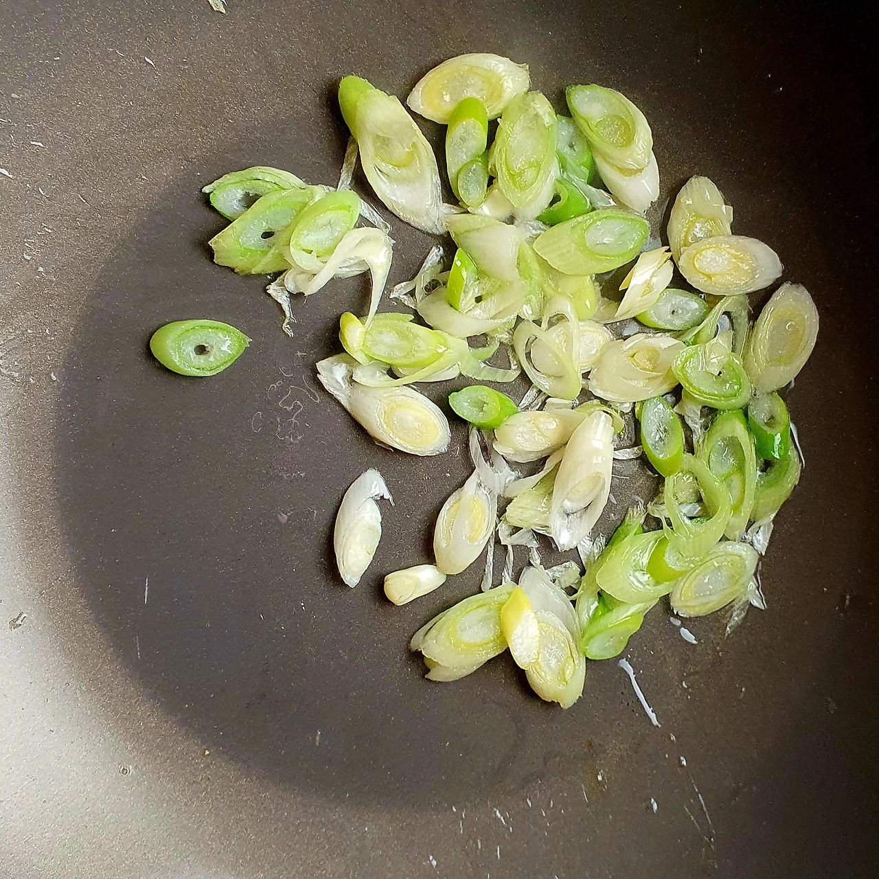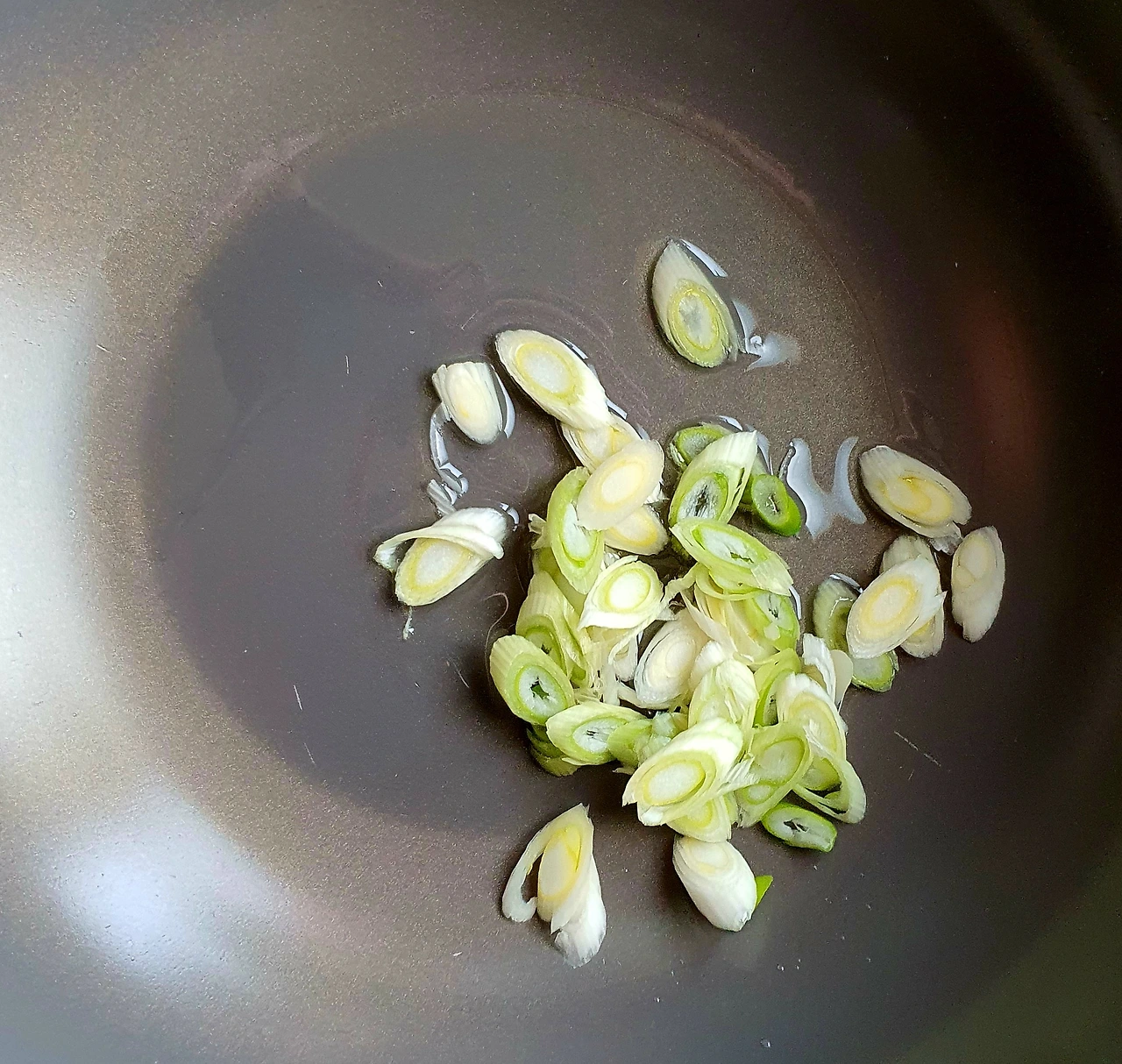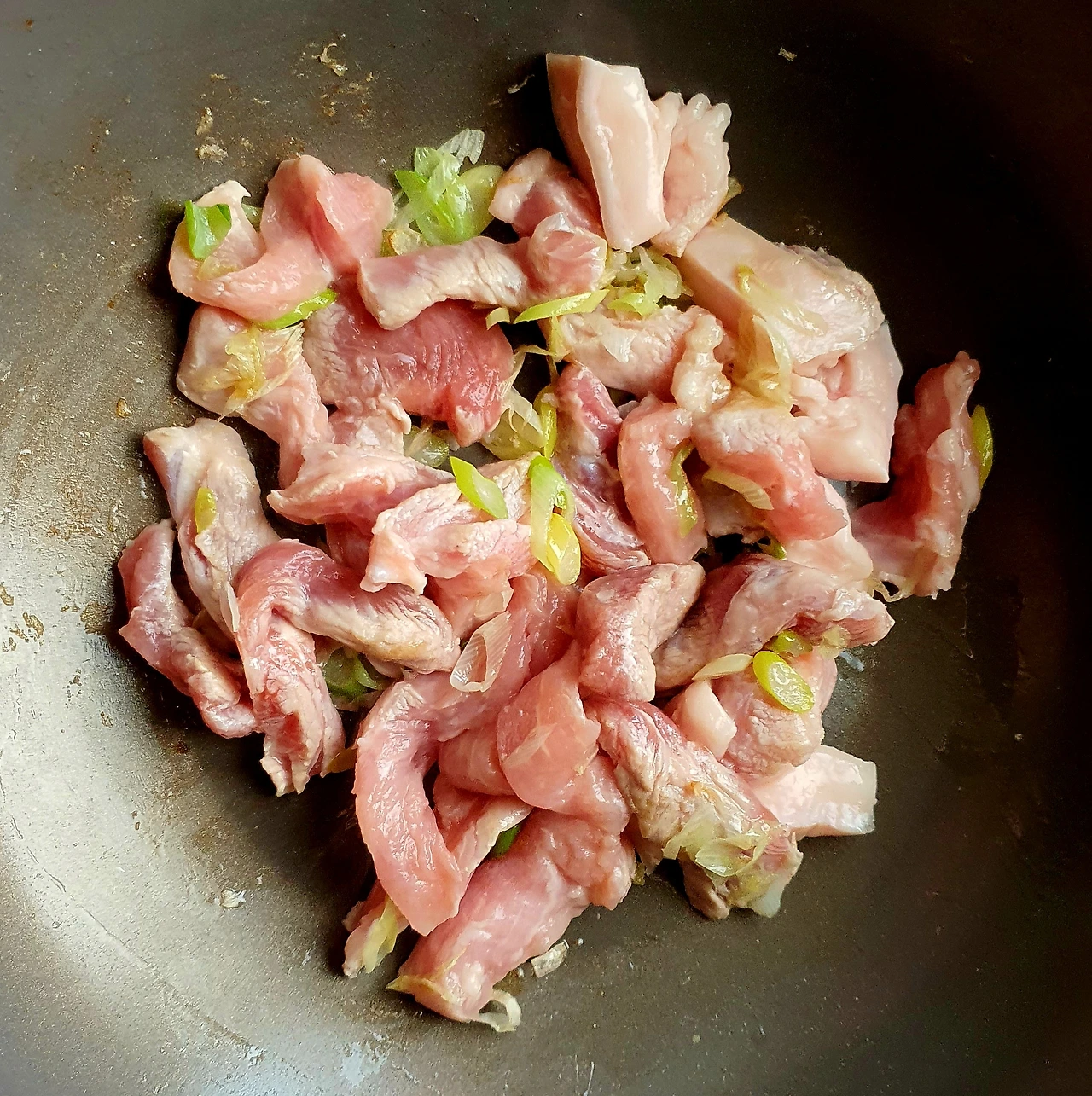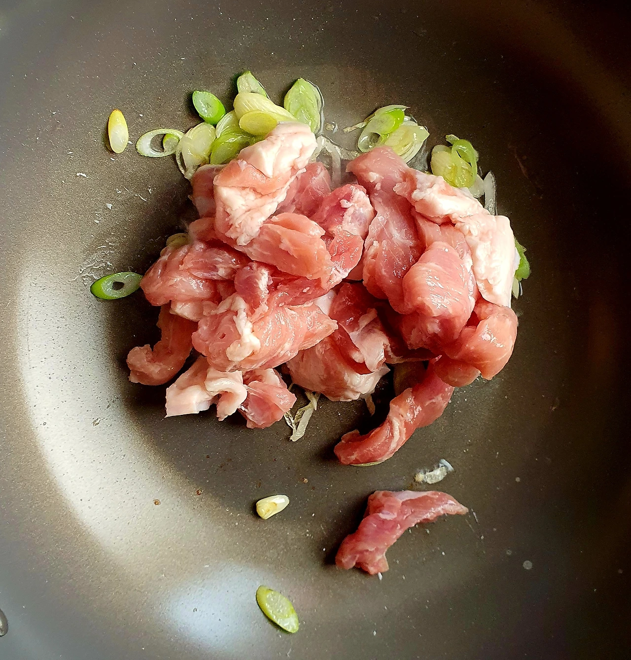 • 달군 팬에 기름을 1큰술 정도 살짝 두르고 준비한 대파를 넣고 파향을 올리고 돼지고기를 구워준다.