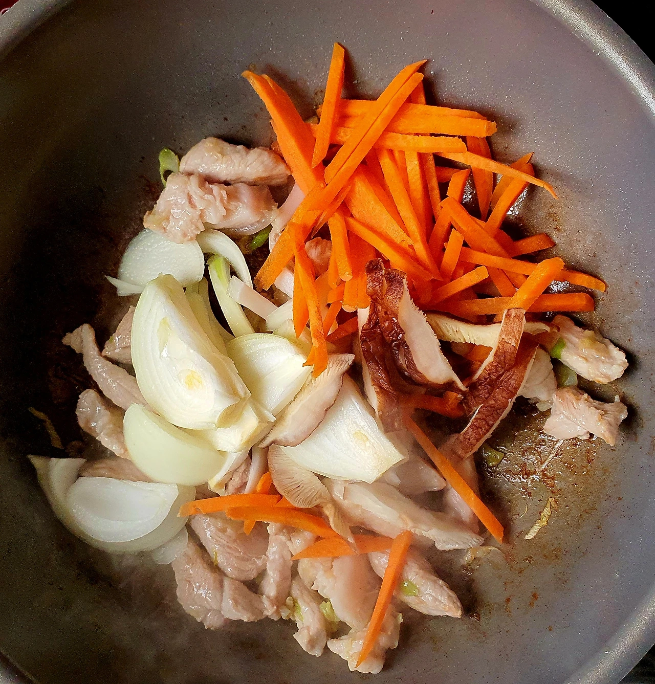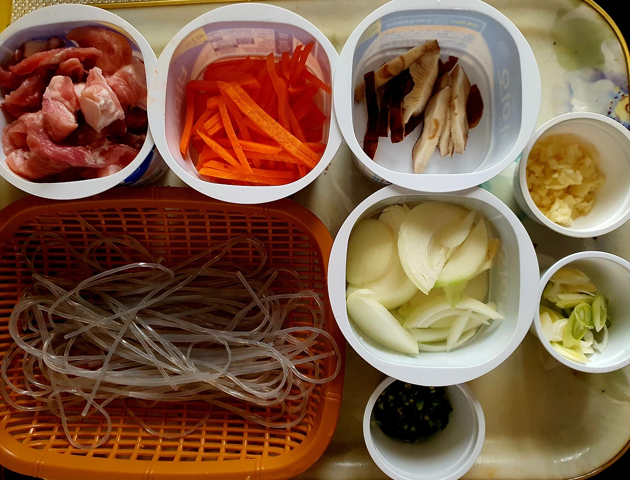 ■ 재료 : 돼지전지 300g, 대파 1대, 양파 ½개, 당근 ¼개, 청양고추 1개, 마늘 5톨, 건표고버섯 2개, 밥 ½공기, 당면 조금, 전분가루 1큰술, 통깨 약간, 참기름 1큰술, 후춧가루