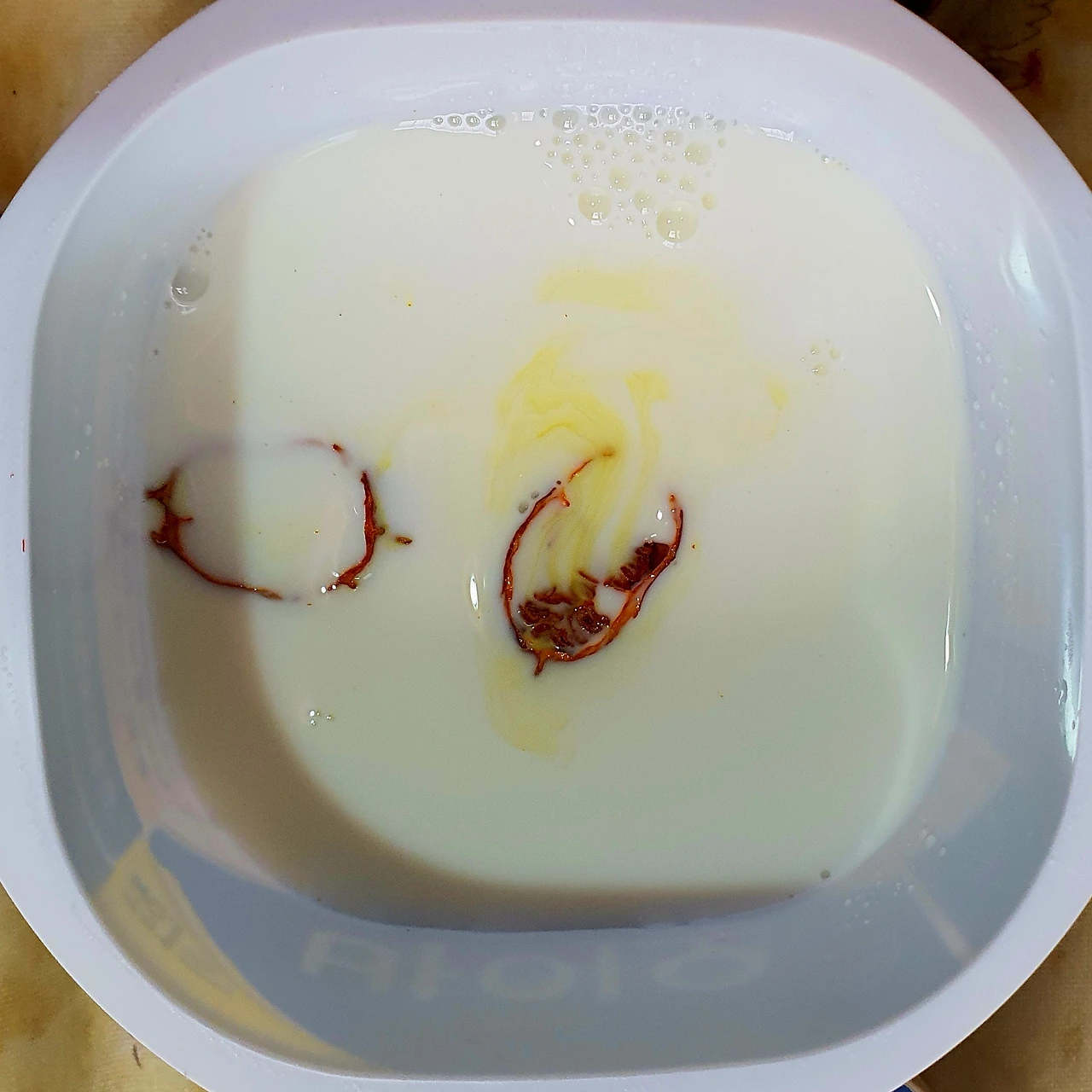 • 우유 ½컵에 치자를 넣고 색을 내준다. 색을 내기 위한 치자가 없으면 생략해도 된다.