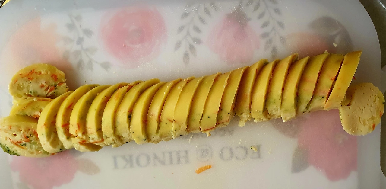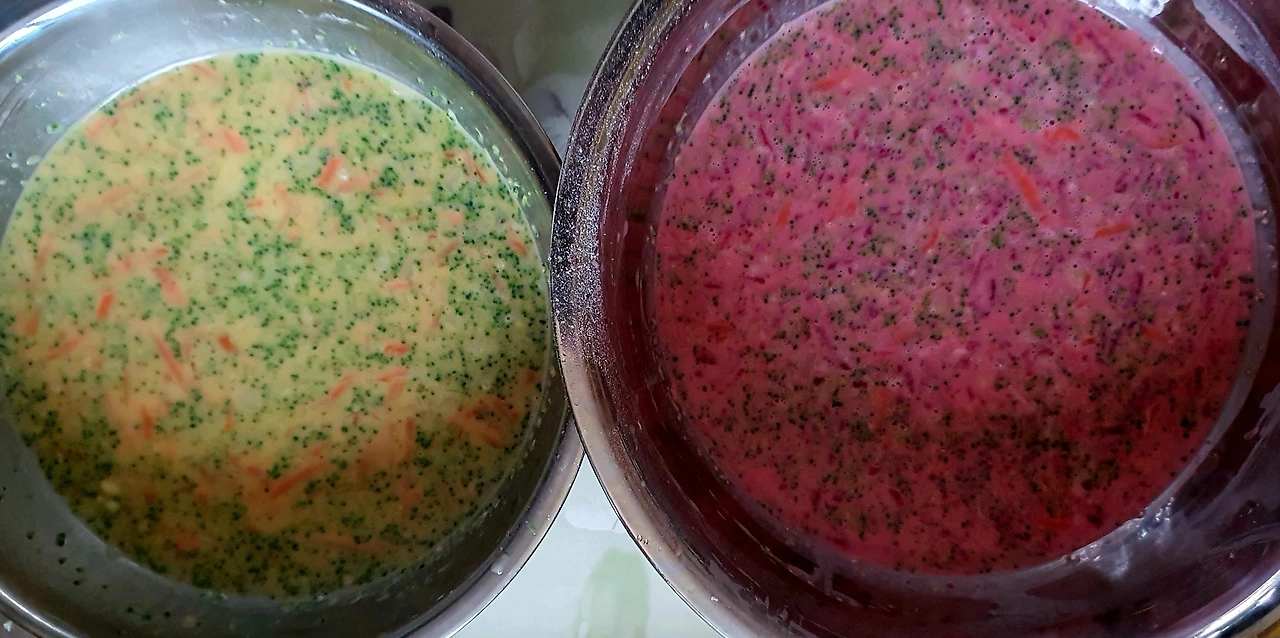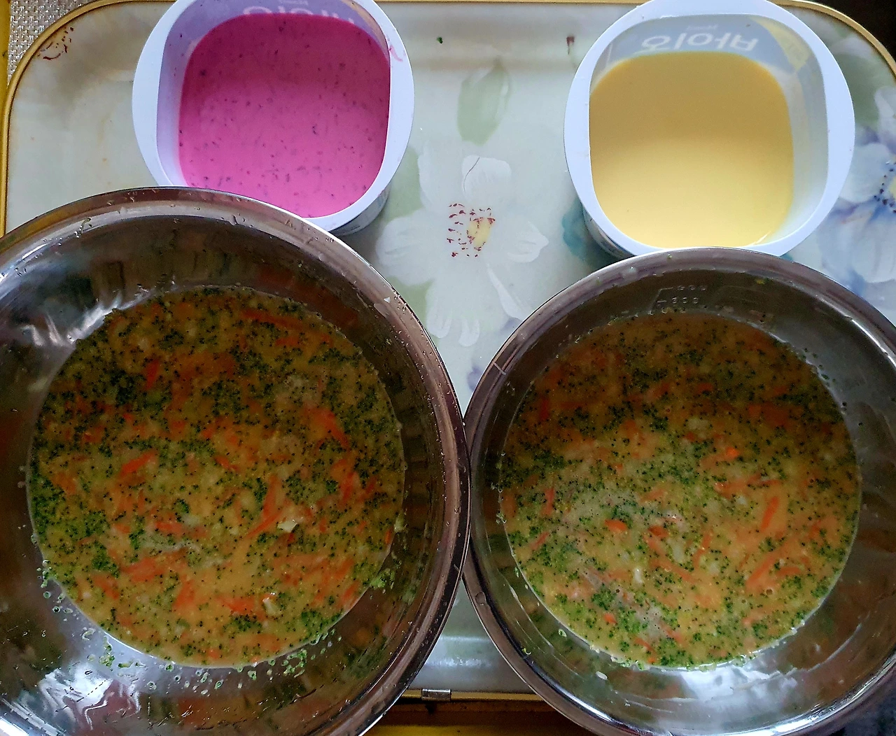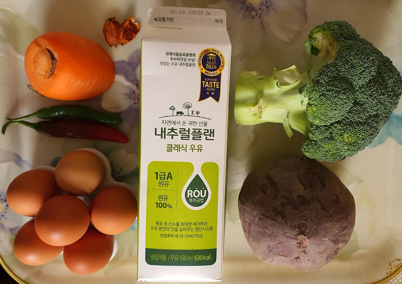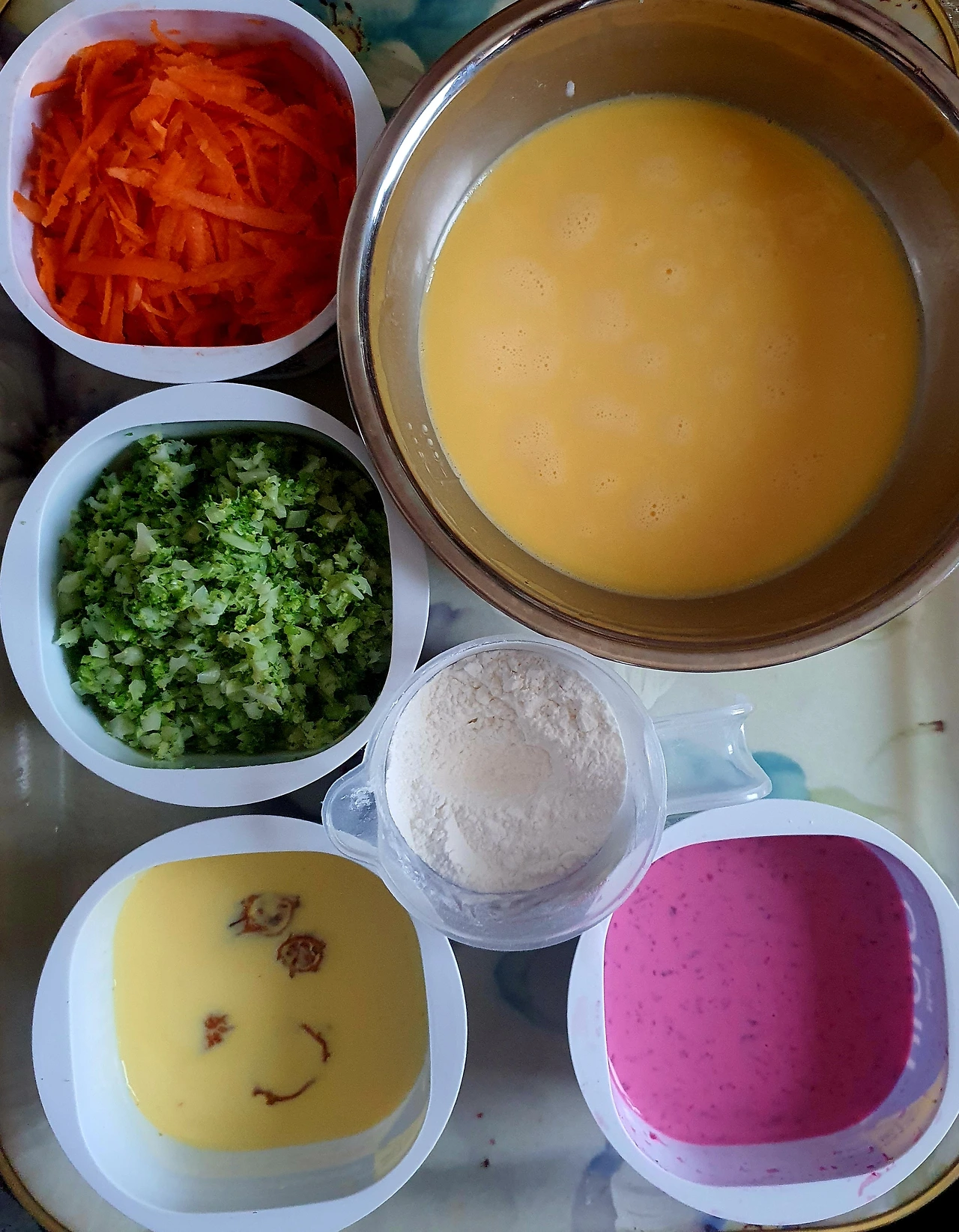 ■ 재료 : 달걀 6개. 브로콜리½컵. 당근 ½컵. 우유 ½컵. 전분 ½컵. 소금 ½큰술. 설탕 ½큰술. 마요네즈 1큰술. 치자 1개. 비트 조금