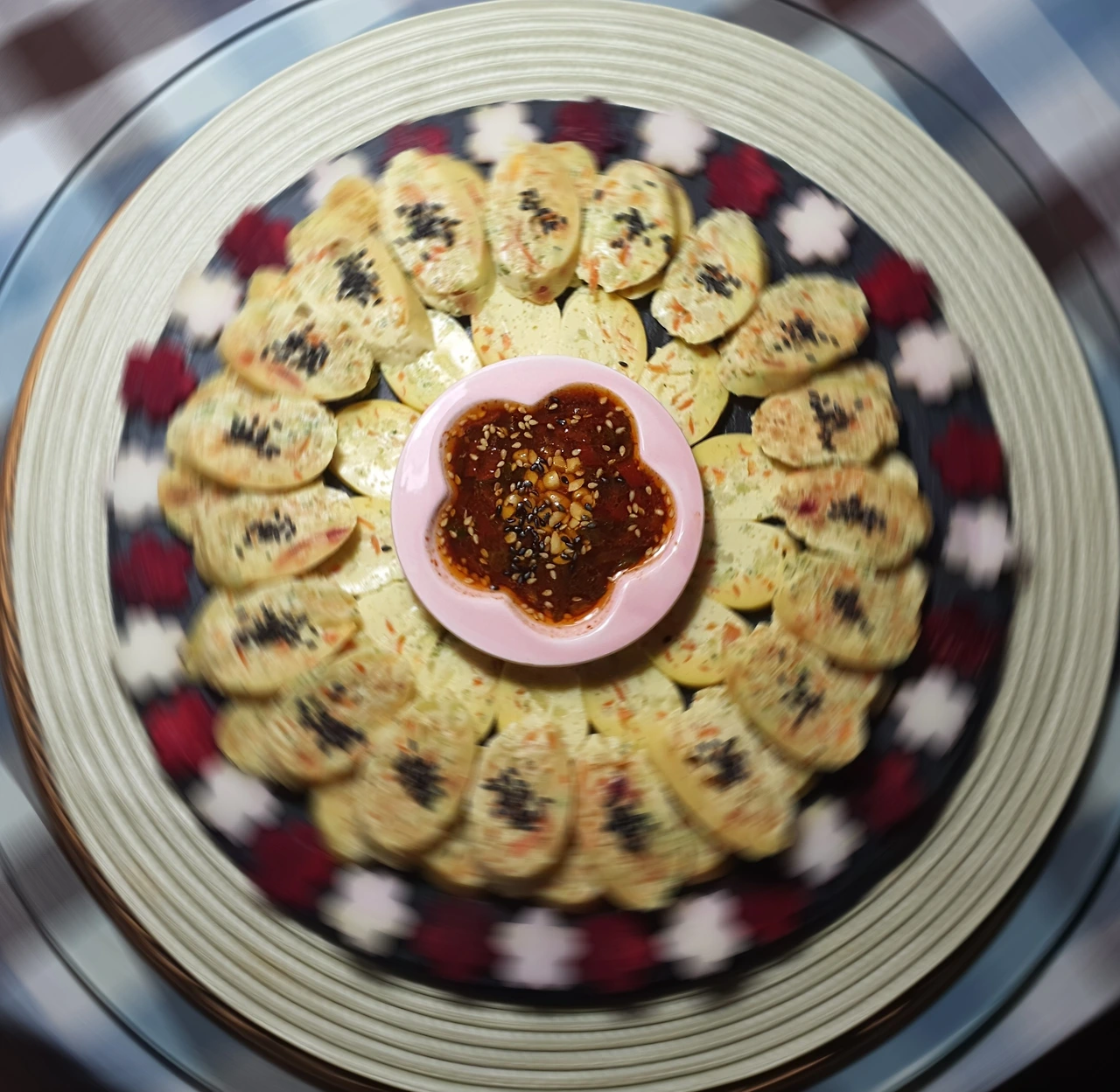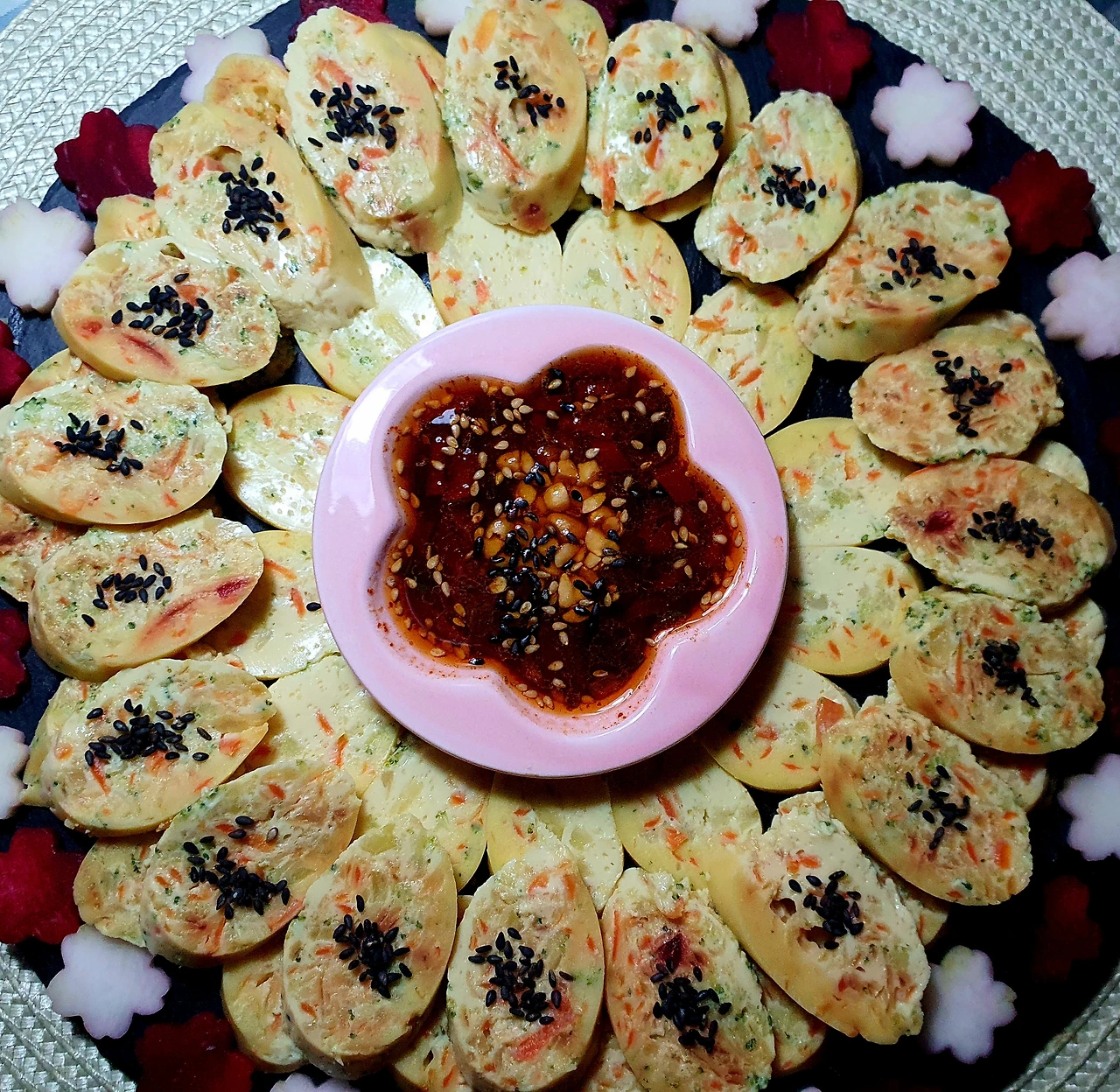 • 삶아진 달걀소시지는 찬물에 담가 식힌 후에 비닐을 벗겨내서 먹기 좋게 썰어 준다. 지금 보면 치자나 비트가 구분할 수 없어짐.