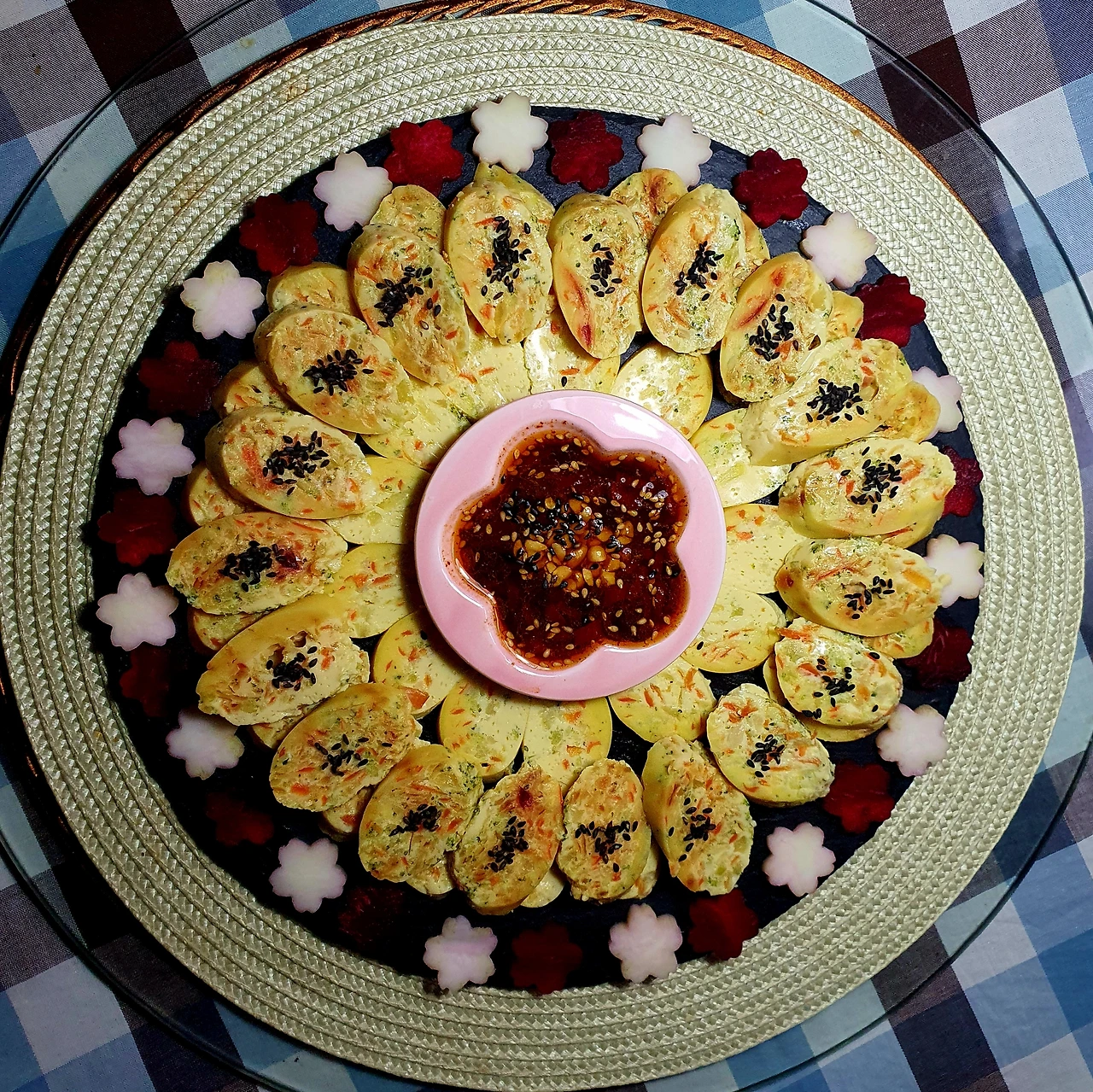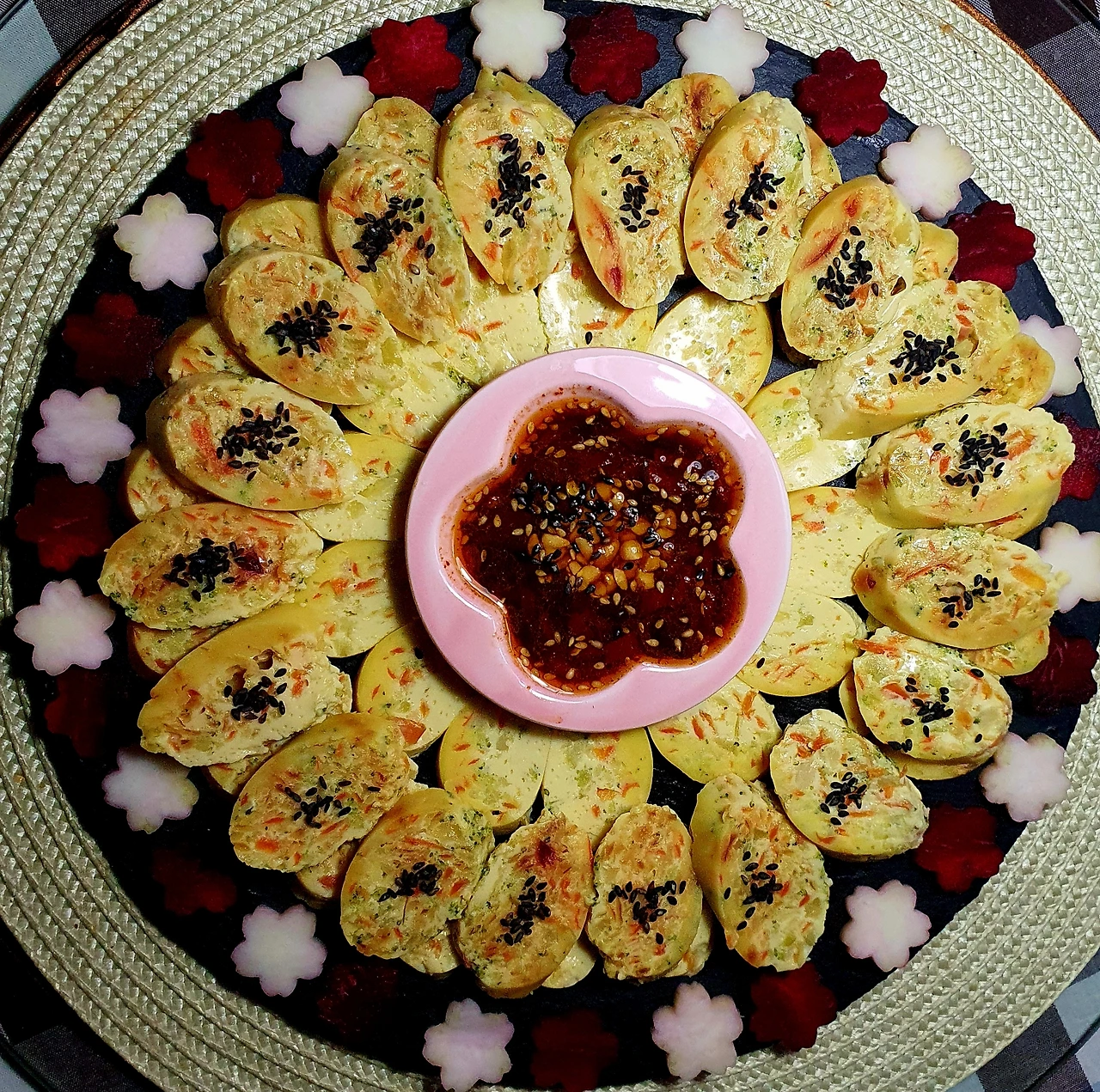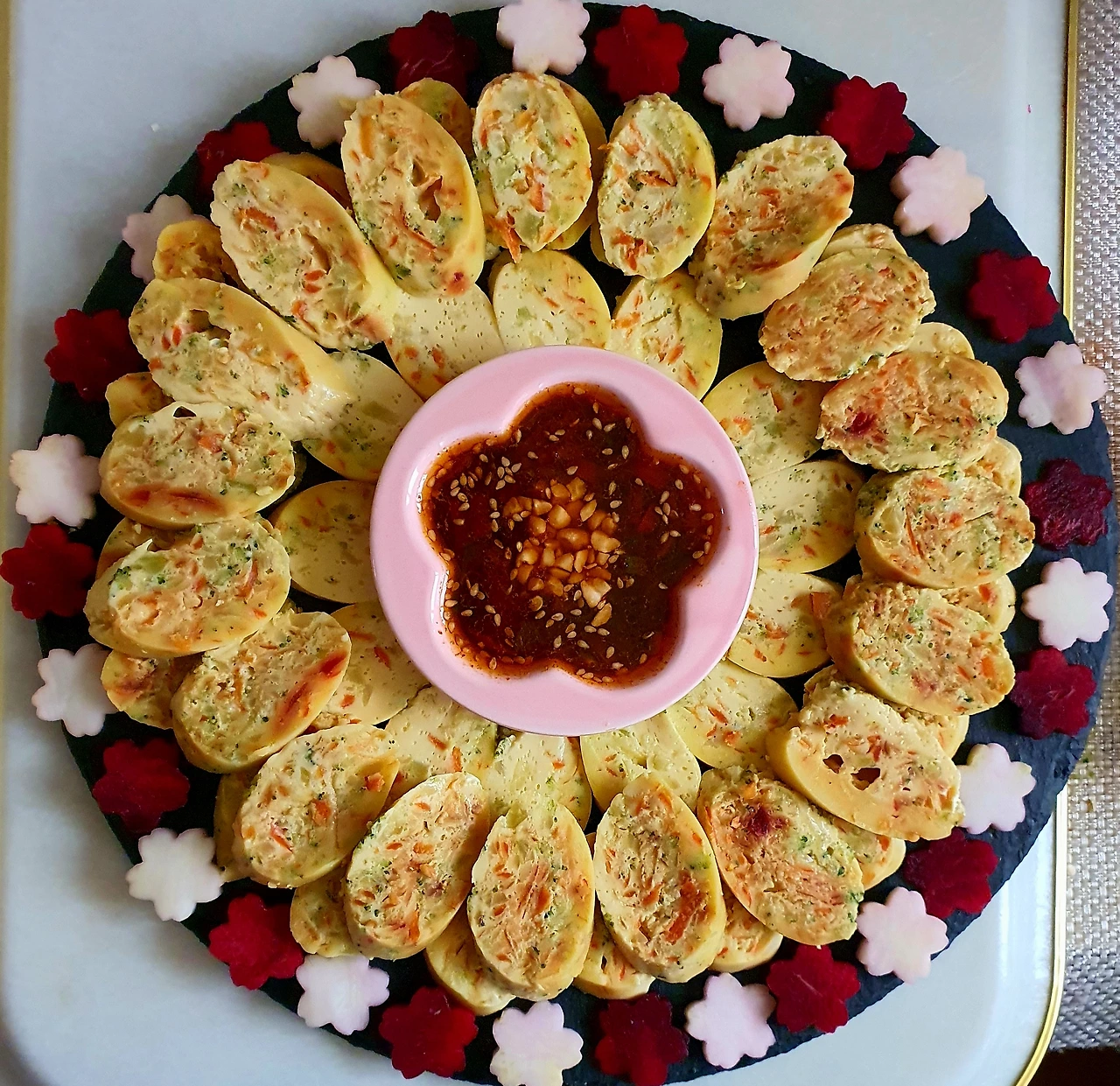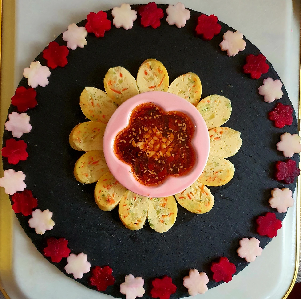 • 완성접시에 소스와 함께 보기 좋게 담으면 완성. 브로콜리 밑동과 비트로 꽃으로 찍어 데코로 사용