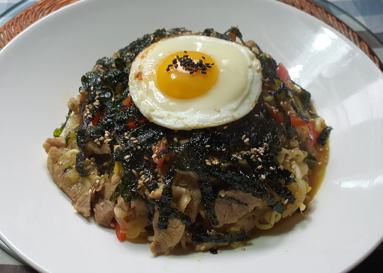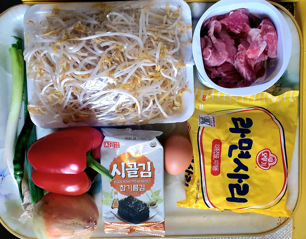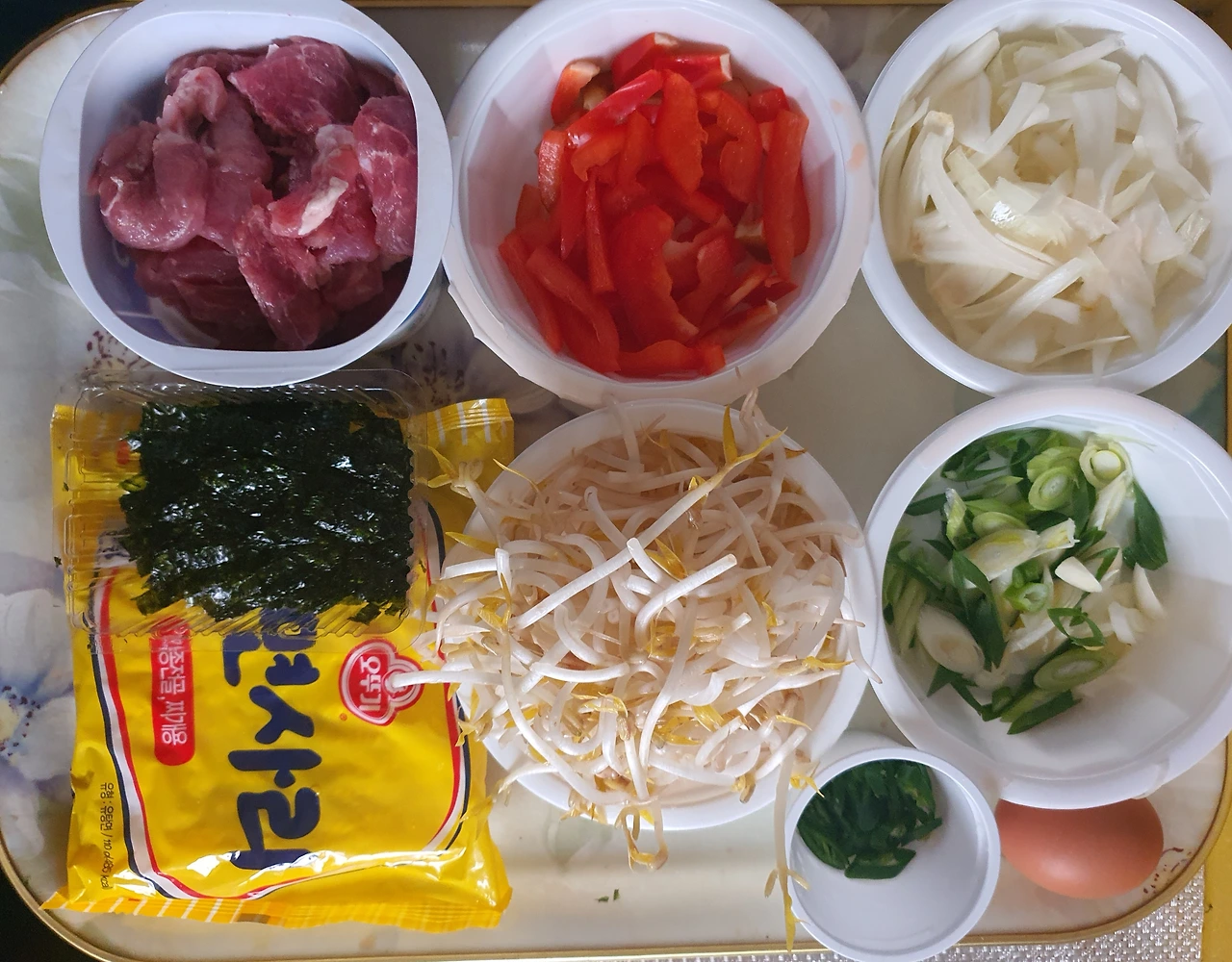 ■ 재료 : 사리라면 1½개. 돼지고기 300g. 양파 ½개. 대파 ½대. 파프리카 ½개. 청양고추 1개. 숙주나물 1컵. 달걀 1개. 김가루 조금. 통깨