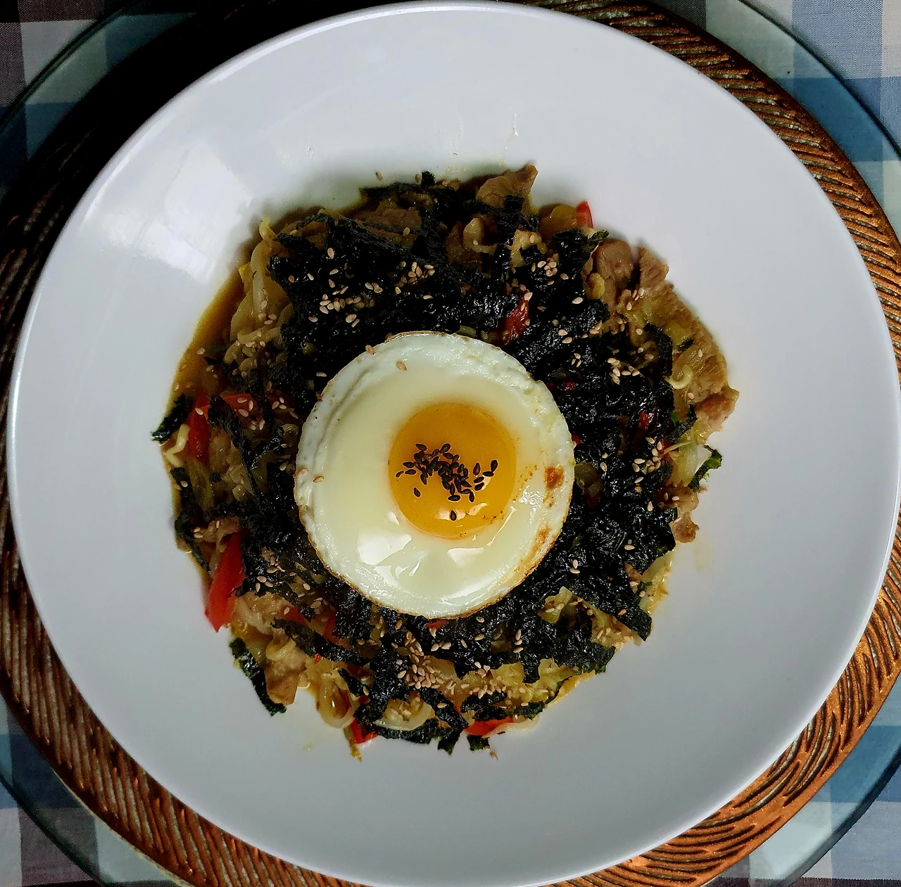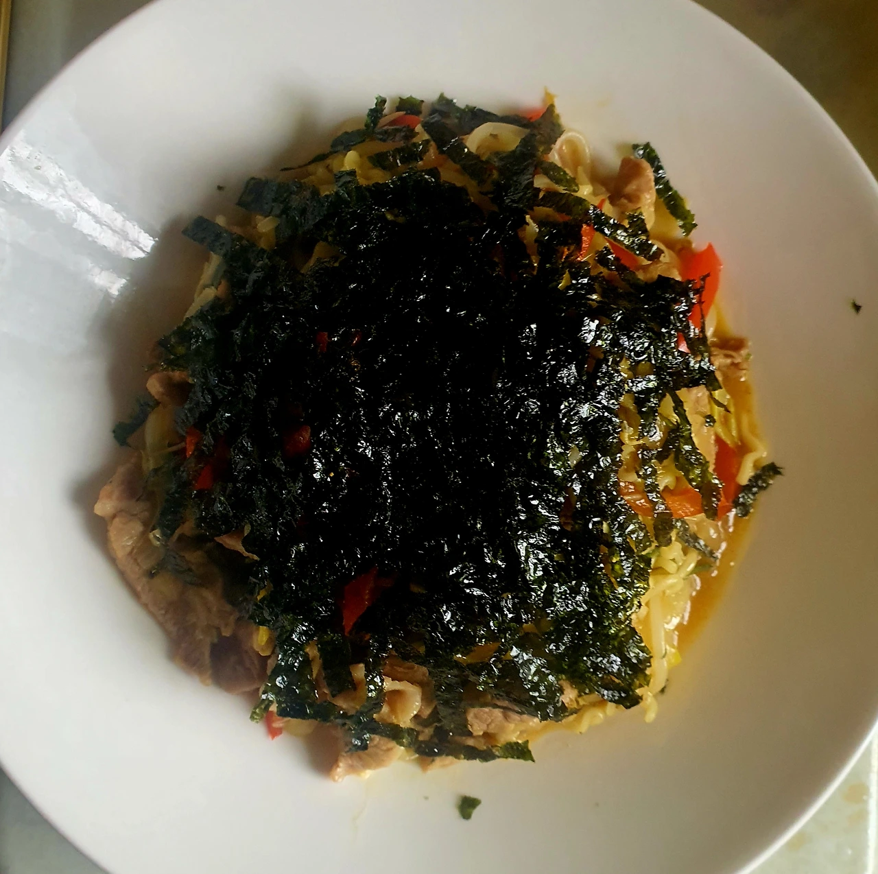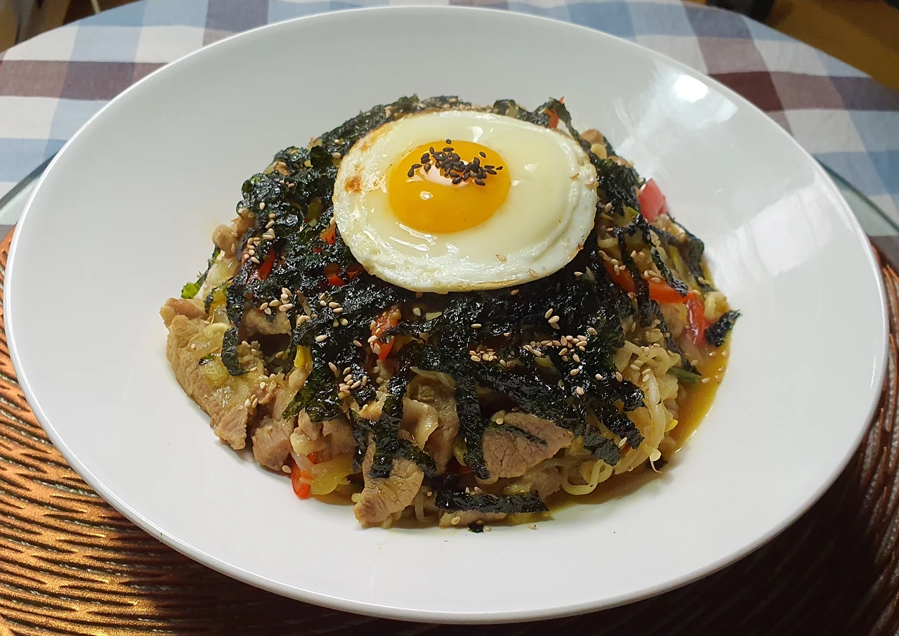 ■ 재료 : 사리라면 1½개. 돼지고기 300g. 양파 ½개. 대파 ½대. 파프리카 ½개. 청양고추 1개. 숙주나물 1컵. 달걀 1개. 김가루 조금. 통깨