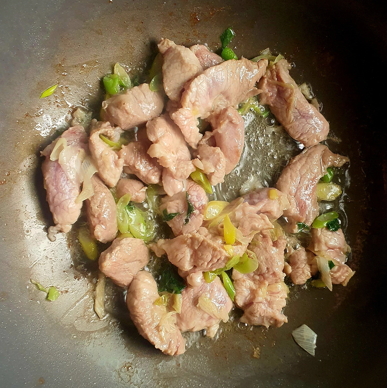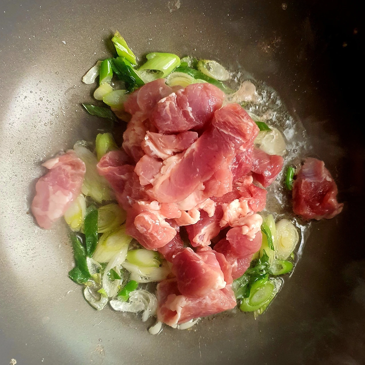 • 파향이 올라오면 돼지고기를 넣고 볶아준다.