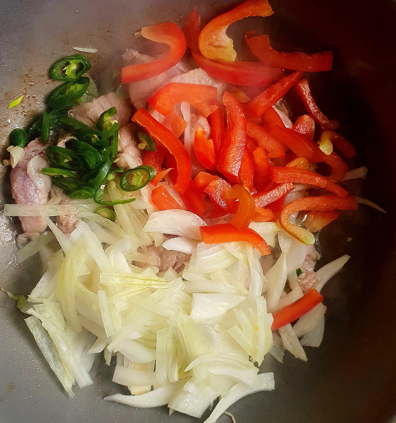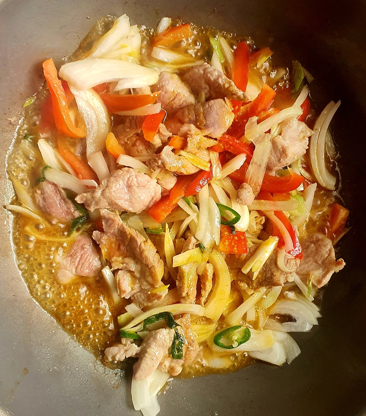 • 고기가 익으면 양파. 파프리카. 청양고추와 양념장을 넣고 볶아준다.