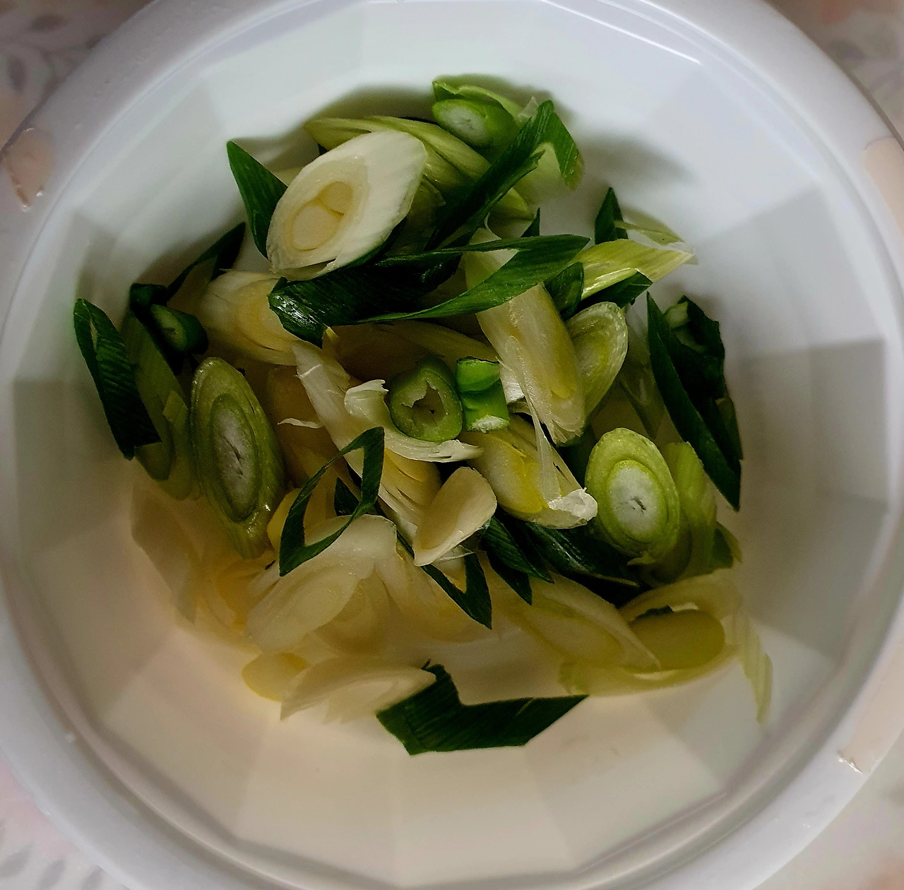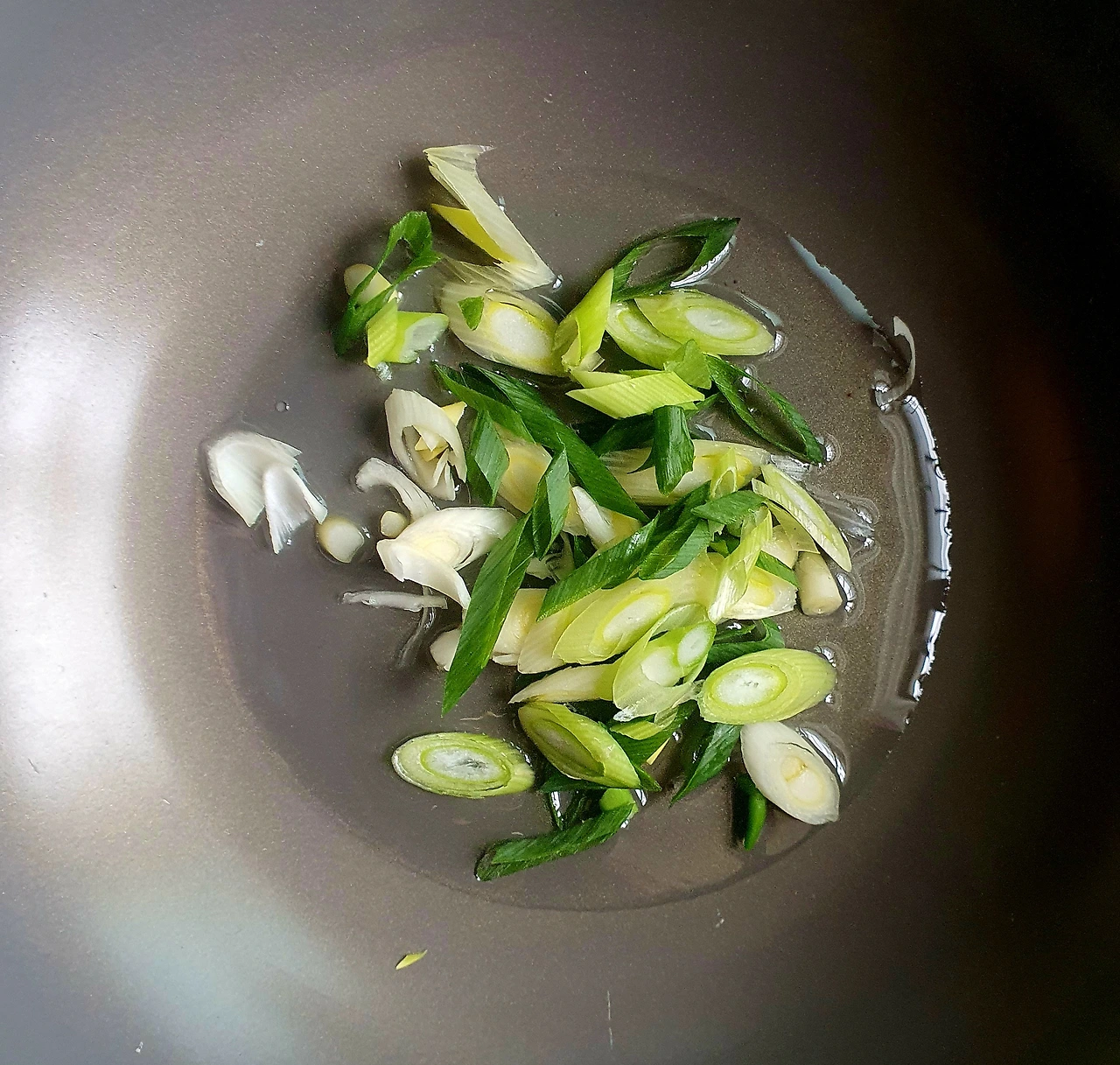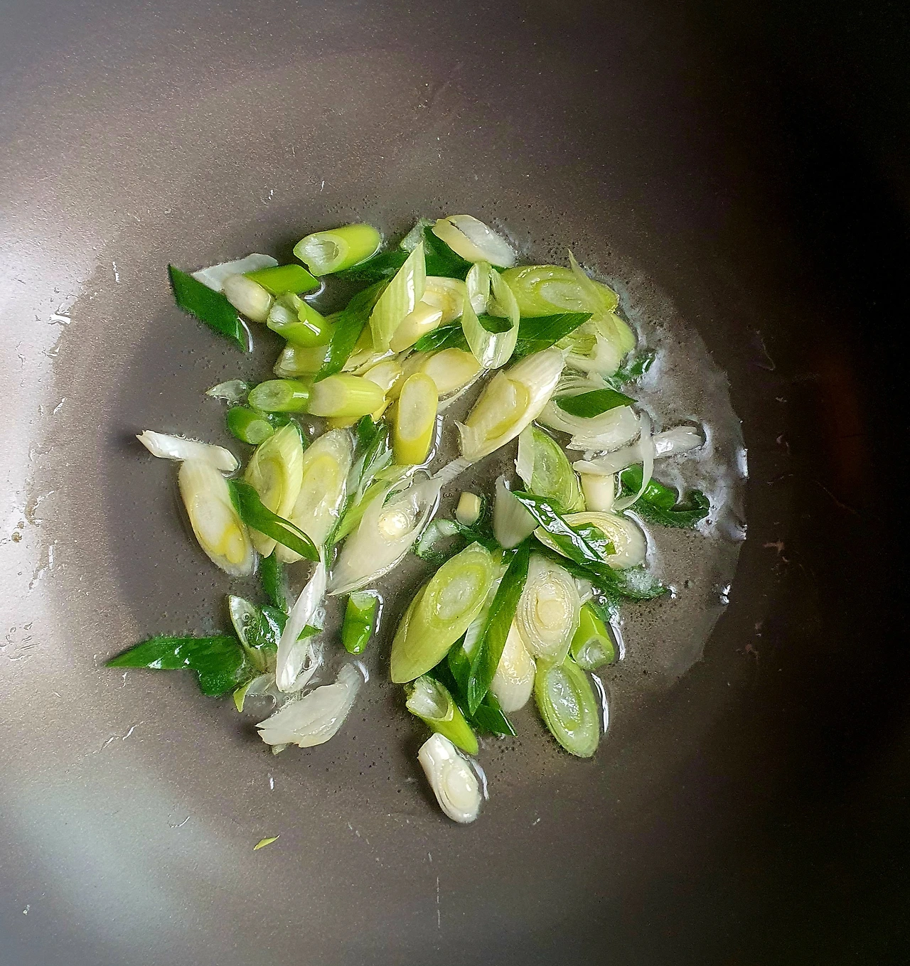 • 달군 팬에 기름을 넉넉히 두르고 파를 넣고 파기름을 내준다.