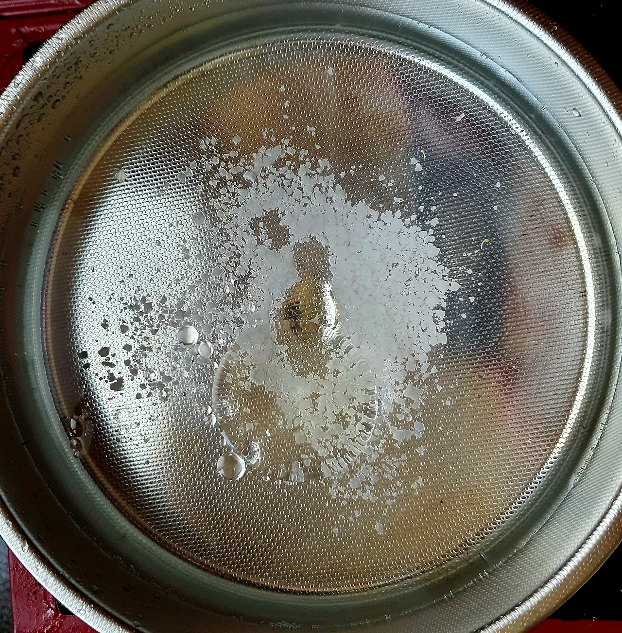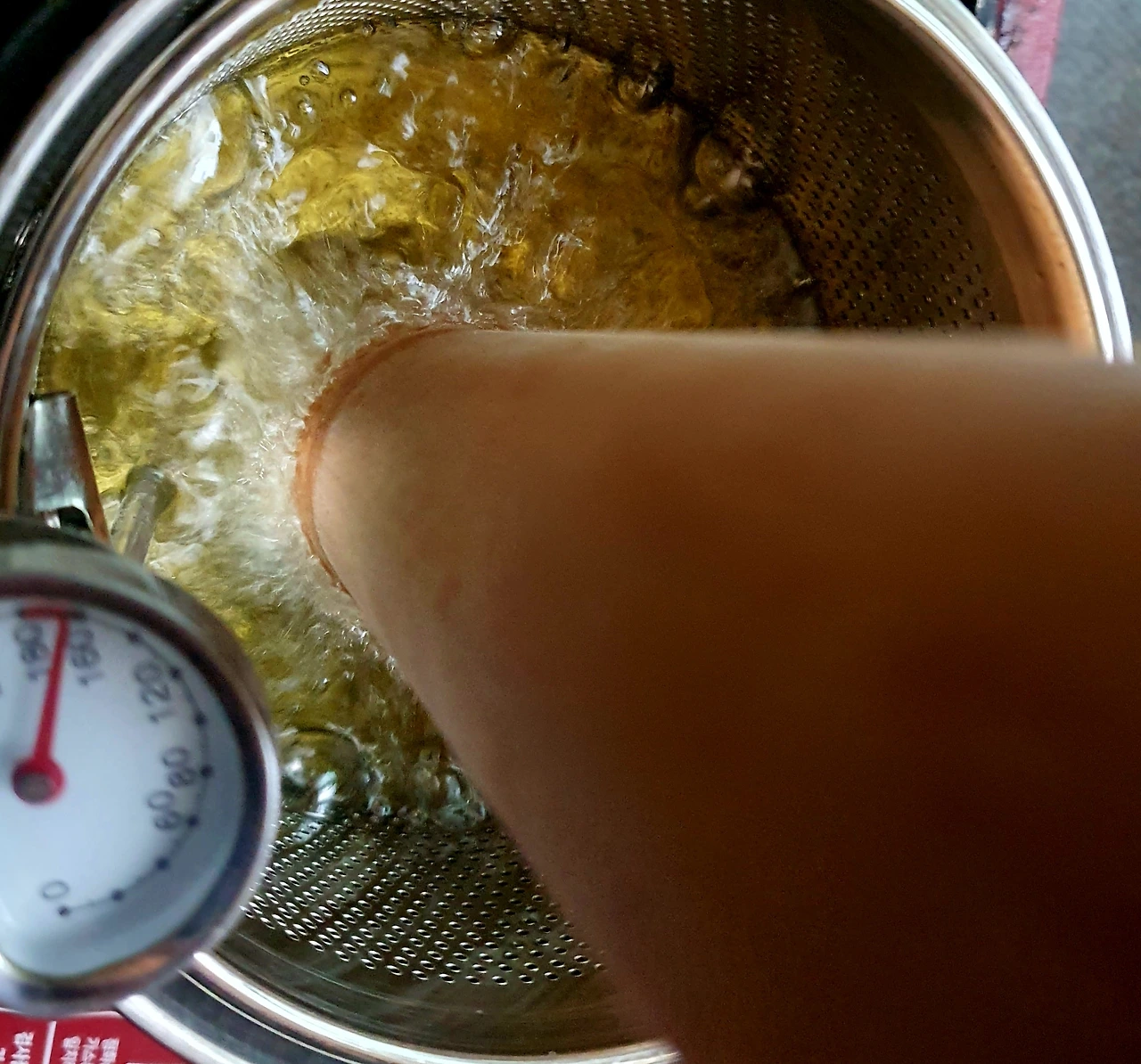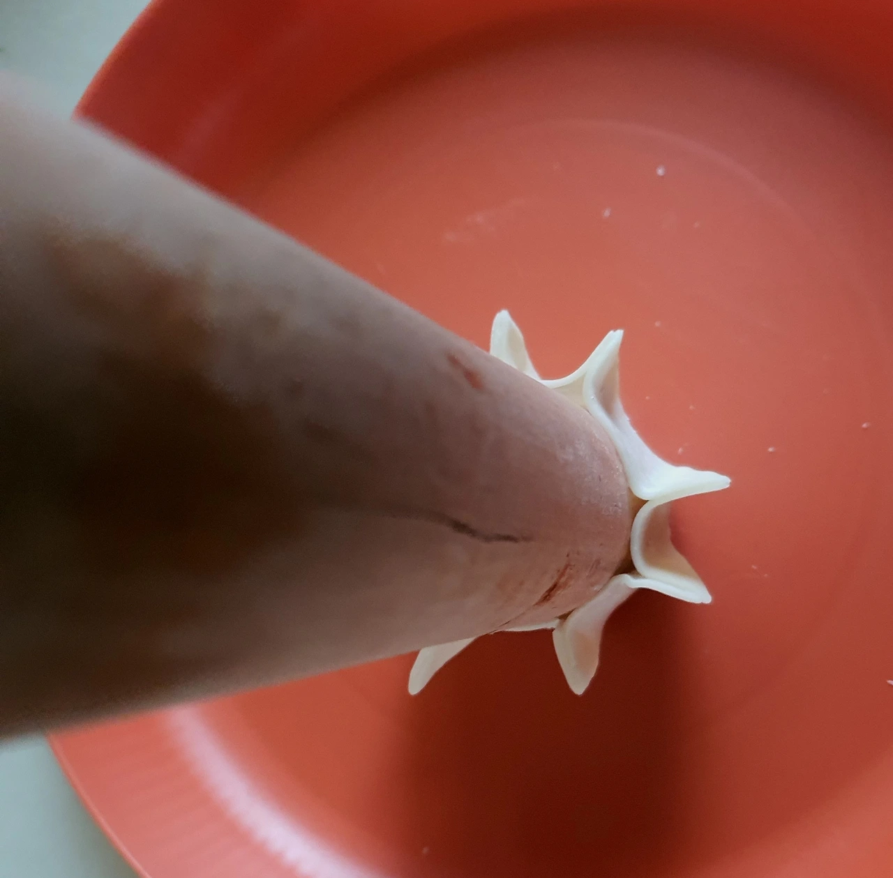 • 기름이 준비가 되면 칼국수 밀대 모소리에 만두피를 감싸서 기름에 넣고 튀겨주며 모양을 잡아준다.
